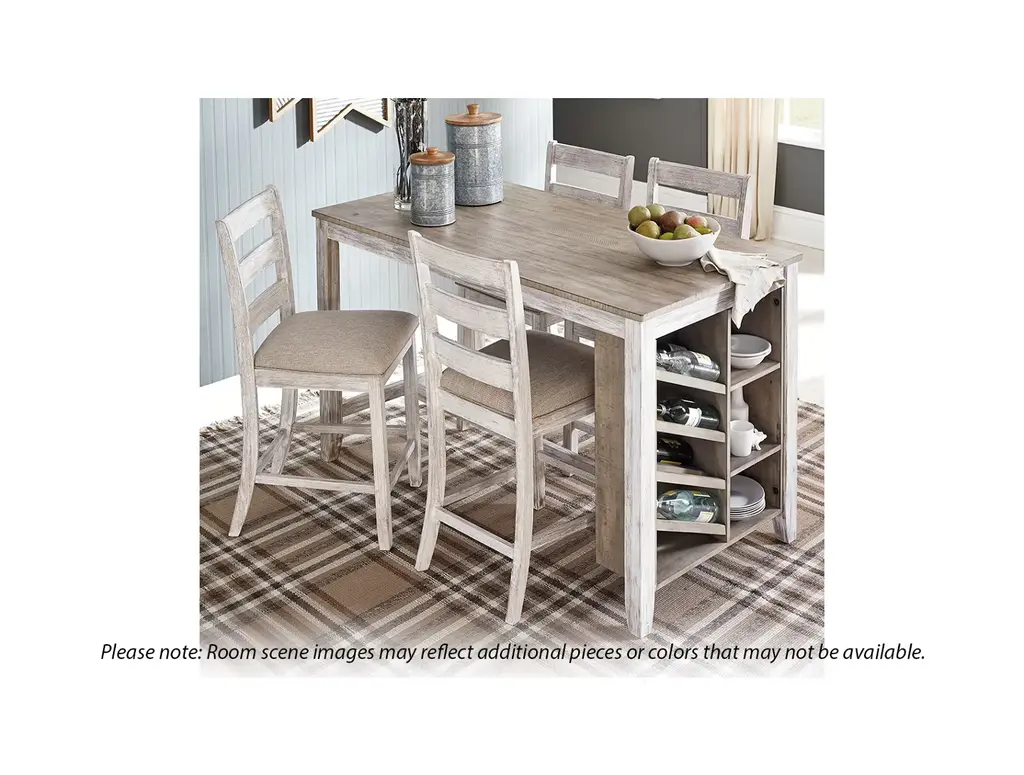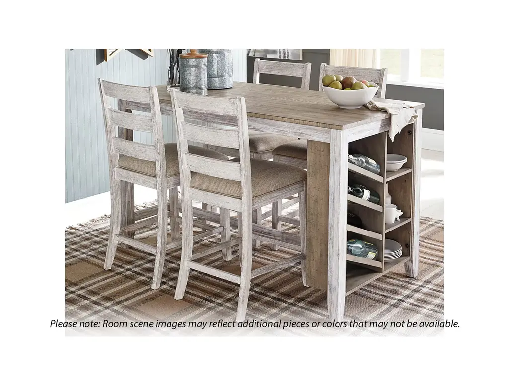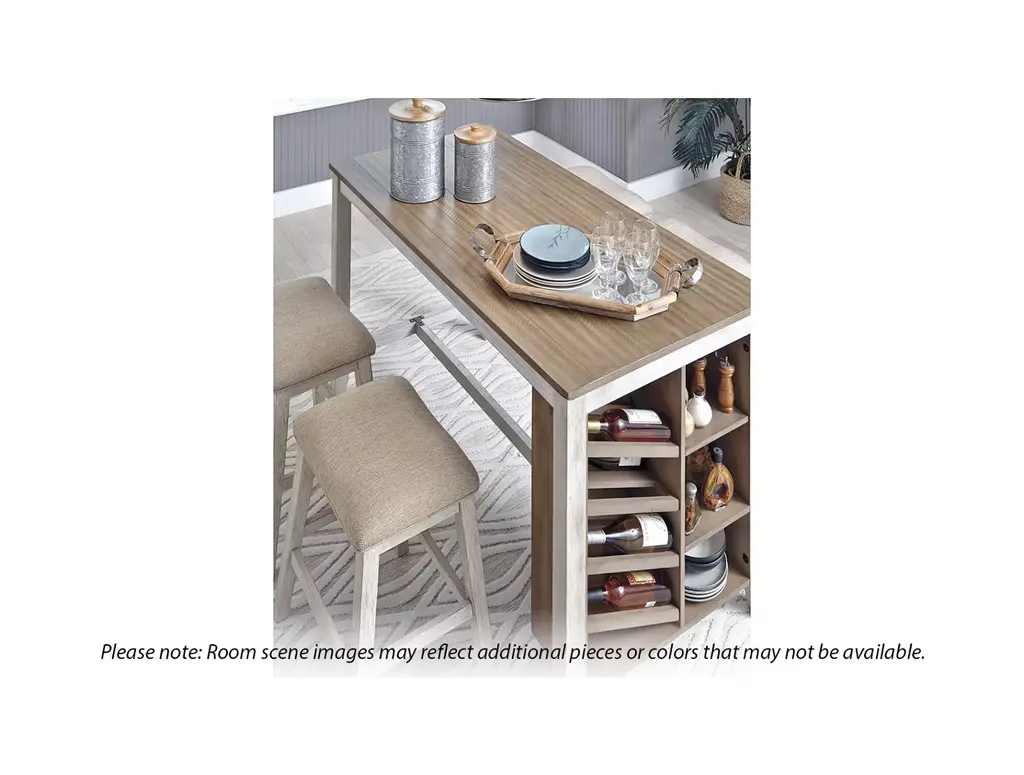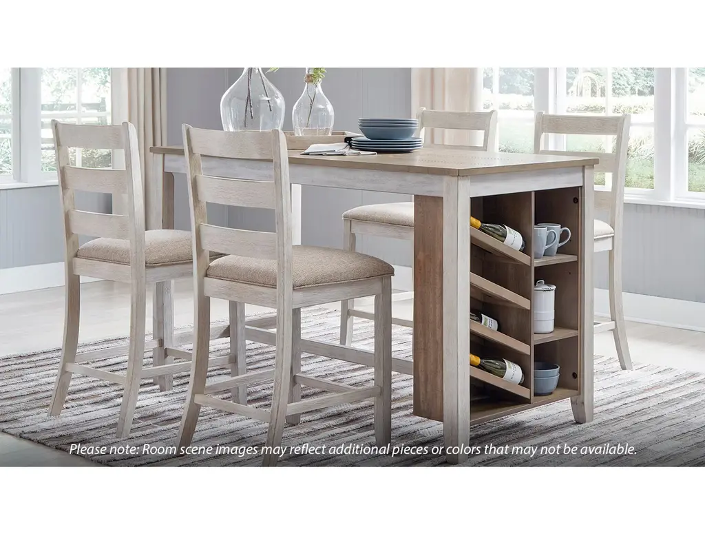 Expertly crafted with a farmhouse-style two-tone finish, the Ashley Skempton Counter Height Rectangular Table is a creative storage piece that blends relaxed comfort with rustic style. This rectangular dining table features a built-in wine rack, and shelves for cookbooks or display items. A trestle base, and square tapered legs complete the look.