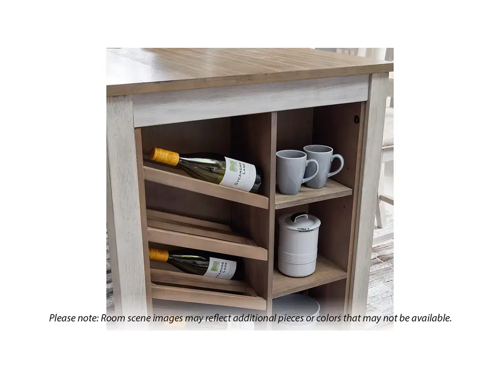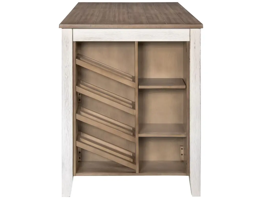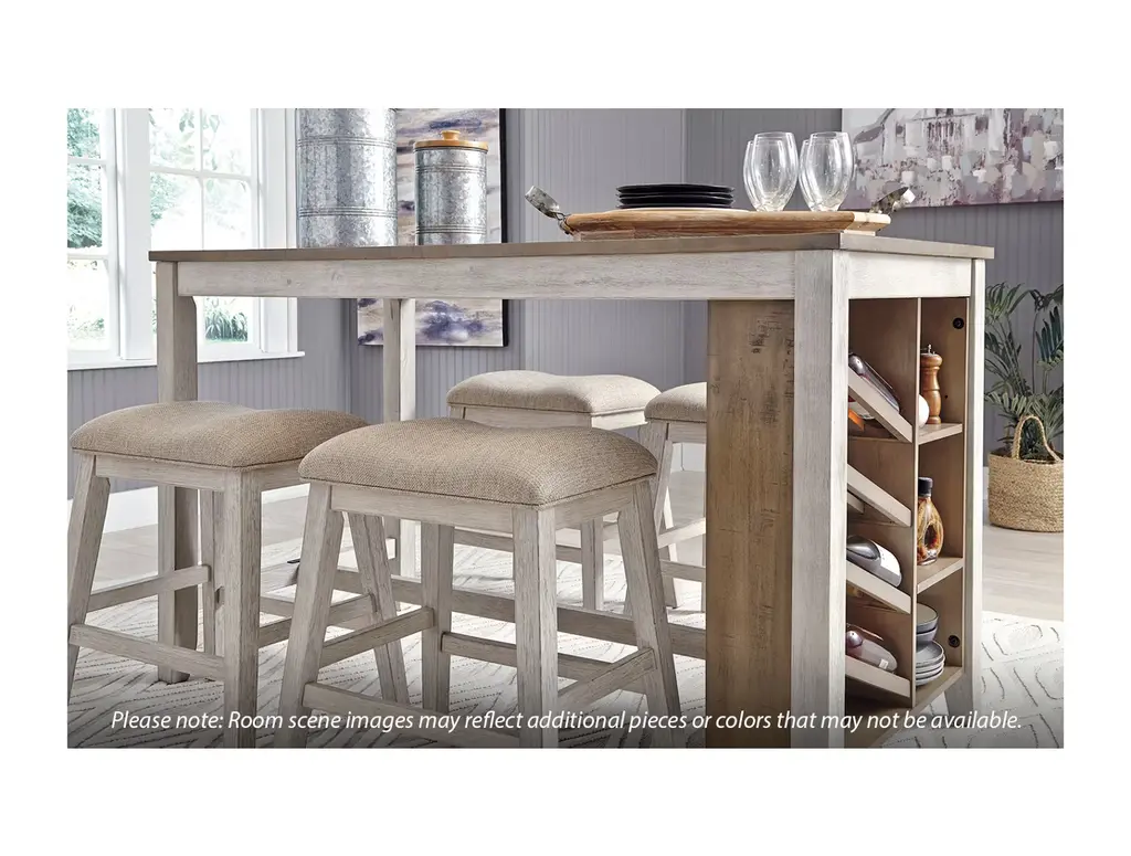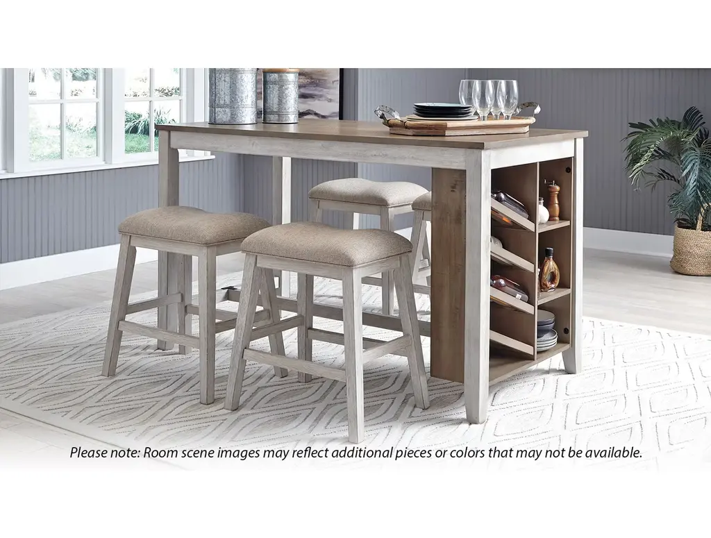 Expertly crafted with a farmhouse-style two-tone finish, the Ashley Skempton Counter Height Rectangular Table is a creative storage piece that blends relaxed comfort with rustic style. This rectangular dining table features a built-in wine rack, and shelves for cookbooks or display items. A trestle base, and square tapered legs complete the look.