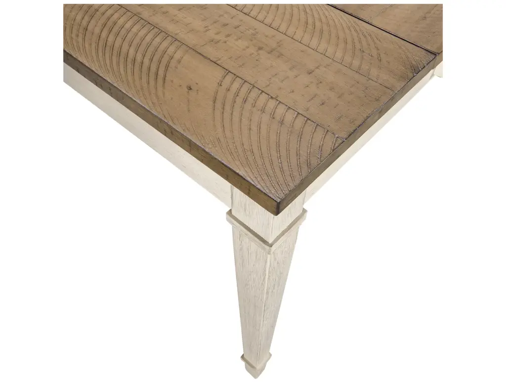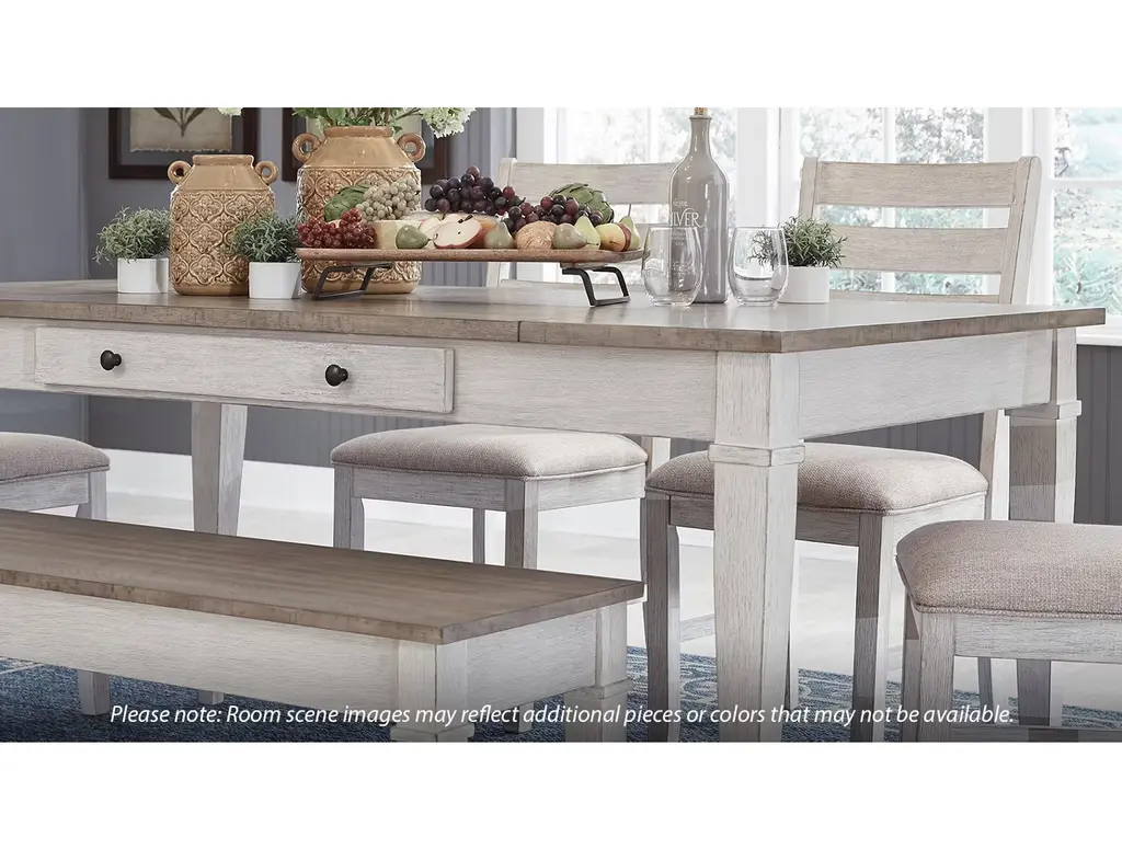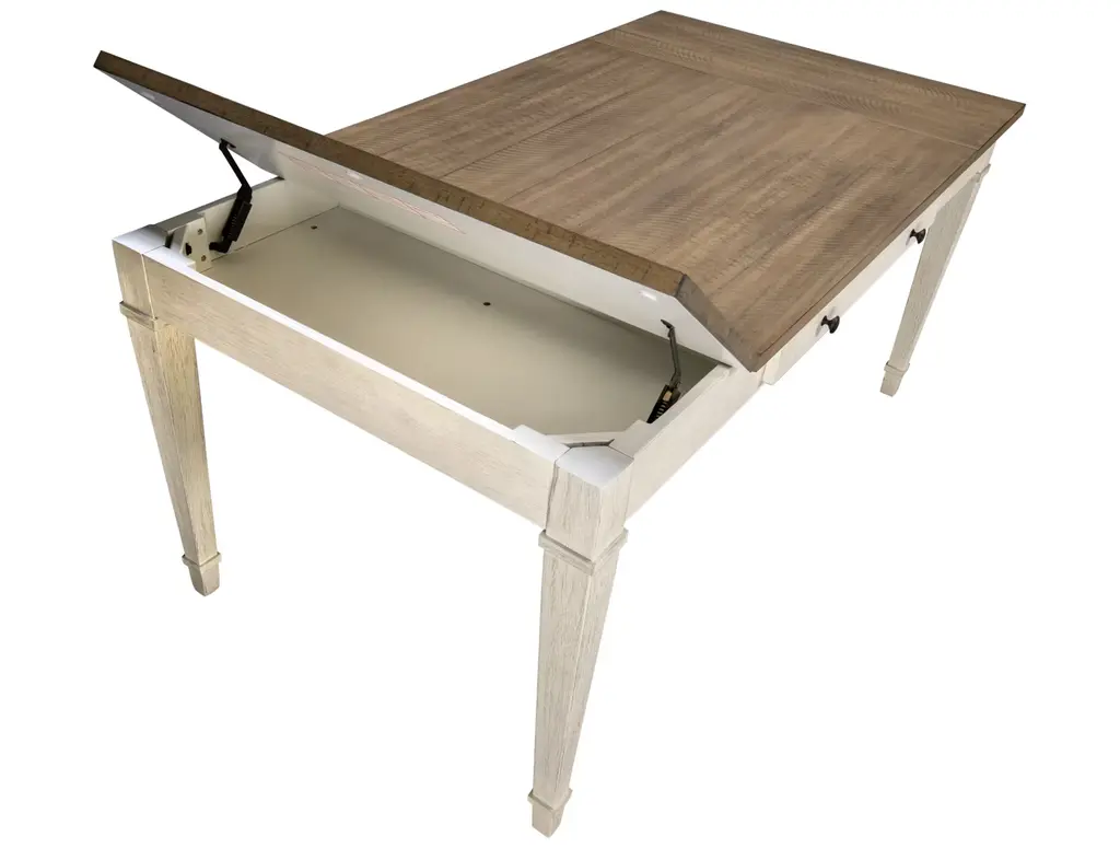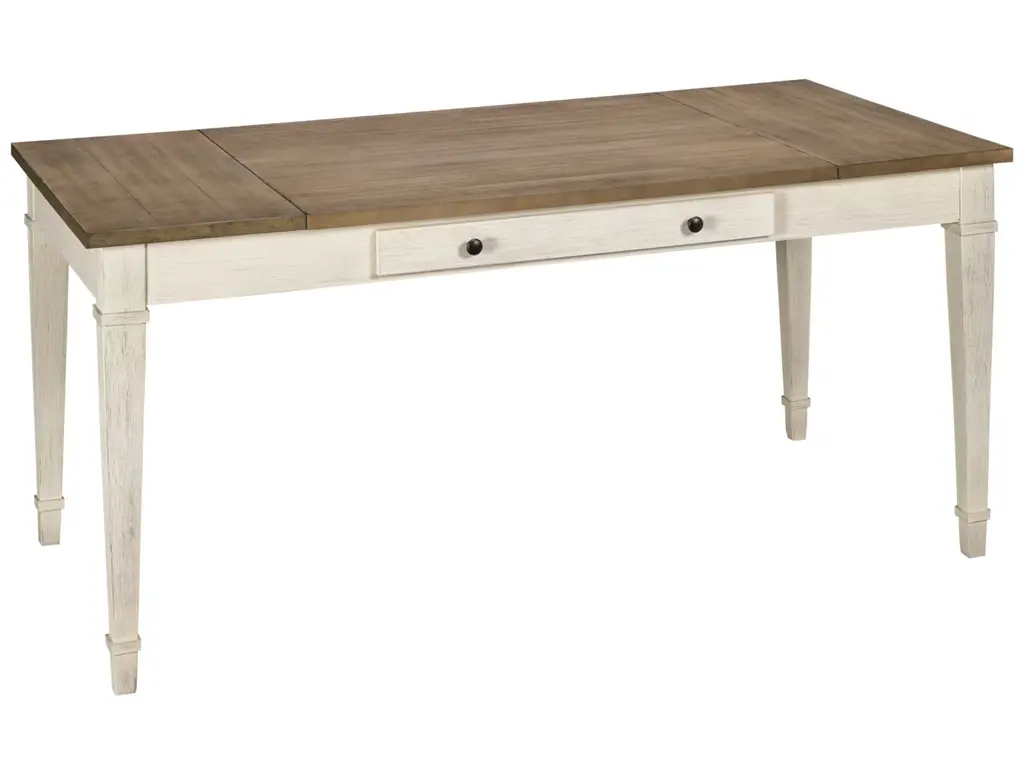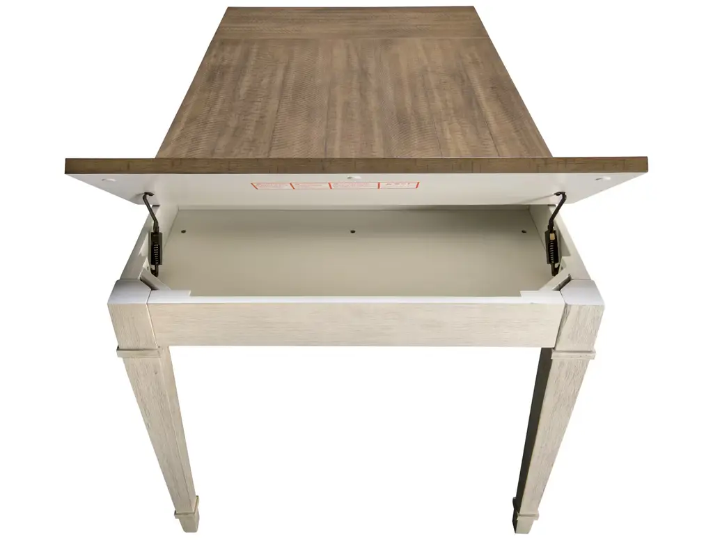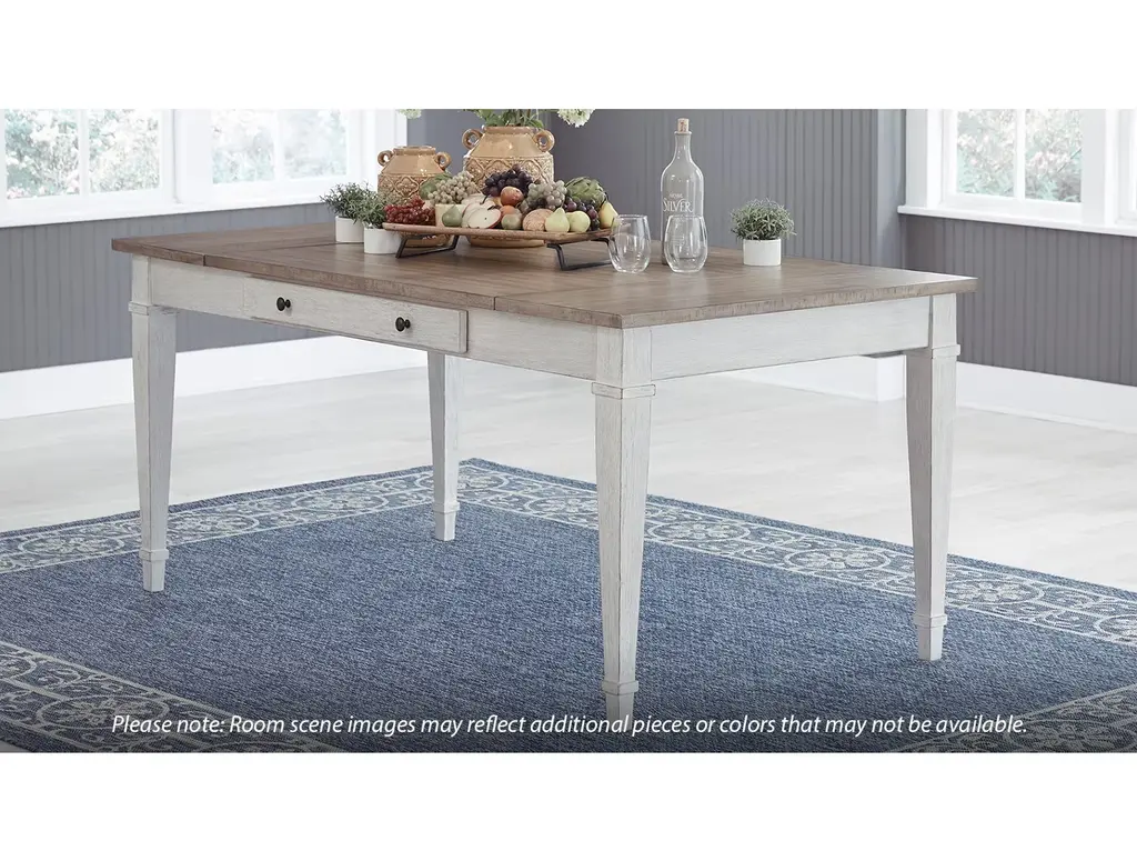 Bring modern farmhouse style and function to your dining space with the Ashley Skempton Rectangular Table. This two-tone dining table features a light brown top that lifts up on both ends for inside storage. There are two slim drawers on either side for storing silverware and other essentials. The tapered molded legs in white give it a beautiful contemporary twist.