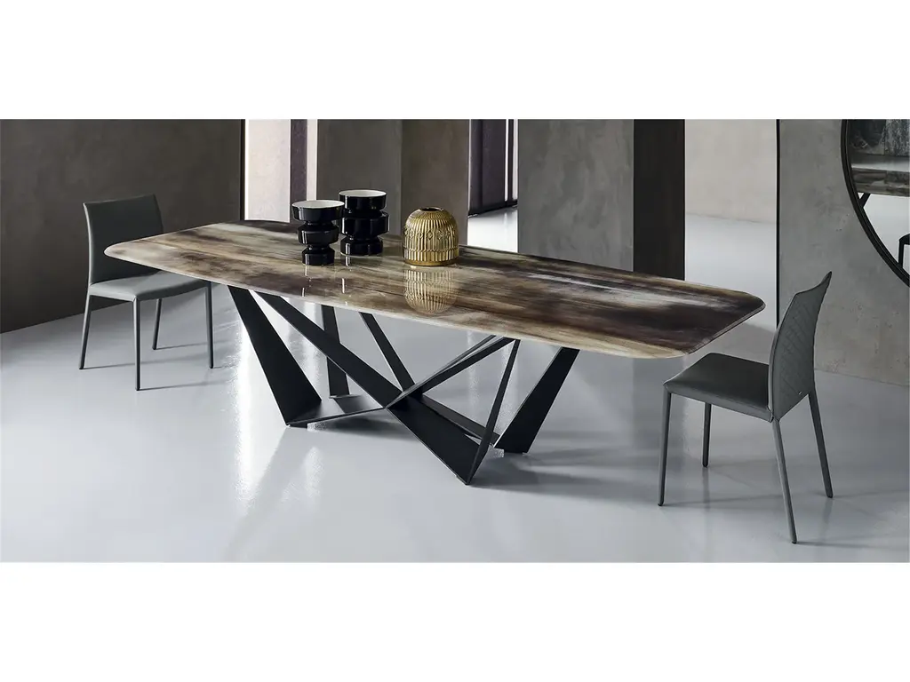 Designed by the talented Paolo Cattelan for Cattelan Italia, the Skorpio CrystalArt dining table makes a grand impression in a modern dining room. The geometrically inspired base is full of sculptural appeal and makes the table both beautiful and supportive. With ample space on the luxurious top, it provides plenty of room to eat and gather around for dinner parties and holidays. The Skorpio CrystalArt dining table is made in Italy and comes with a high degree of customization. It is available in rectangular and barrel shapes in three sizes, and the top is finished in CrystalArt beveled glass. Choose between an array of metal options for the base.