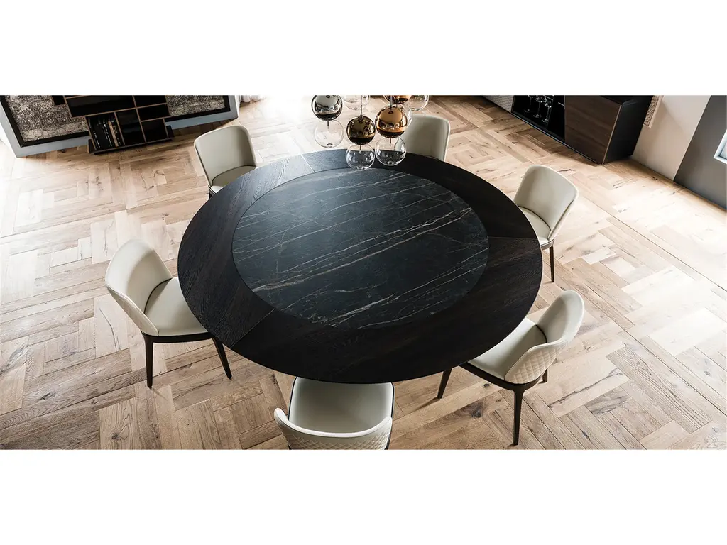The Skorpio Ker-Wood round dining table by Cattelan Italia is a solution of embracing forms and modern character. A true sculpture with a memorable silhouette that conveys lightness, the dining table is full of balance, symmetry, and undeniable elegance. With a combination of crisscross lines and sharp angles, the base is one-of-a-kind and makes a grand impression in the dining room. Three fixed versions are available, as well as two versions with a swiveling center that acts as a built-in lazy susan for a convenient element! Manufactured in Italy, the Skorpio Ker-Wood round table comes with a high degree of customization. It features a wooden trim in various finishes while the center is finished in an array of ceramic options. A multitude of metal finishes is available for the sculptural base.