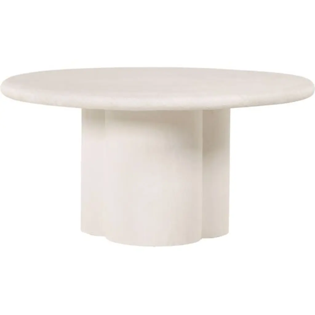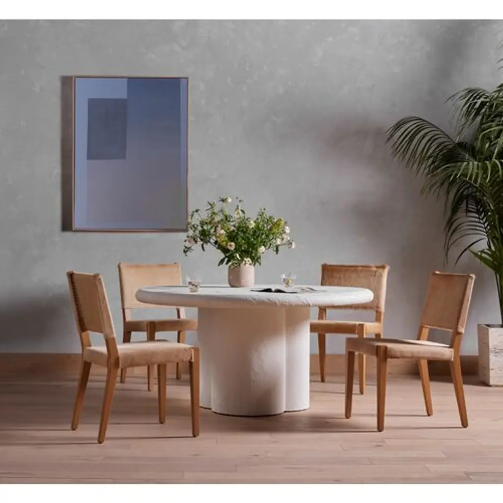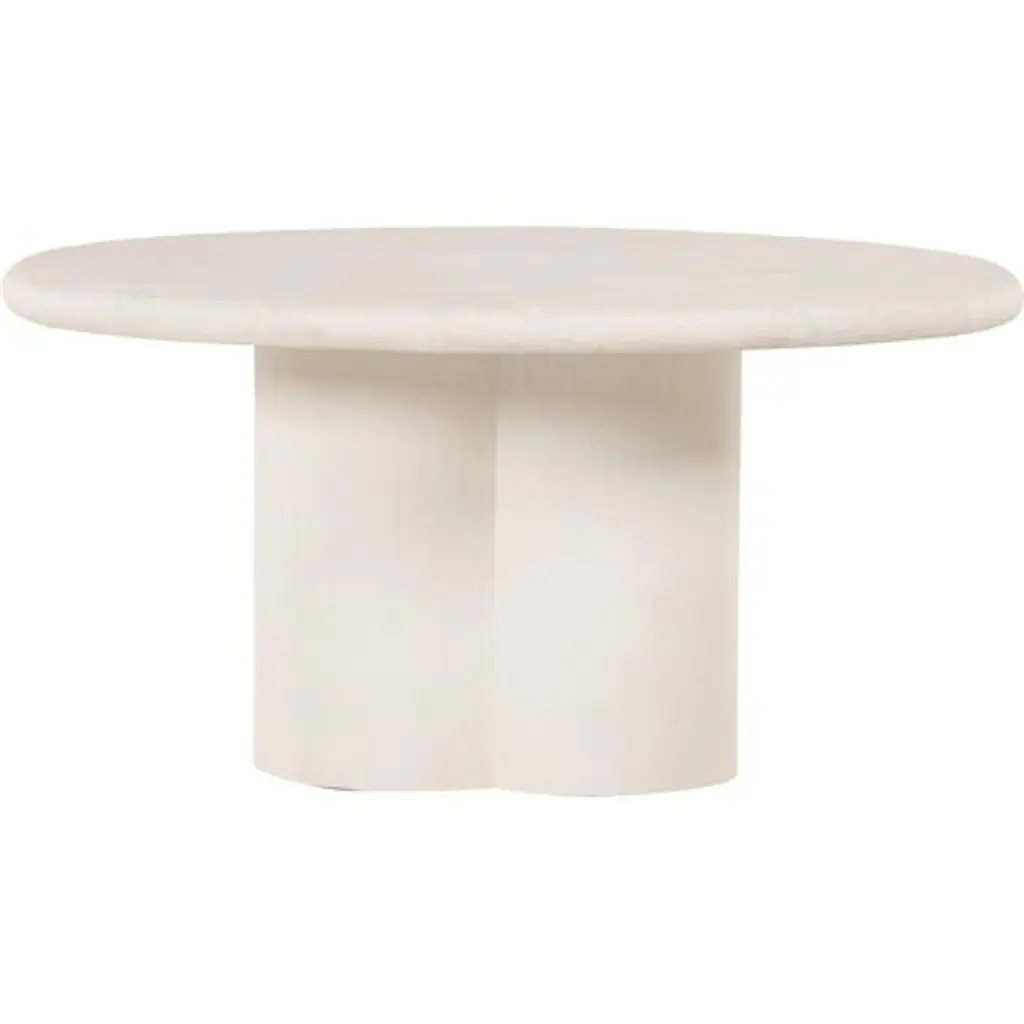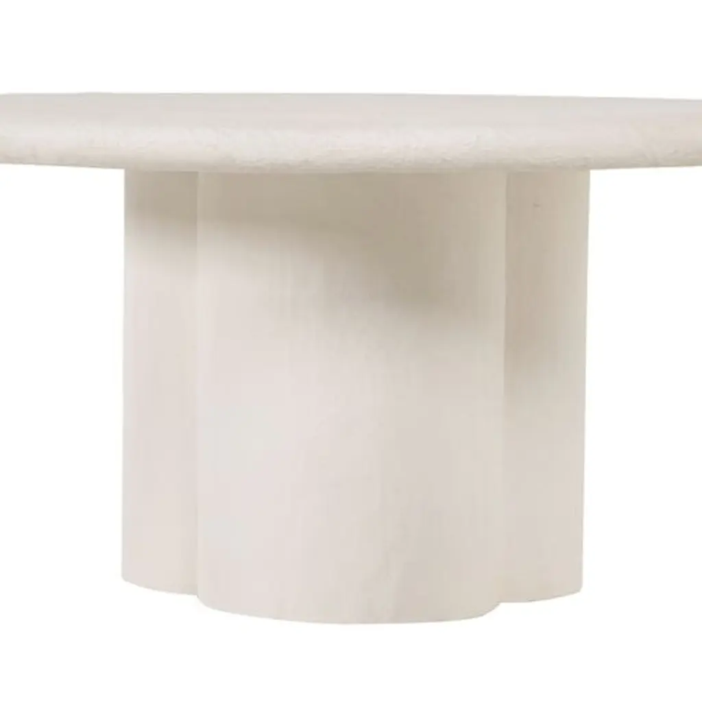 Crisp, clean adobe vibes. Made from white-finished concrete, a voluminous clover-shaped base supports a thick-rounded tabletop for dramatic scale. Soft yet textured look pairs with a wide range of seating, from natural woods to leather, and more.