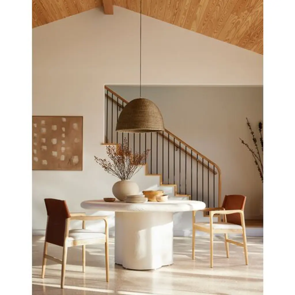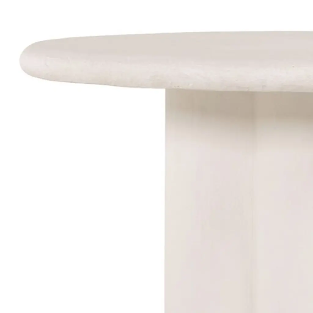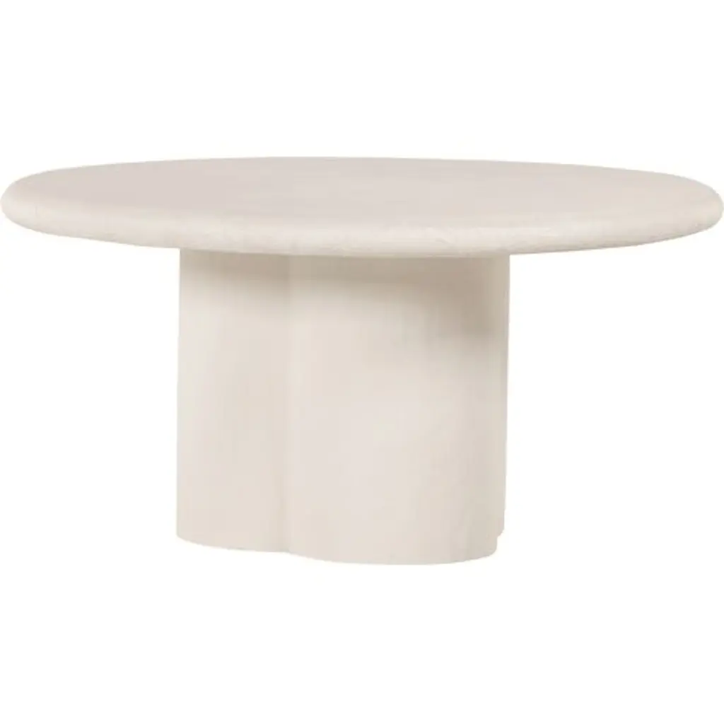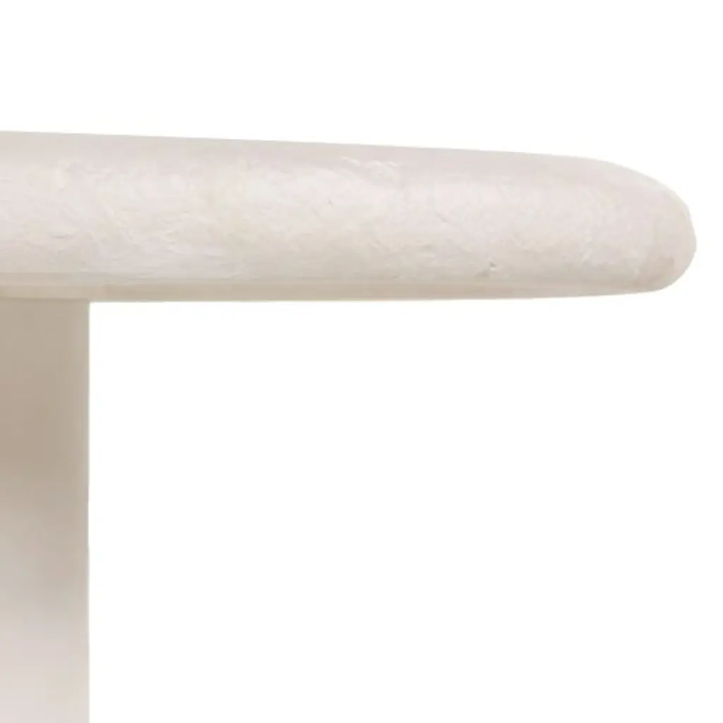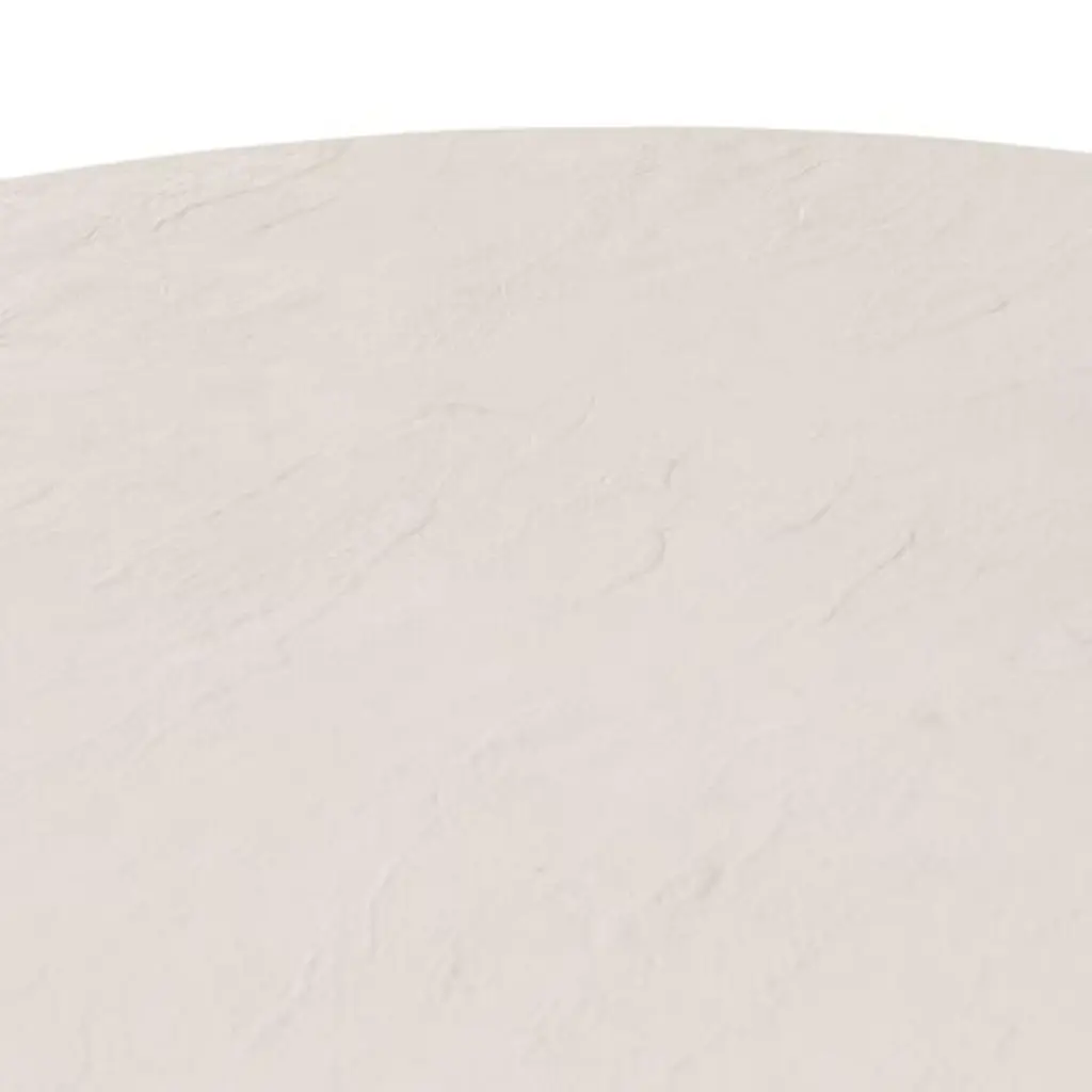 Crisp, clean adobe vibes. Made from white-finished concrete, a voluminous clover-shaped base supports a thick-rounded tabletop for dramatic scale. Soft yet textured look pairs with a wide range of seating, from natural woods to leather, and more.