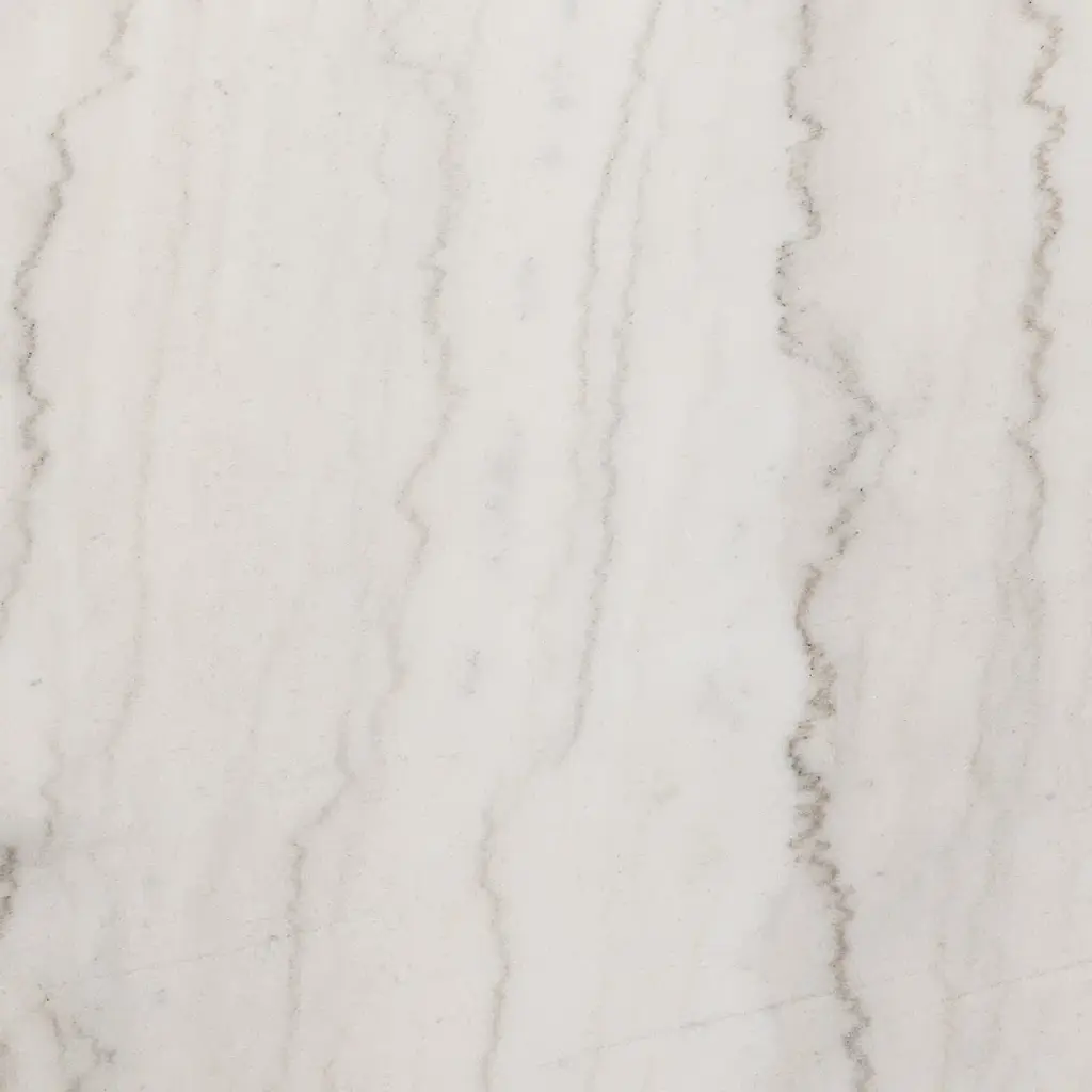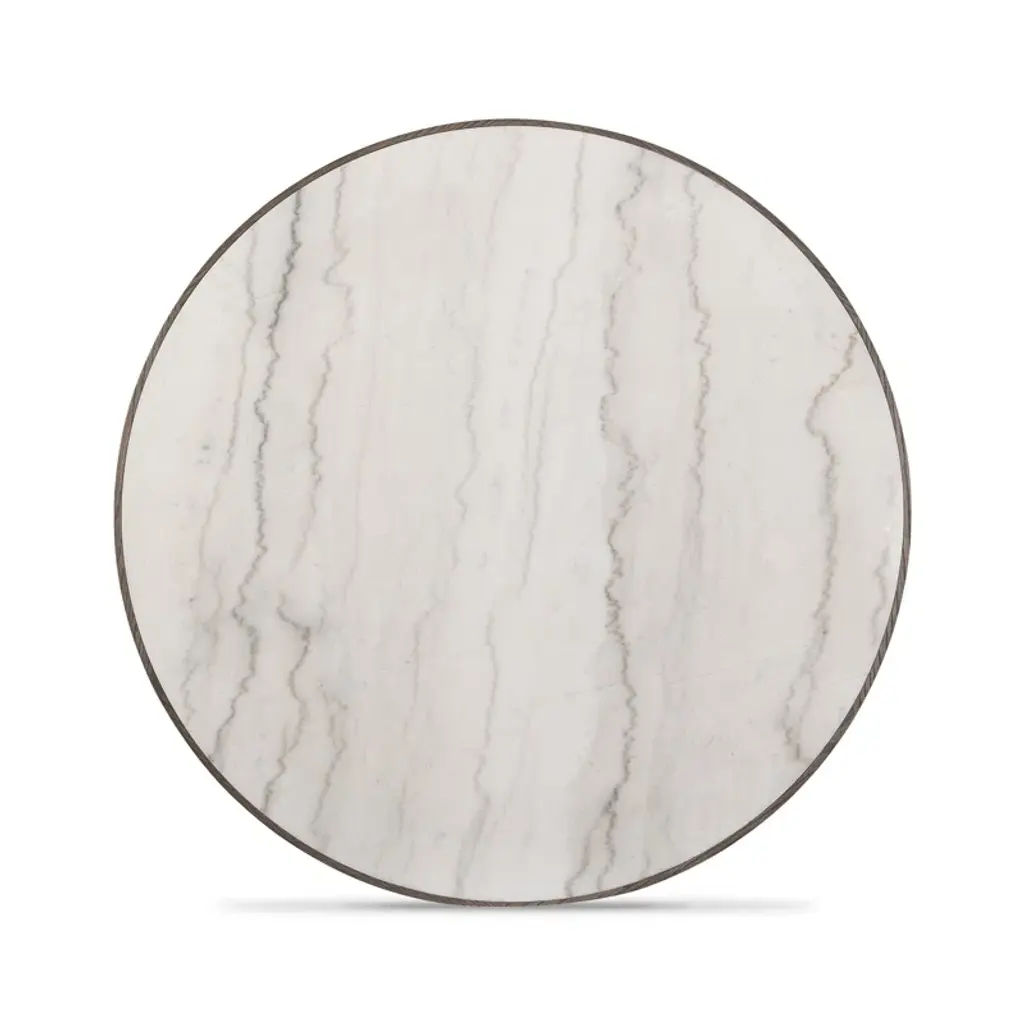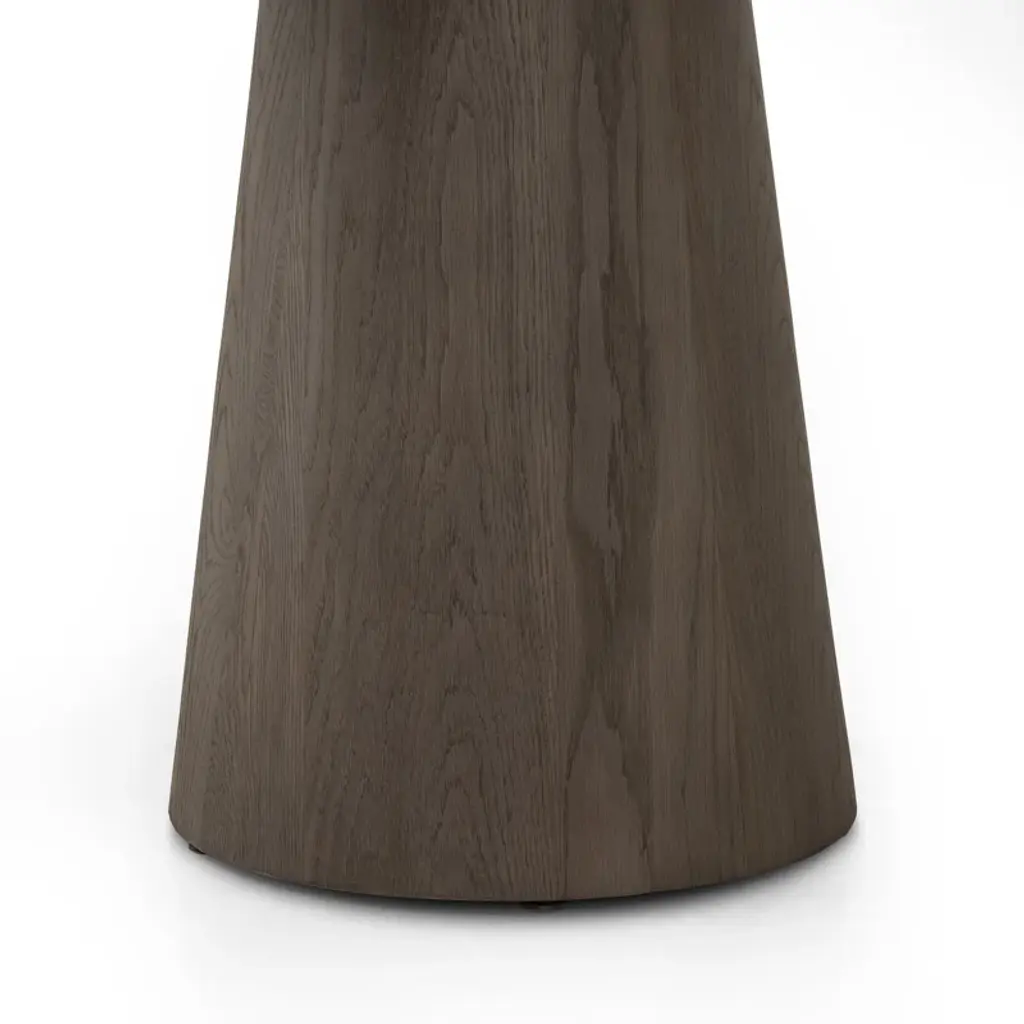 Mixed materials make for great drama. A cone-tapered base of dark, weathered oak supports a rounded tabletop of white-finished solid marble, with oak banding on the edges for thoughtful contrast.