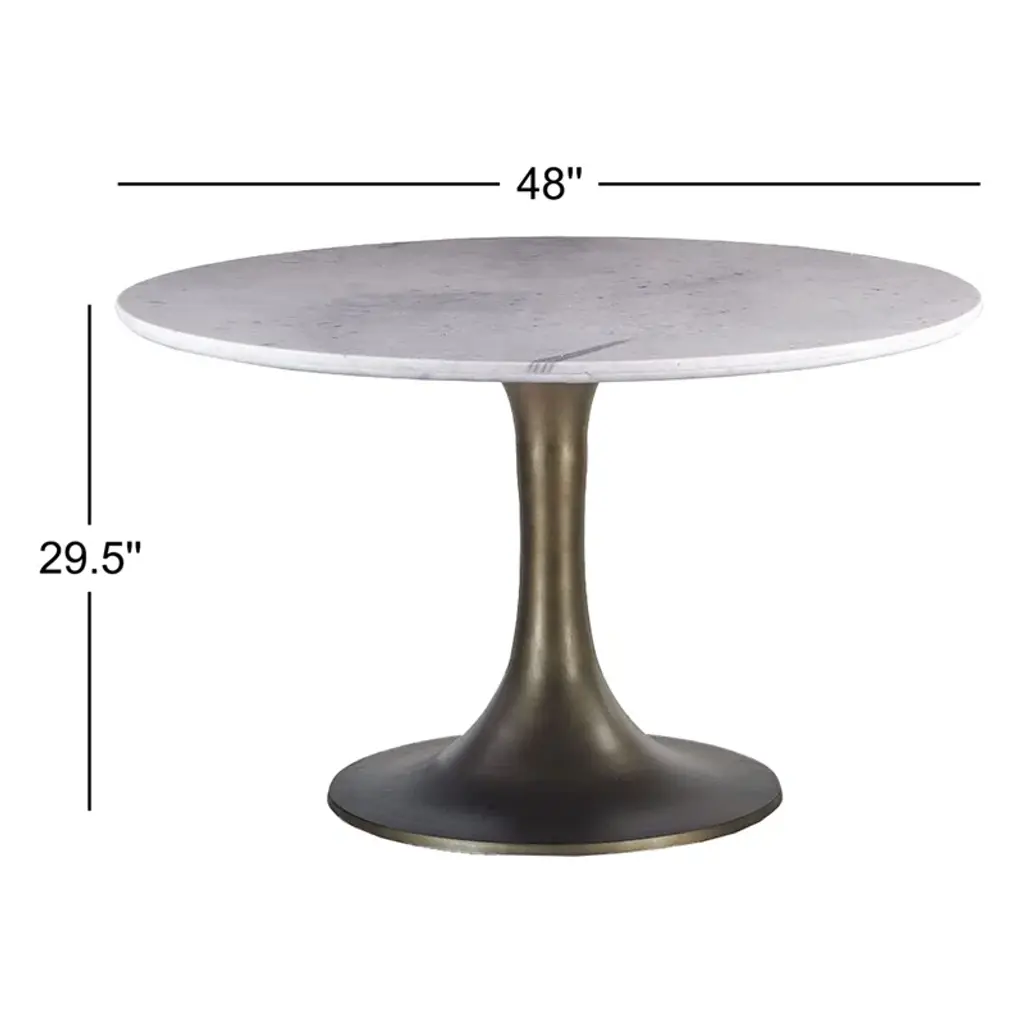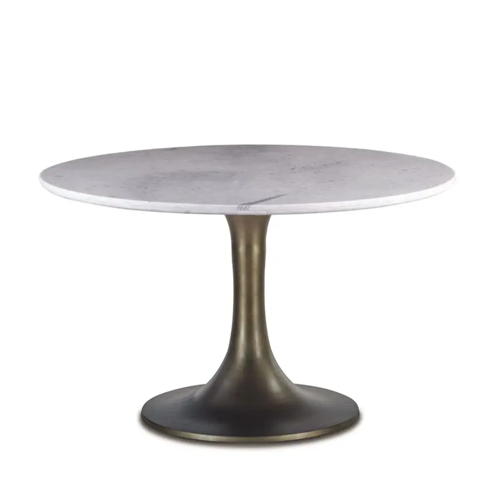 A simple, sculptural dining table. Soft curves define the movement in the silhouette and veining of marble, accented by various shades in this natural material.
