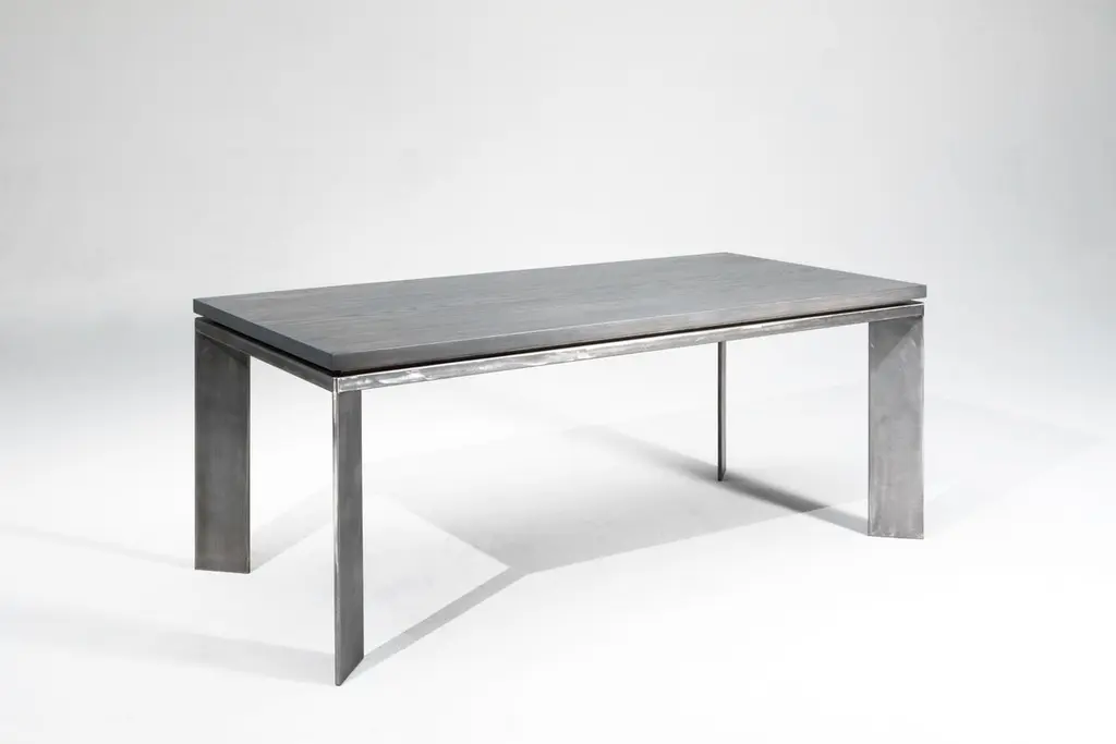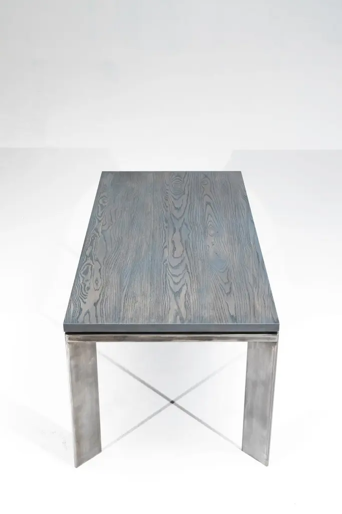 The Charlevoix has a very clean and simple design. It has a solid ash top finished in slate gray to go along with the brushed steel base. The solid top is elevated above the base slightly to create a floating effect and add to the modern design of the piece. This is a made to order item &Custom sizing and materials options are available upon request.