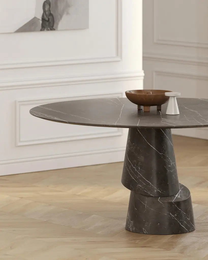 Awarded as the best residential table design of the 2021 by Interior Design Magazine, Slice table is the expression of a simple but incisive geometric operation that challenges the force of gravity and our perception of equilibrium.The monolithic support is sliced by a neat oblique cut in two portions that, sliding on each other, trigger a sense of tension in the surrounding environment and in our perception of the space we live in.Slice takes shape from the synergy between mass and gravity, stability and movement, heaviness and lightness. The result is a destabilizing elegance on the brink of collapse.The moment we accept the change as part of our experience, the tension becomes relaxation.The base of Slice is crafted from a monolithic block and can be executed in a wide spectrum of natural stones and finishes. The tabletop is custom-made and can be fabricated in several diameters and shapes, with the possibility of using stones different from the base.Slice table is 100% crafted on-demand in Italy.