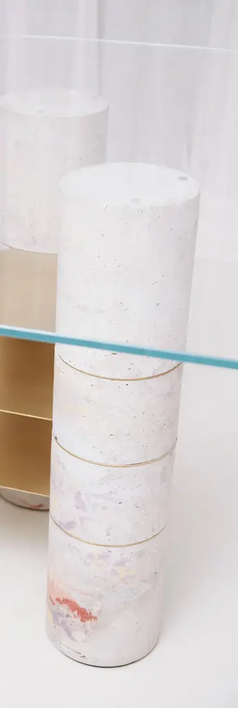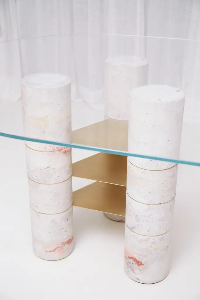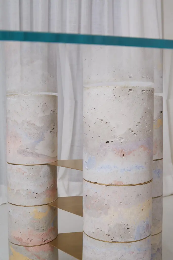 Slices Dining Table by Patricia Bustos de la TorreDimensions: D 90 x W 90 x H 75 cm.Materials: Concrete, glass and brass.Slices dining table’s versatility can be expressed in two ways, either with a glass round table top held by one set of 3 legs or with a glass oval table top held by two sets of the same legs. Each group of Rainbow like legs is held together and structured by brushed brass sheets. Every leg is composed of dyed concrete circular blocks, piled over and fixed tp each other on their inside with an iron rod. Slices dinning table is not only an expression of amplitude, comodity and stability, but it’s refined geometrical design can make anyone fall in love at first sight.Patricia Bustos is an internationally renowned Spanish artist known for her work designing utopian pieces and spaces. Her creative gaze becomes an act of rebellion and her projects are full of a disruptive narratives that evolves with social trends. Her work is imbued with deep meaning because of her endless curiosity for the human being and its concerns such philosophy, language, architecture, art and nature. Her objects are handcrafted and aim to become cult pieces. Her work seeks to evokeaesthetic emotion trough a unique story behind every design. That is why wonder is the cornerstone of her work. The indelible memory that inspires us eternally comes from wonder. Through a bold use of color and an unexpected combination of shapes and materials, she is looking for contrast. Her pieces are distinguished by translucent or reflective elements juxtaposed with handmade or raw materials. As a result, her proposal achieves an atypical and fascinating balance at the same time. In her own words: "The purest beauty lies at the boundary between craftsmanship and utopia".