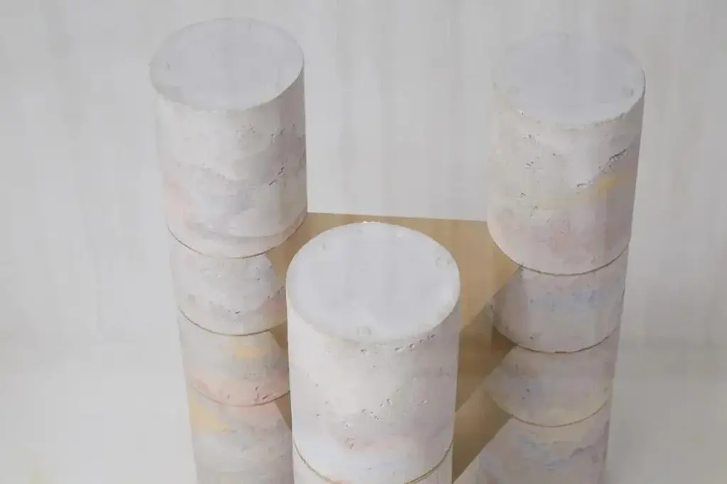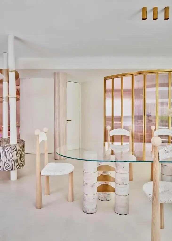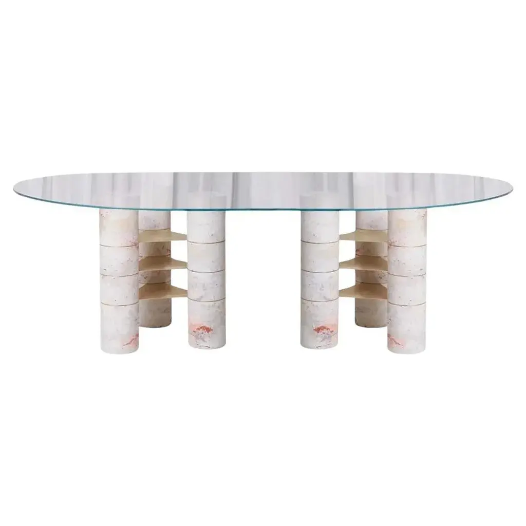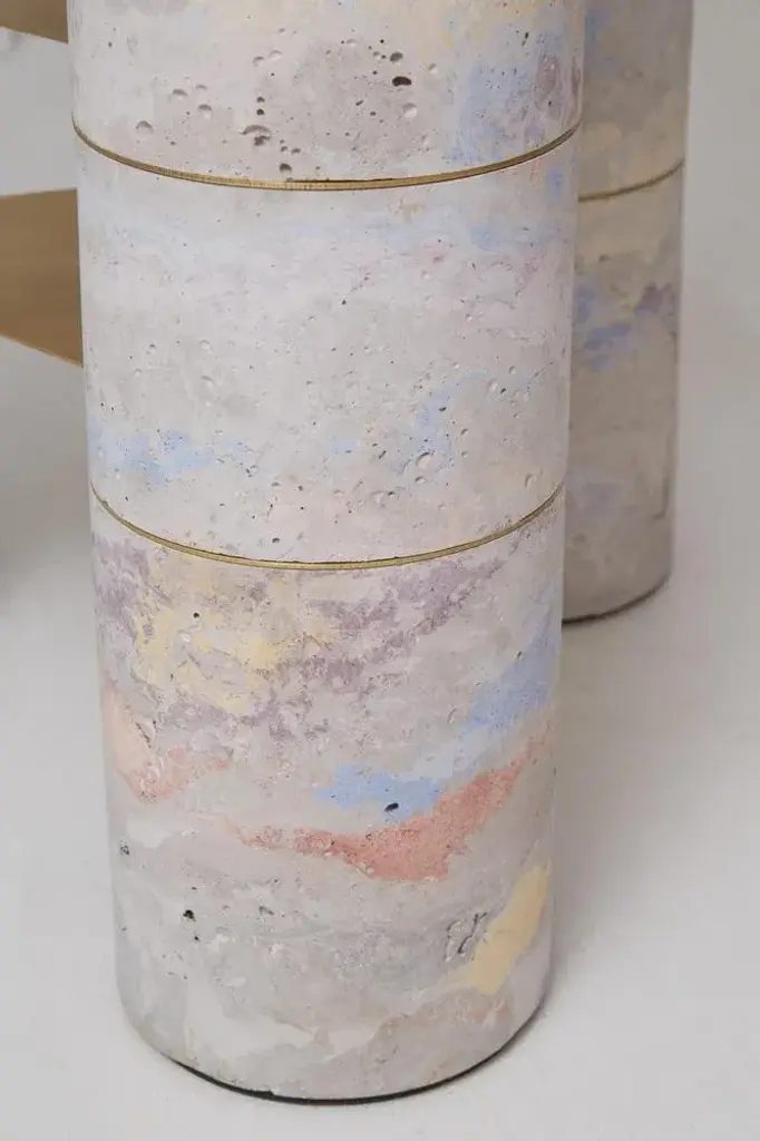 Slices xl dining table by patricia bustos de la torre dimensions: d 120 x w 234 x h 75 cm. Materials: concrete, glass and brass. Slices dining table’s versatility can be expressed in two ways, either with a glass round table top held by one set of 3 legs or with a glass oval table top held by two sets of the same legs. Each group of rainbow like legs is held together and structured by brushed brass sheets. Every leg is composed of dyed concrete circular blocks, piled over and fixed tp each other on their inside with an iron rod. Slices dinning table is not only an expression of amplitude, comodity and stability, but it’s refined geometrical design can make anyone fall in love at first sight.