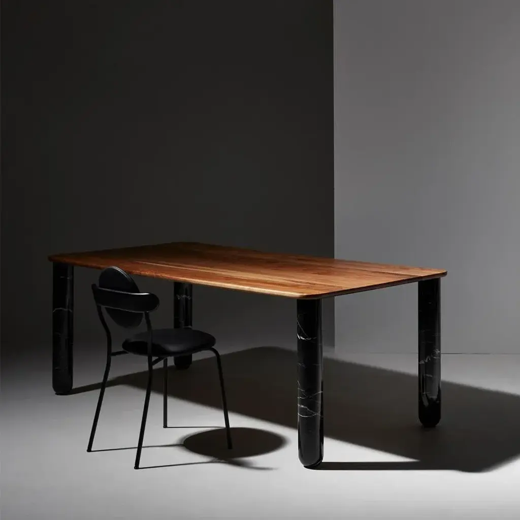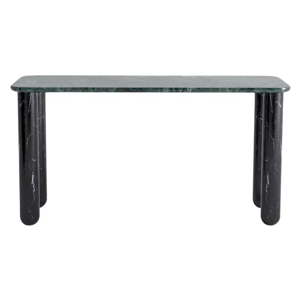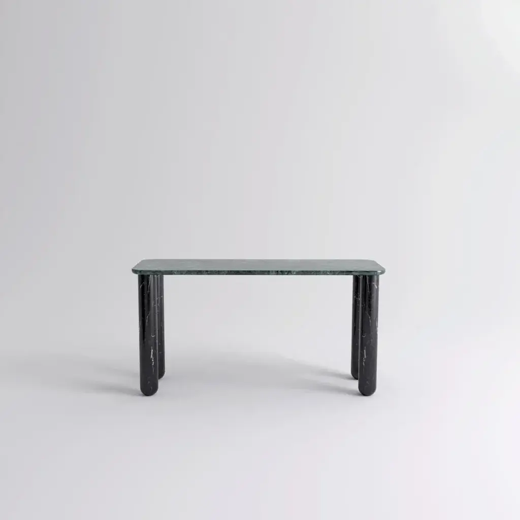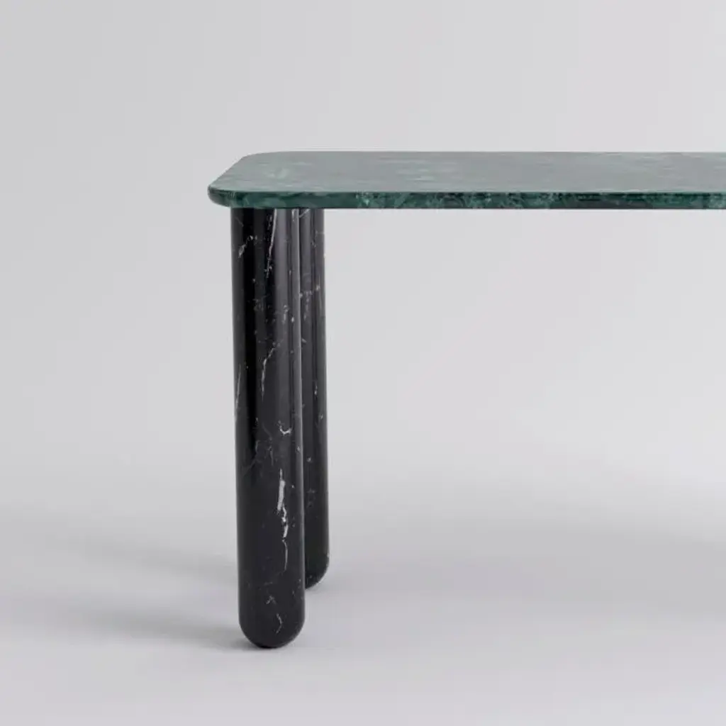 Small green and black marble "Sunday" dining table - Jean-Baptiste Souletie Dimensions: 150 W x 50 D x 74.5 H cm Materials: Black Marquina marble legs, Indian Green marble top. Different finishes and sizes are available. Sunday is a family of dinner tables, coffee tables and consoles with a simple and sculptural design. The mix of heavy marble legs and a thin solid wood top creates an interesting contrast while the rounded edges and generous proportions provide a comforting feeling.