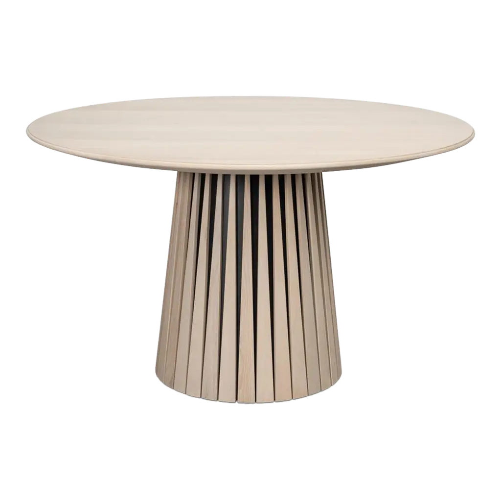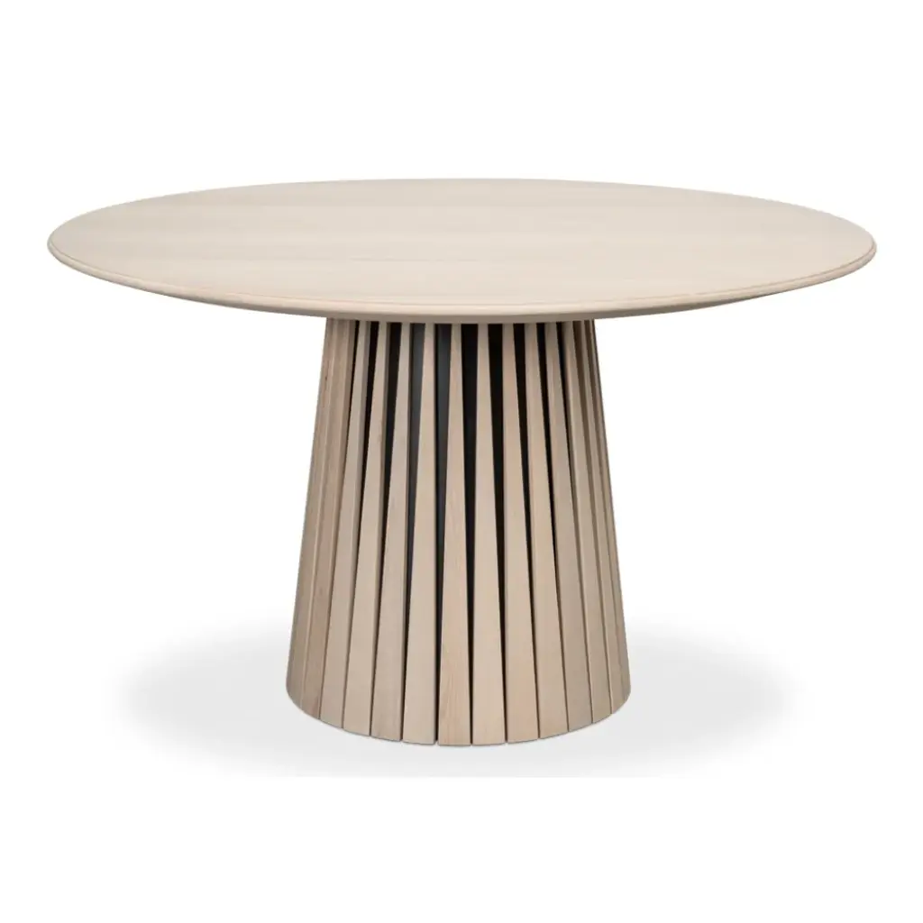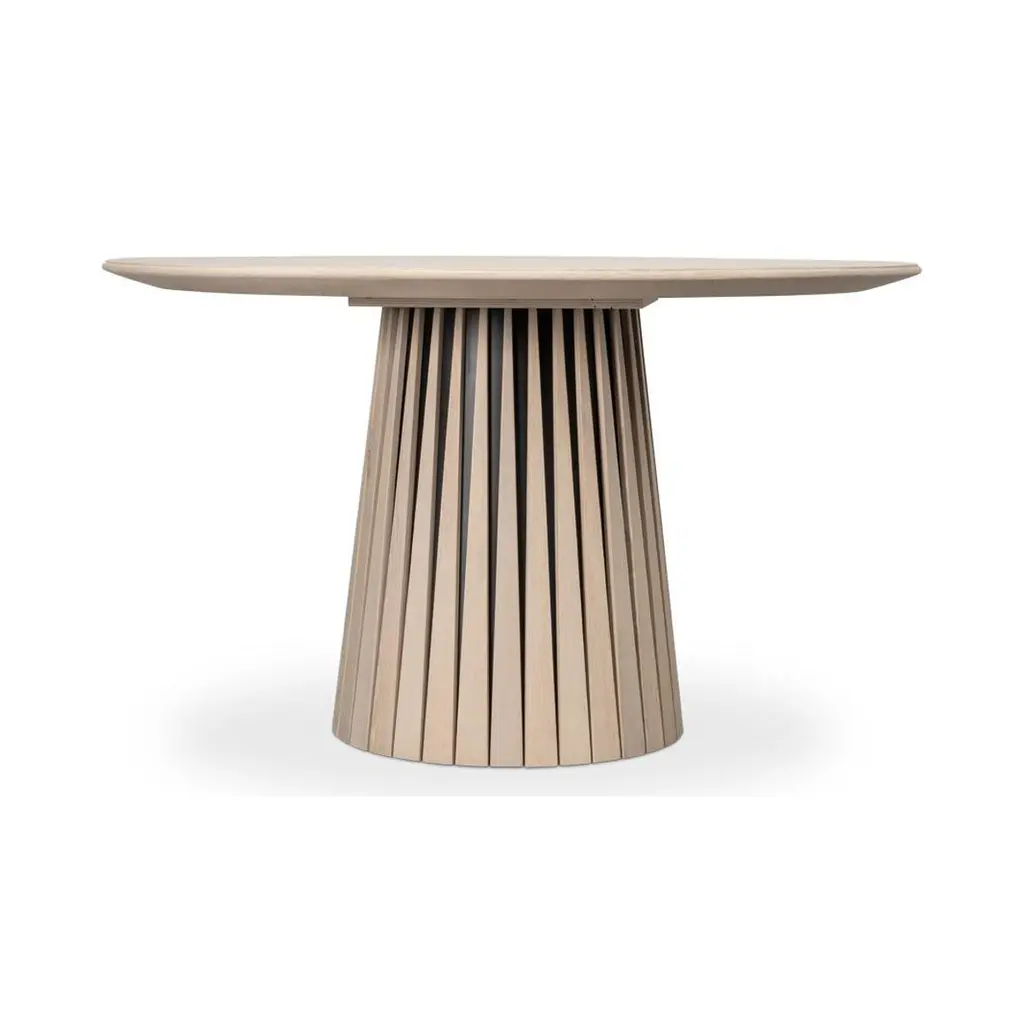 The brushed light grey finish on oak offers a rustic elegance that seamlessly blends contemporary design with timeless charm. Perfect for intimate gatherings, this table's unique base design adds a touch of sophistication to any room. Whether you're enjoying a casual breakfast or a formal dinner, this table provides a stylish and inviting setting.Dimensions: 51" W x 51" D x 30" H