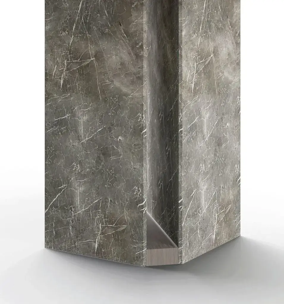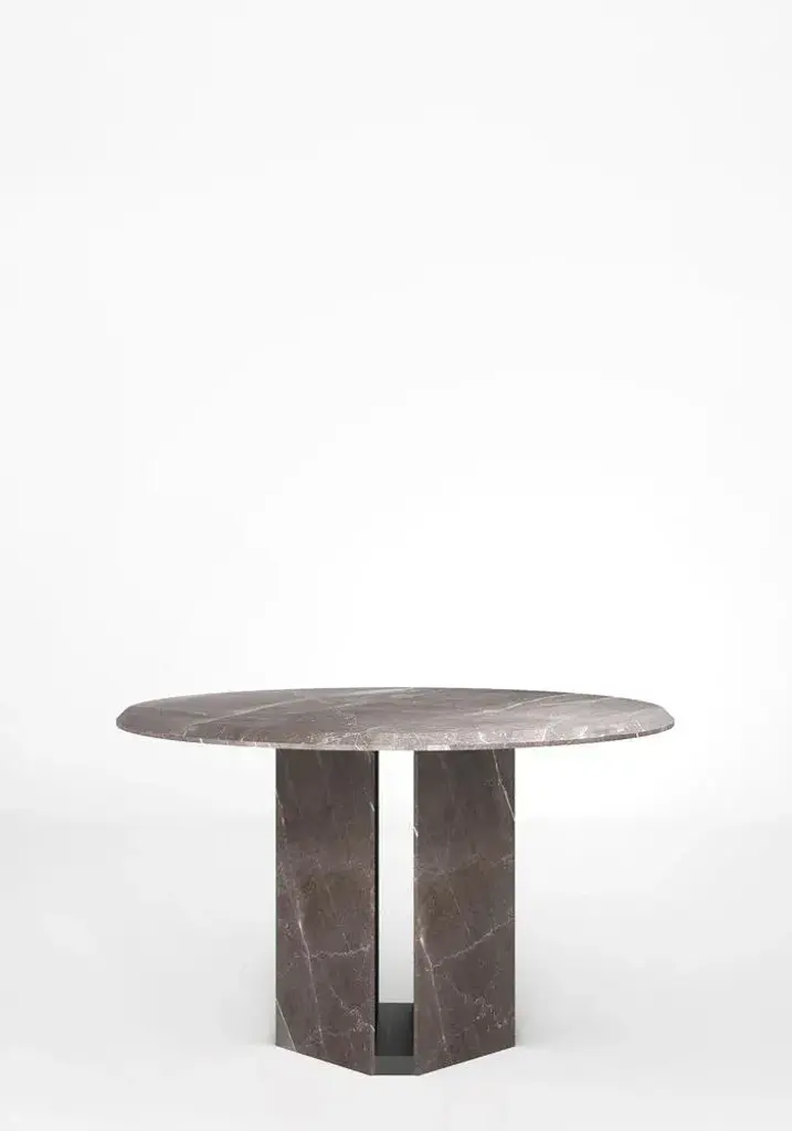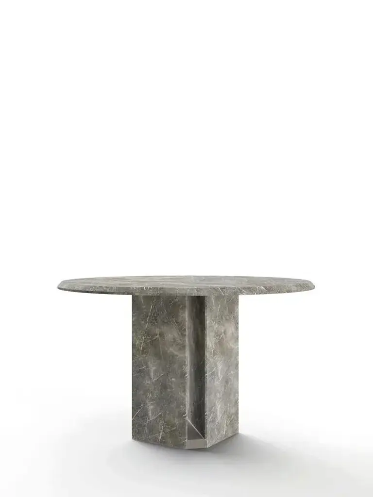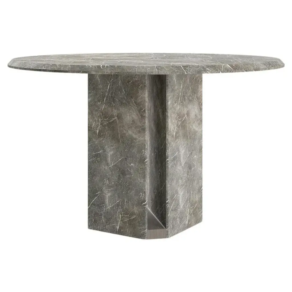 Small round marble "Delos" dining table - Giorgio Bonaguro Dimensions: 74 height x 120 cm diameter Materials: Stardust marble, metal Available in other marbles and metal finishes. Collection of tables developed from a pure block of marble, with a base divided into two or more massive elements, reminiscent of ancient pillars or supporting columns. These furnishing elements have great versatility thanks to their geometric and essential shapes. The base and the top are in marble, with a central metal insert in different finishes. This piece is attributed to the mentioned designer/maker. It has no attribution mark and no official proof of authenticity, however it is well documented in design history. I take full responsibility for any authenticity issues arising from misattribution