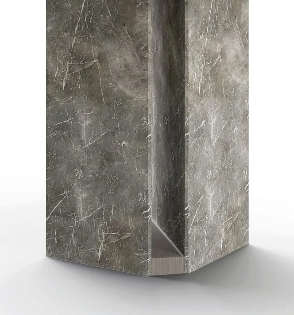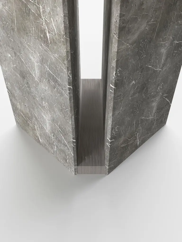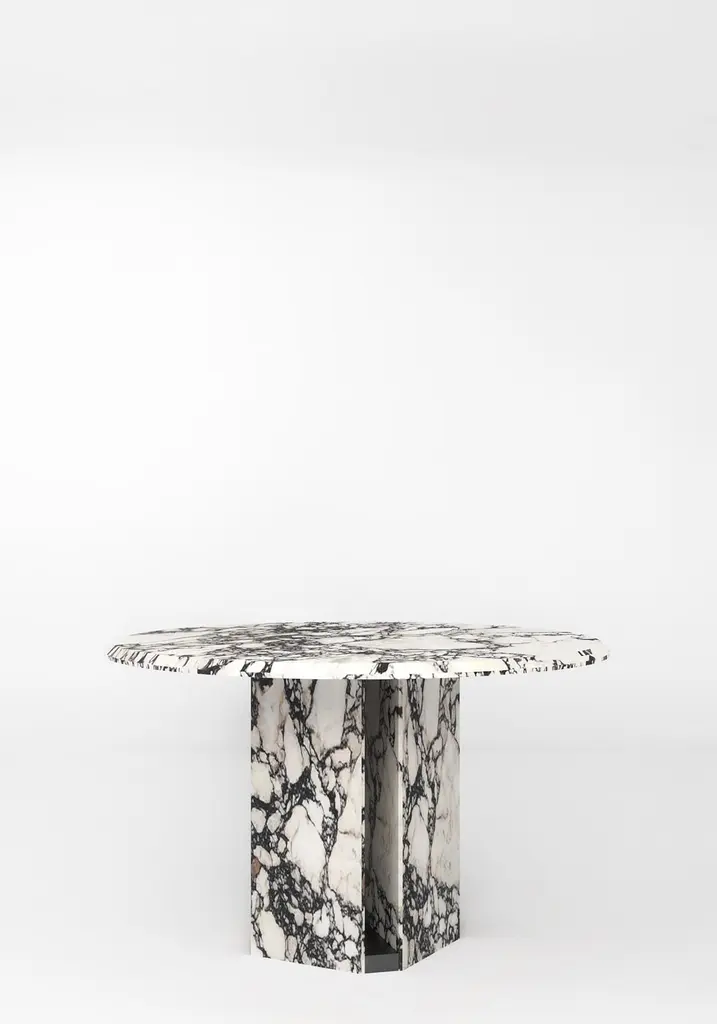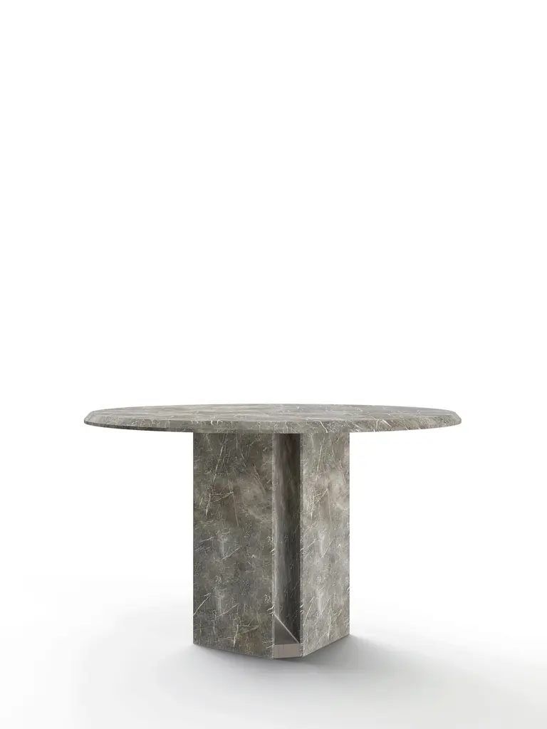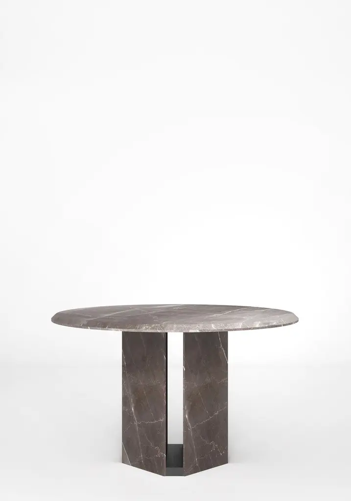 Small round marble "Delos" dining table - Giorgio BonaguroDimensions: 74 height x 120 cm diameterMaterials: Stardust marble, metalAvailable in other marbles and metal finishes.Collection of tables developed from a pure block of marble, with a base divided into two or more massive elements, reminiscent of ancient pillars or supporting columns.These furnishing elements have great versatility thanks to their geometric and essential shapes. The base and the top are in marble, with a central metal insert in different finishes.Giorgio Bonaguro studied mechanical engineering in Modena and then graduated at Scuola Politecnica di Design in Milan, in the double Master of Industrial and Interior Design. He has worked in several design studios in Milan, first at Lorenzo Palmeri's, then with Francesco Faccin, at Michele De Lucchi's Studio. And then with the designer and critic Marco Romanelli. He collaborates with several companies and develops limited editions presented at some international fairs such as Salone del Mobile, Design Miami, London Design Festival, Maison et Objet, Design Days Dubay, ecc. He works between Italy and Brazil in the field of product design, interior design, exhibition and lighting, trying to combine a linear style with research and contamination between materials.