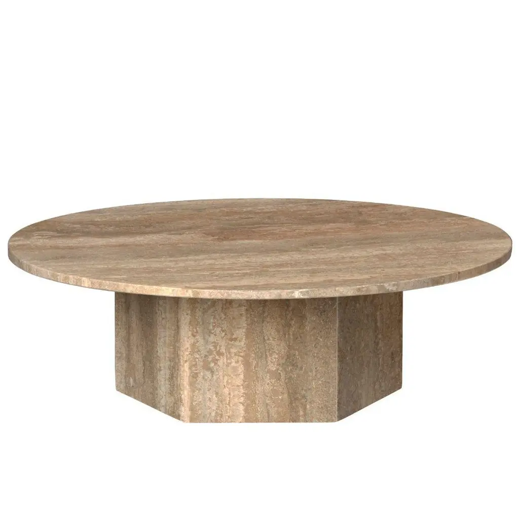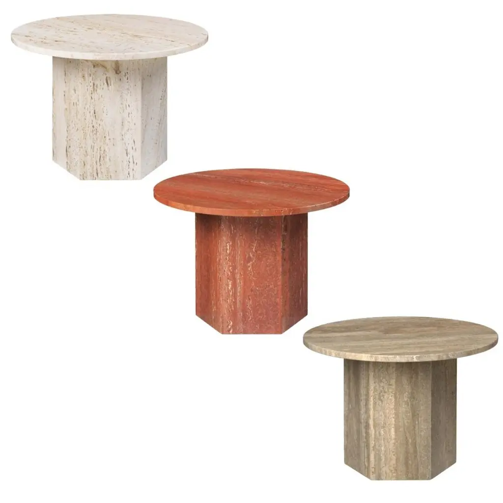 Small Travertine 'Epic' Table in Neutral White by Gamfratesi for GubiDesigned by the Danish-Italian duo GamFratesi for GUBI, the 'Epic' table is a contemporary take on classic architectural elements. Executed in two pieces of solid travertine, the hexagonal base and a circular top combine to create a striking sculptural piece that carries a subtle reference to the iconic columns of Ancient Greece.The varying heights, diameters, and finishes within the 'Epic' Table Collection mean a single table can stand alone or be combined in dynamic groupings of differing material, height and color.Price per item. Available in unlimited quantities in choice of three sizes and three finishes: neutral white, warm taupe, or burnt red. Also available as a dining table, elliptical dining table, or in steel, in separate listings. This listing is for the small 'Epic' table in neutral white travertine. Lead time for white travertine is 2-3 weeks. Lead times for red and gray are 12-16 weeks. Please inquire for most accurate lead times or time-sensitive orders.Note that this item drop-ships from GUBI's Chicago warehouse.Made to order.All sales final.