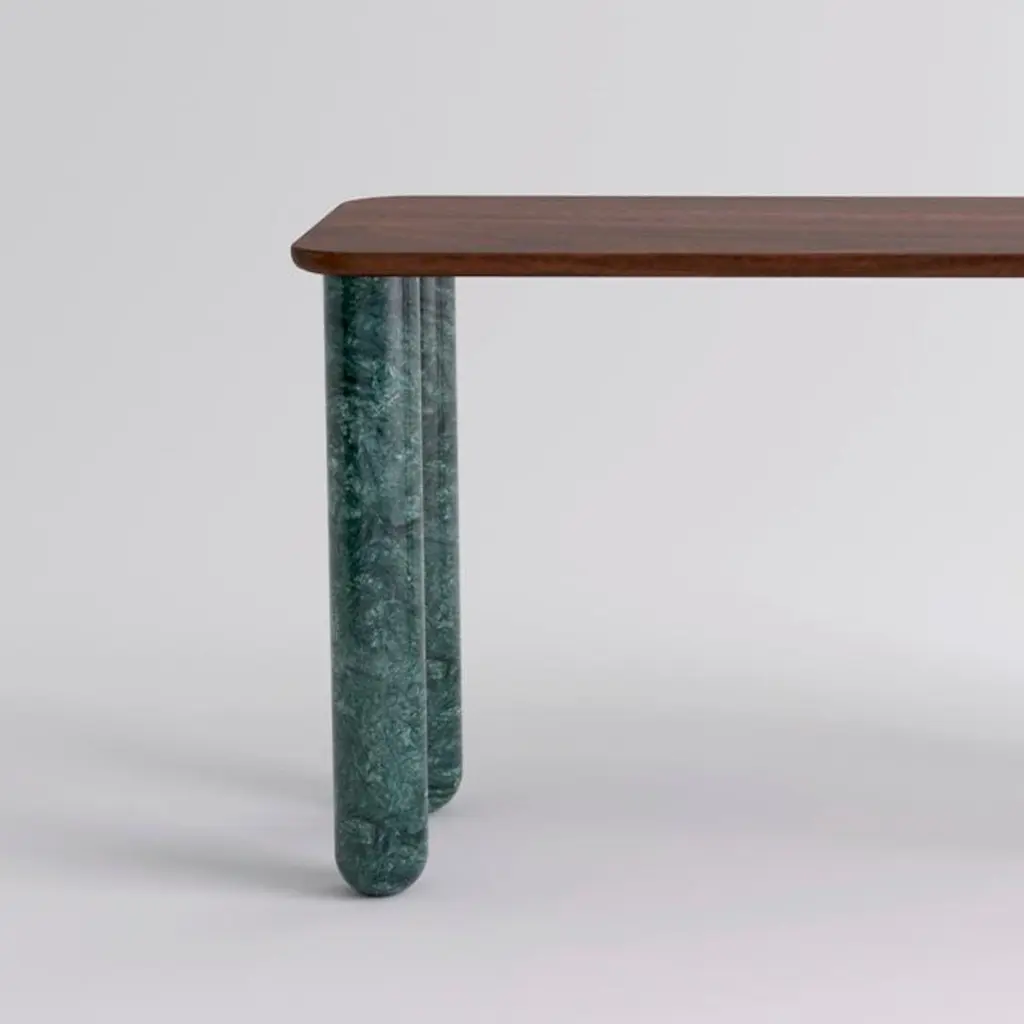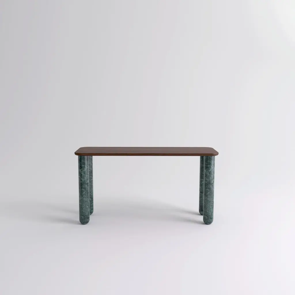 Small walnut and green marble "Sunday" dining table - Jean-Baptiste SouletieDimensions: 150 W x 50 D x 74.5 H cmMaterials: Indian Green marble legs, walnut wood top.Different finishes and sizes are available.Sunday is a family of dinner tables, coffee tables and consoles with a simple and sculptural design. The mix of heavy marble legs and a thin solid wood top creates an interesting contrast while the rounded edges and generous proportions provide a comforting feeling.Sunday is all about the materials: 3 marbles and 2 woods are available in the collection.Sunday comes in a wide variety of dimensions and 2 different marble legs heights to perfectly fit your interior whether you need a small coffee table, a large one, a console, or even a dinner table that will seat 10 guests on a friendly Sunday lunch.Jean-Baptiste Souletie is the Co-founder of the furniture editor La Chance with Louise Breguet. He studied in India, worked for a merchant bank in London (where he designed their new offices), before working for an investment fund (where he redevised the graphic chart), and in the strategic department of a luxury goods company in Paris. He returned to his first loves, architecture and furniture, when he founded La Chance in 2012.