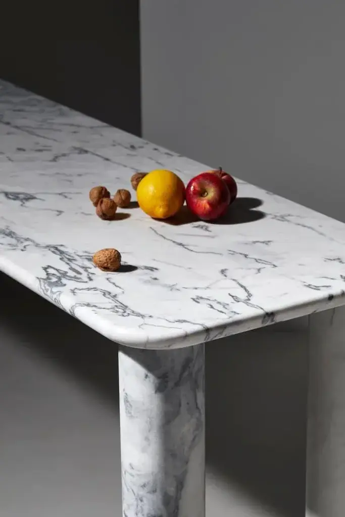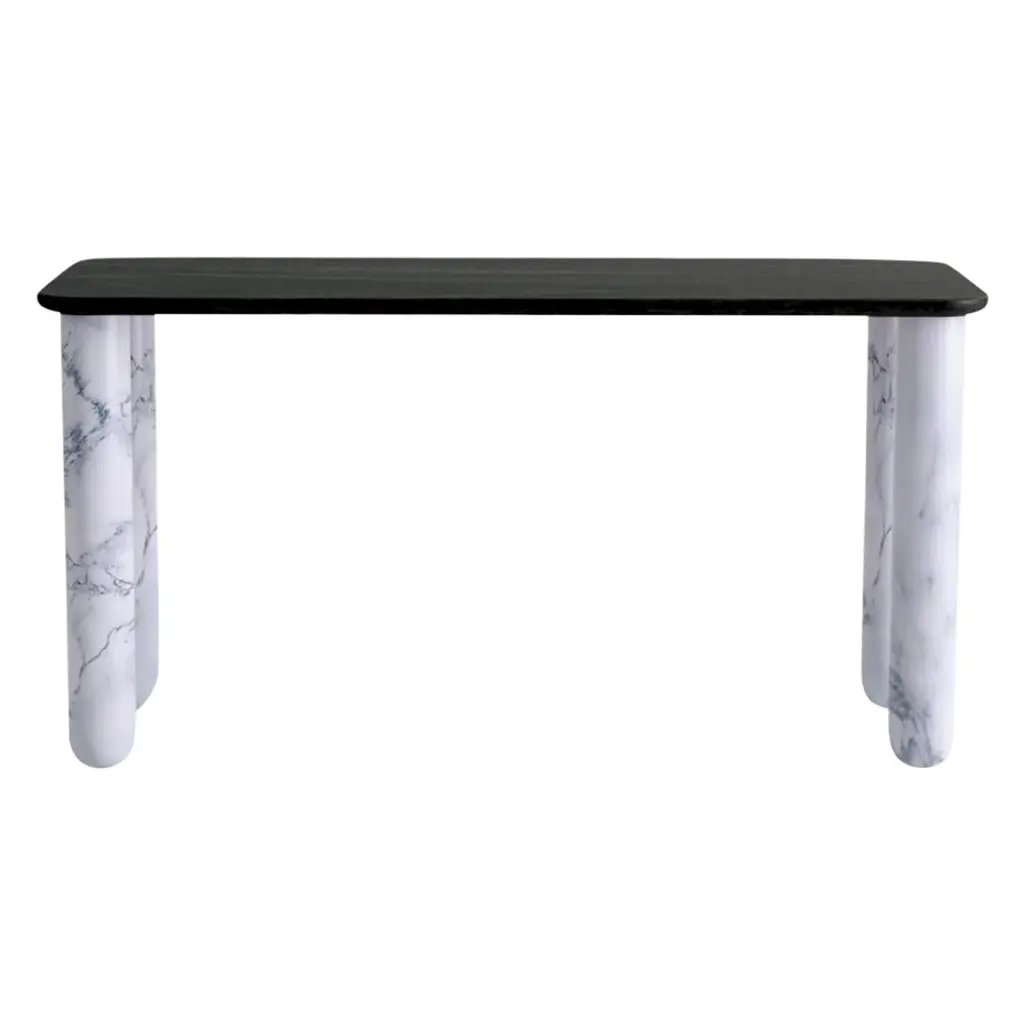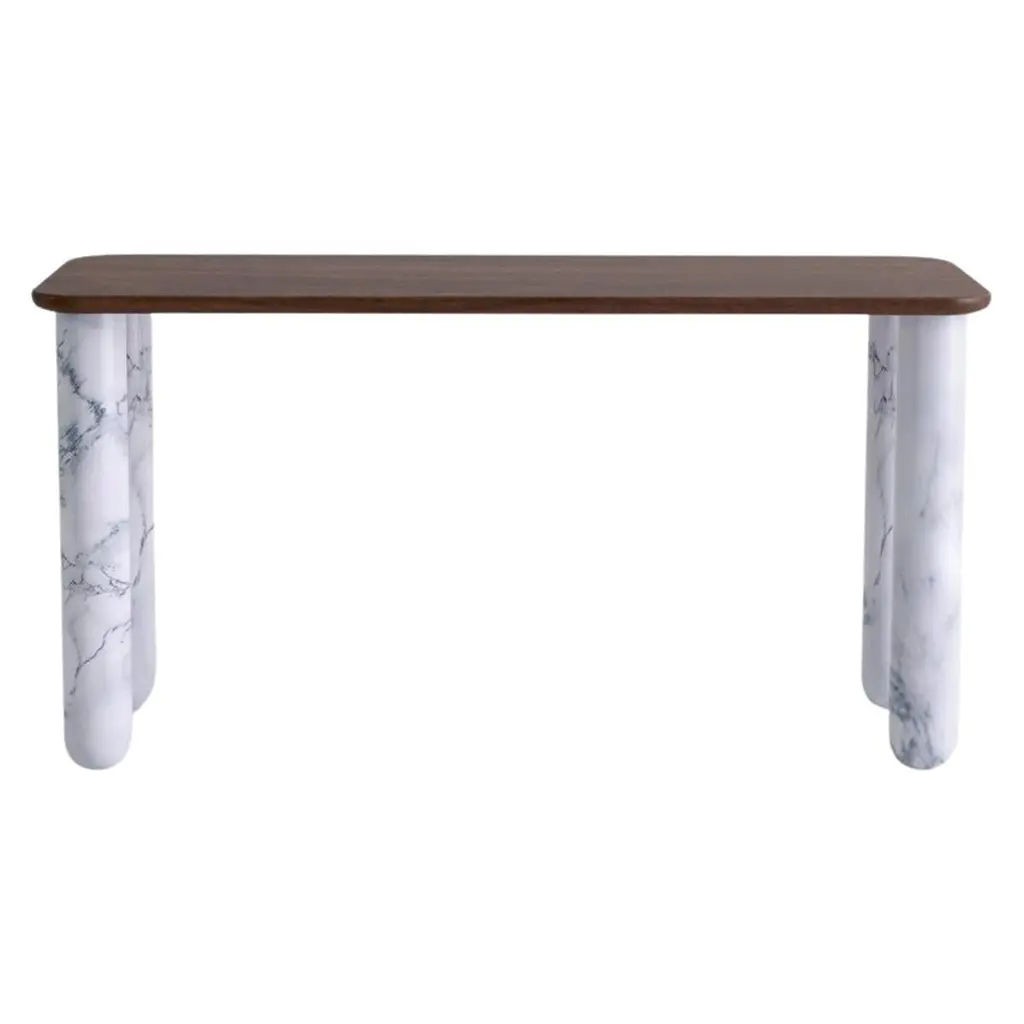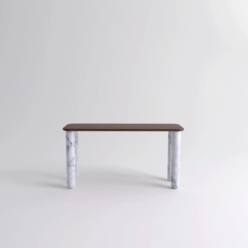 Small walnut and white marble "Sunday" dining table - Jean-Baptiste Souletie Dimensions: 150 W x 50 D x 74.5 H cm Materials: white Pele de Tigre marble legs, walnut wood top. Different finishes and sizes are available. Sunday is a family of dinner tables, coffee tables and consoles with a simple and sculptural design. The mix of heavy marble legs and a thin solid wood top creates an interesting contrast while the rounded edges and generous proportions provide a comforting feeling. Sunday is all about the materials: 3 marbles and 2 woods are available in the collection. Sunday comes in a wide variety of dimensions and 2 different marble legs heights to perfectly fit your interior whether you need a small coffee table, a large one, a console, or even a dinner table that will seat 10 guests on a friendly Sunday lunch.