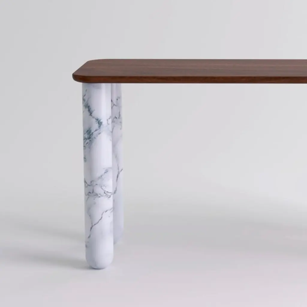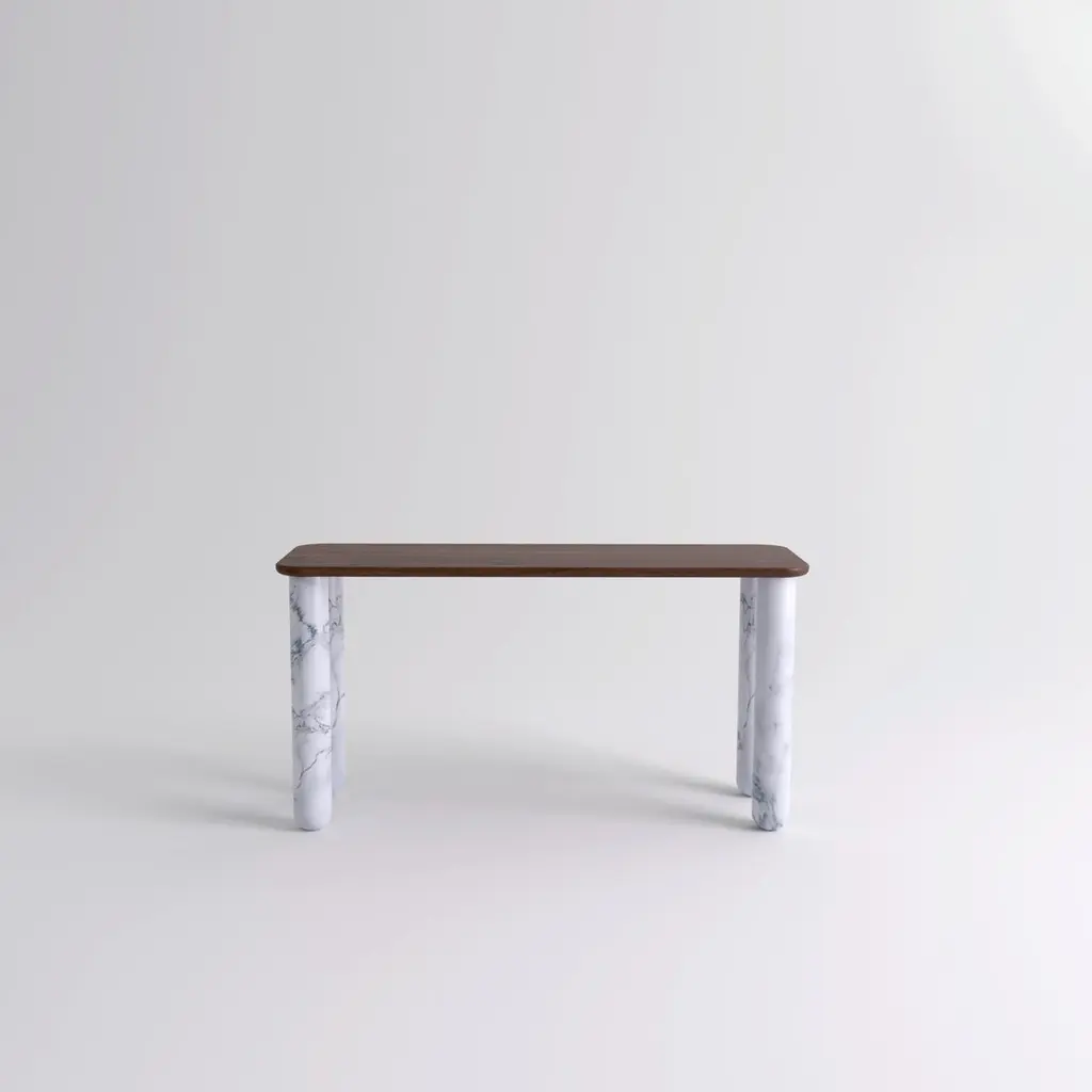 Small walnut and white marble "Sunday" dining table - Jean-Baptiste SouletieDimensions: 150 W x 50 D x 74.5 H cmMaterials: white Pele de Tigre marble legs, walnut wood top.Different finishes and sizes are available.Sunday is a family of dinner tables, coffee tables and consoles with a simple and sculptural design. The mix of heavy marble legs and a thin solid wood top creates an interesting contrast while the rounded edges and generous proportions provide a comforting feeling.Sunday is all about the materials: 3 marbles and 2 woods are available in the collection.Sunday comes in a wide variety of dimensions and 2 different marble legs heights to perfectly fit your interior whether you need a small coffee table, a large one, a console, or even a dinner table that will seat 10 guests on a friendly Sunday lunch.Jean-Baptiste Souletie is the Co-founder of the furniture editor La Chance with Louise Breguet. He studied in India, worked for a merchant bank in London (where he designed their new offices), before working for an investment fund (where he redevised the graphic chart), and in the strategic department of a luxury goods company in Paris. He returned to his first loves, architecture and furniture, when he founded La Chance in 2012.