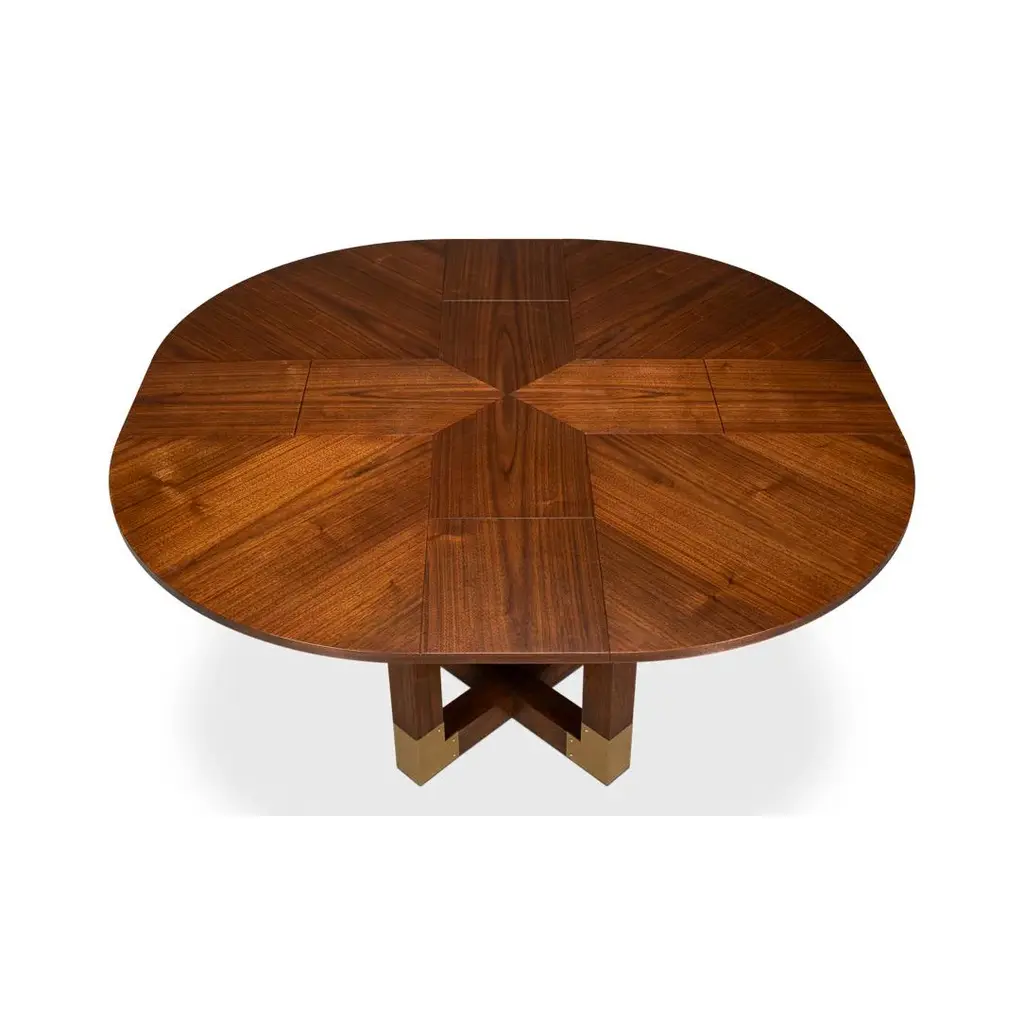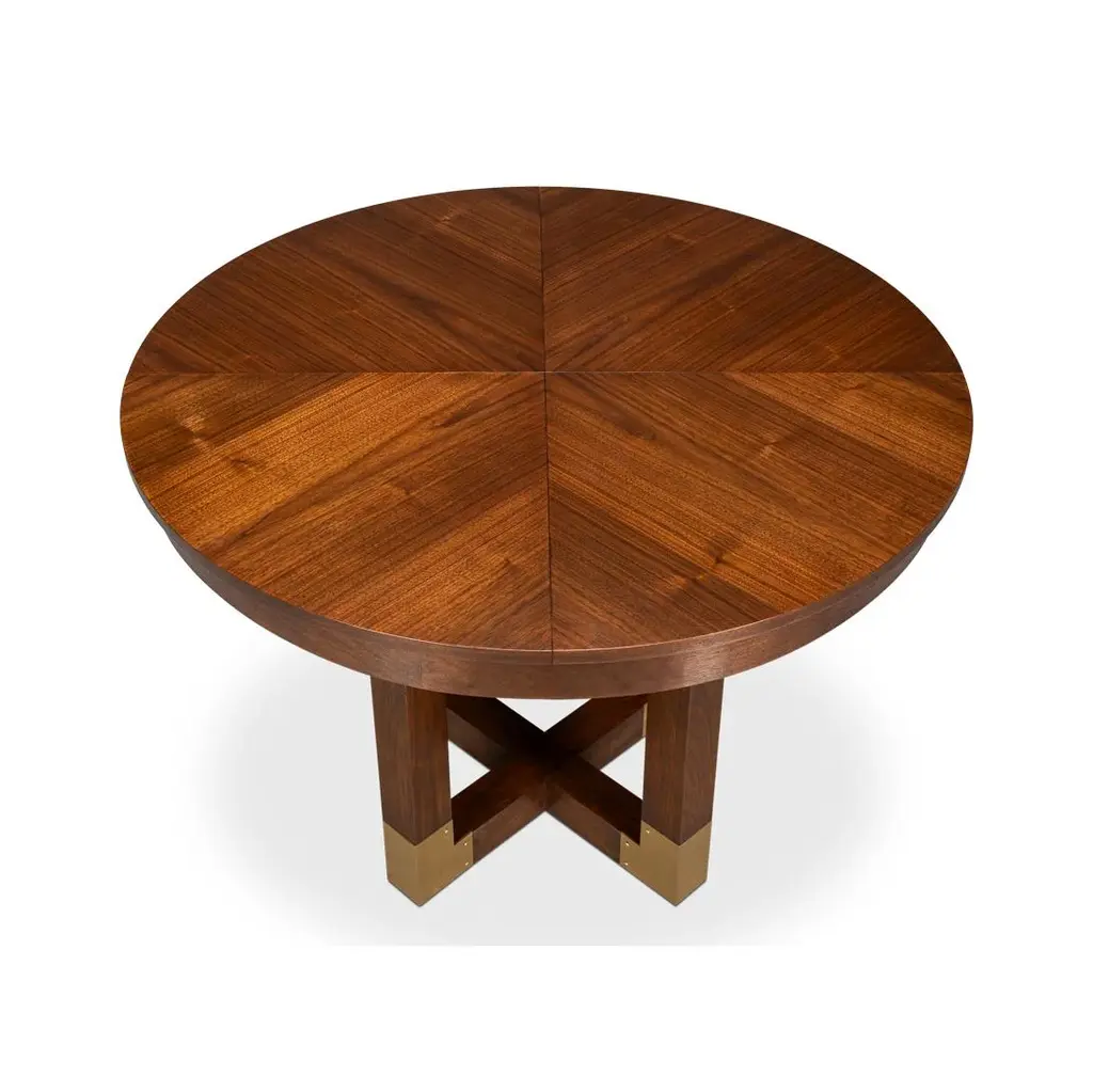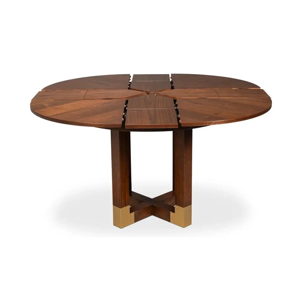Blends the bold geometry of Art Deco with the timeless elegance of Mid-Century Modern design. Its round top showcases a striking radial veneer pattern in rich dark walnut, creating a captivating sense of depth and movement. Designed to adapt to your space, the table expands from a 42-inch closed diameter to a generous 56-inch open diameter, making it ideal for both intimate dinners and larger gatherings. The sculptural pedestal base features intersecting supports, accented with polished brass details at the feet, offering both stability and a touch of glamour. This seamless combination of warm walnut and luxe brass elevates the table, making it versatile enough for contemporary, transitional, or classic interiors. Dimensions: Open: 56" W x 56" D x 30" H Closed: 42" W x 42" D x 30" H