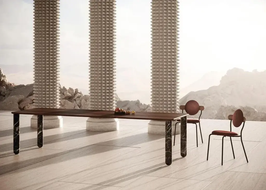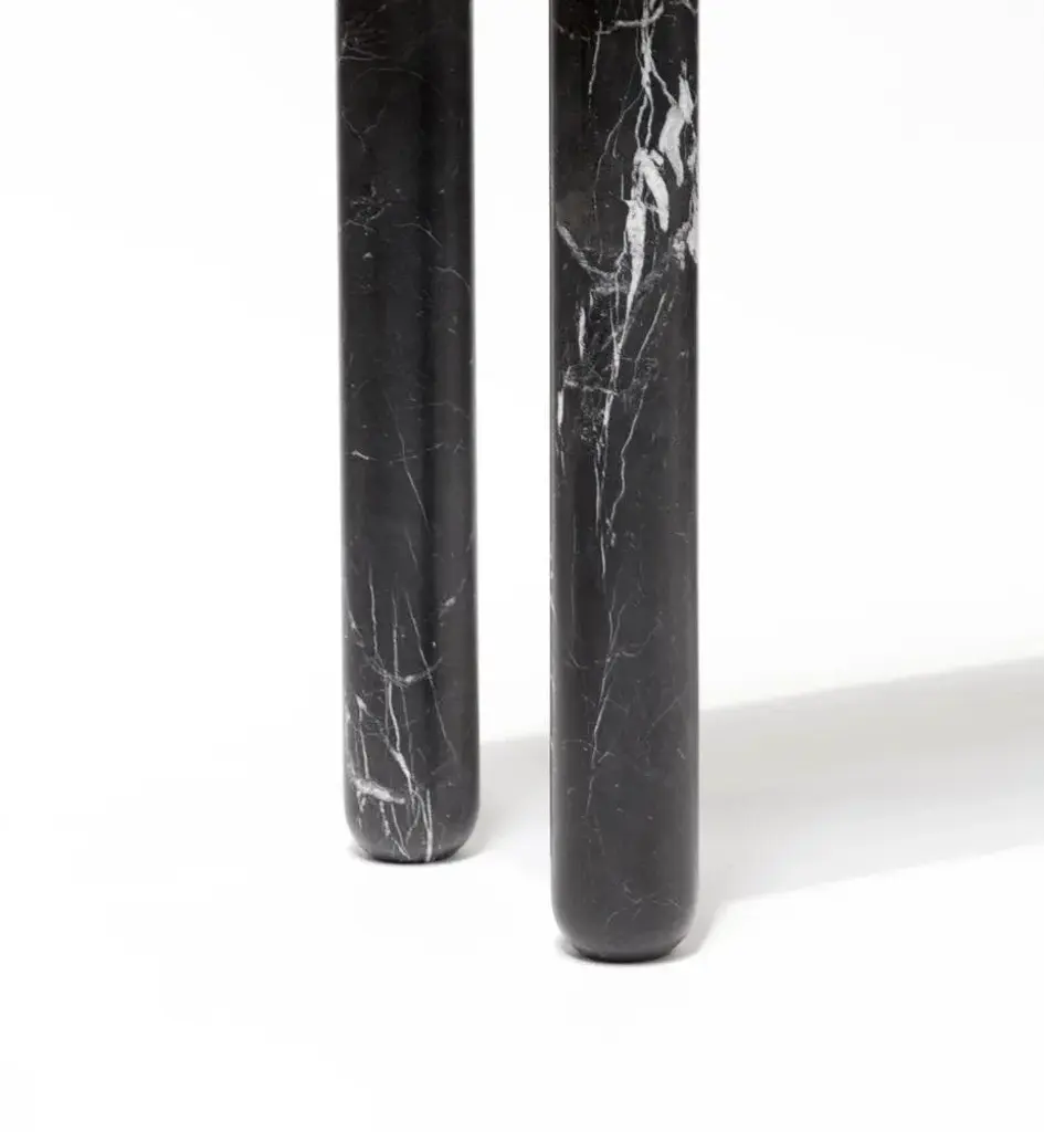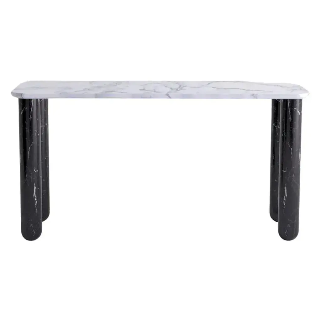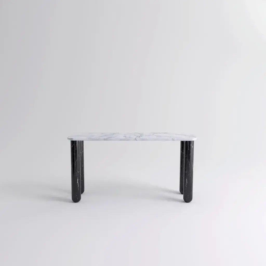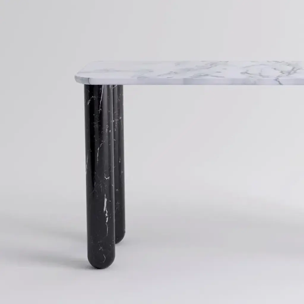 Small white and black marble "Sunday" dining table - Jean-Baptiste Souletie Dimensions: 150 W x 50 D x 74.5 H cm Materials: black Marquina marble legs, white Pele de Tigre marble top. Different finishes and sizes are available. Sunday is a family of dinner tables, coffee tables and consoles with a simple and sculptural design. The mix of heavy marble legs and a thin solid wood top creates an interesting contrast while the rounded edges and generous proportions provide a comforting feeling. Sunday is all about the materials: 3 marbles and 2 woods are available in the collection. Sunday comes in a wide variety of dimensions and 2 different marble legs heights to perfectly fit your interior whether you need a small coffee table, a large one, a console, or even a dinner table that will seat 10 guests on a friendly Sunday lunch.