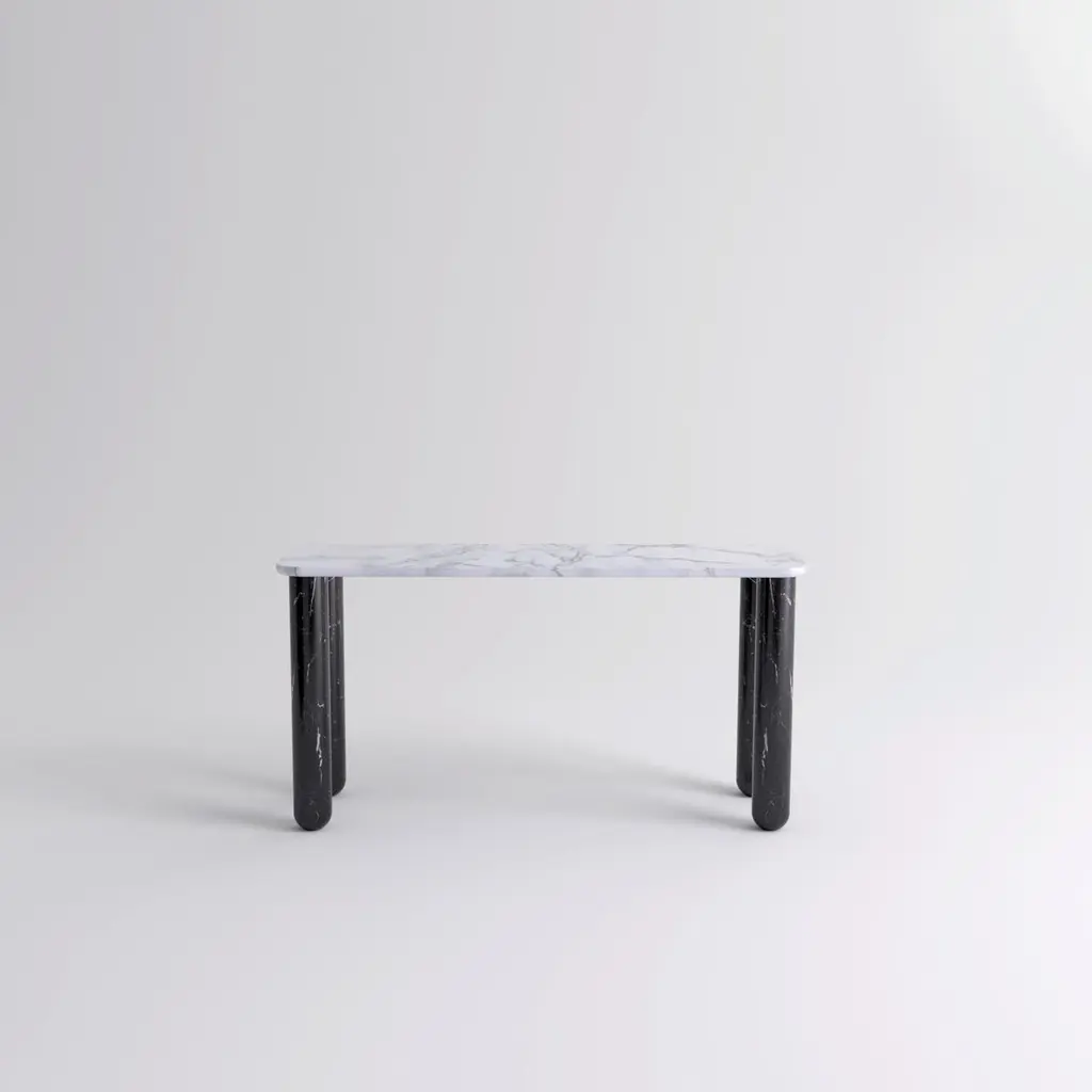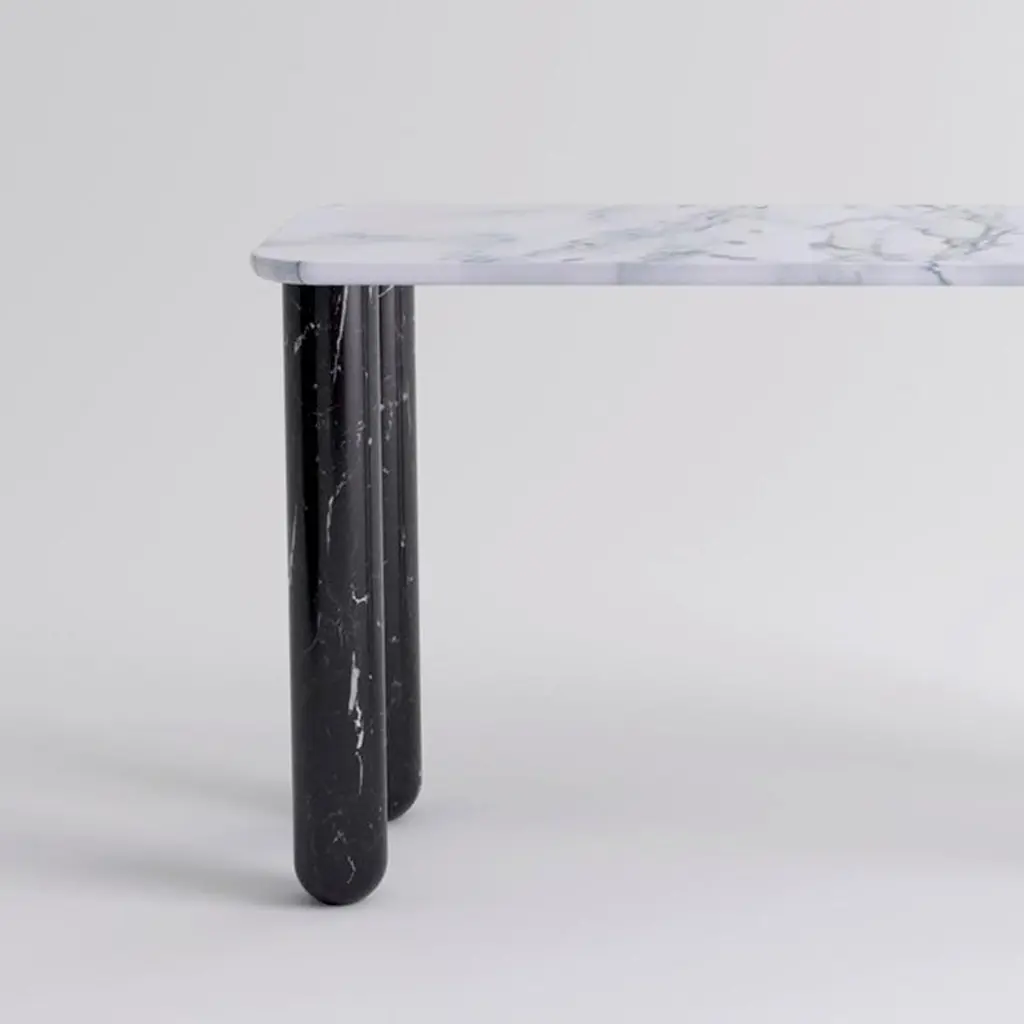 Small white and black marble "Sunday" dining table - Jean-Baptiste SouletieDimensions: 150 W x 50 D x 74.5 H cmMaterials: black Marquina marble legs, white Pele de Tigre marble top.Different finishes and sizes are available.Sunday is a family of dinner tables, coffee tables and consoles with a simple and sculptural design. The mix of heavy marble legs and a thin solid wood top creates an interesting contrast while the rounded edges and generous proportions provide a comforting feeling.Sunday is all about the materials: 3 marbles and 2 woods are available in the collection.Sunday comes in a wide variety of dimensions and 2 different marble legs heights to perfectly fit your interior whether you need a small coffee table, a large one, a console, or even a dinner table that will seat 10 guests on a friendly Sunday lunch.Jean-Baptiste Souletie is the Co-founder of the furniture editor La Chance with Louise Breguet. He studied in India, worked for a merchant bank in London (where he designed their new offices), before working for an investment fund (where he redevised the graphic chart), and in the strategic department of a luxury goods company in Paris. He returned to his first loves, architecture and furniture, when he founded La Chance in 2012.
