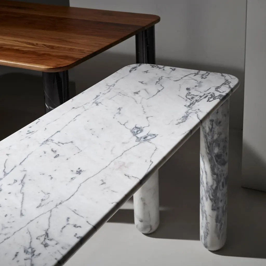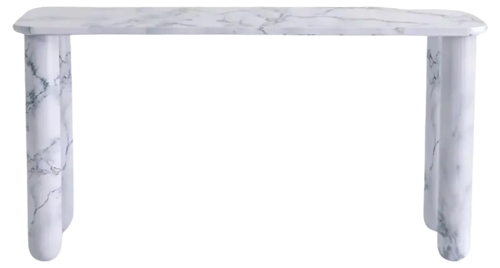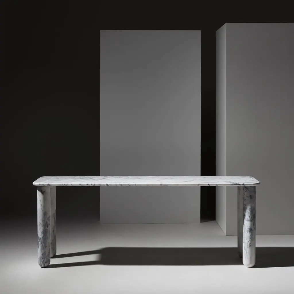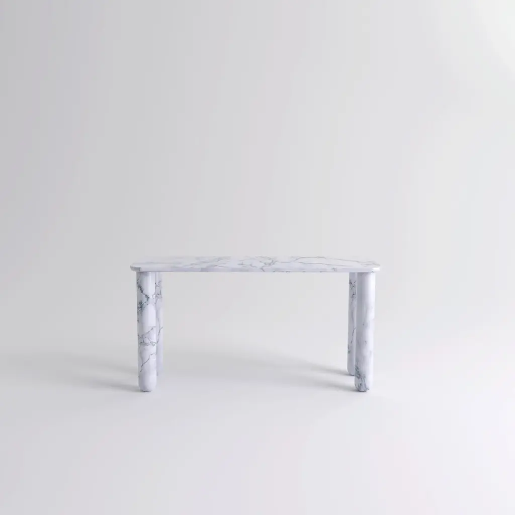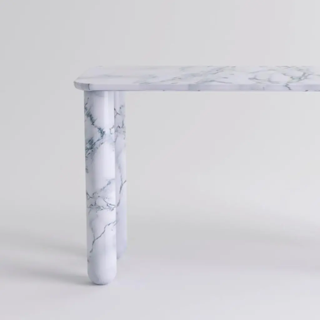 Small White Marble "Sunday" dining table - Jean-Baptiste SouletieDimensions: 150 W x 50 D x 74.5 H cmMaterials: white Pele de Tigre marble.Different finishes and sizes are available.Sunday is a family of dinner tables, coffee tables and consoles with a simple and sculptural design. The mix of heavy marble legs and a thin solid wood top creates an interesting contrast while the rounded edges and generous proportions provide a comforting feeling.Sunday is all about the materials: 3 marbles and 2 woods are available in the collection.Sunday comes in a wide variety of dimensions and 2 different marble legs heights to perfectly fit your interior whether you need a small coffee table, a large one, a console, or even a dinner table that will seat 10 guests on a friendly Sunday lunch.Jean-Baptiste Souletie is the Co-founder of the furniture editor La Chance with Louise Breguet. He studied in India, worked for a merchant bank in London (where he designed their new offices), before working for an investment fund (where he redevised the graphic chart), and in the strategic department of a luxury goods company in Paris. He returned to his first loves, architecture and furniture, when he founded La Chance in 2012.