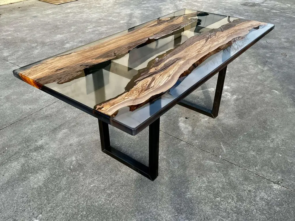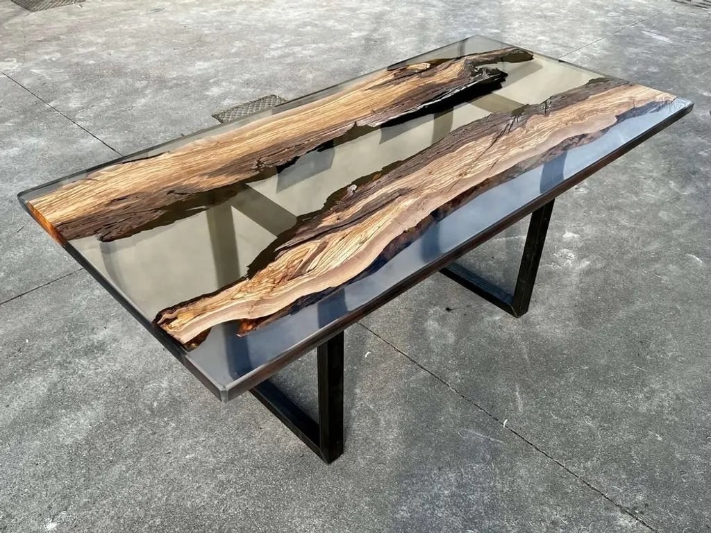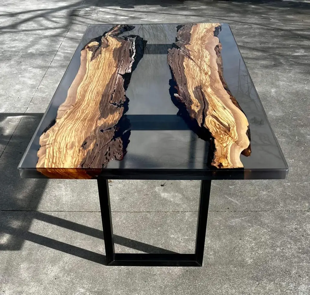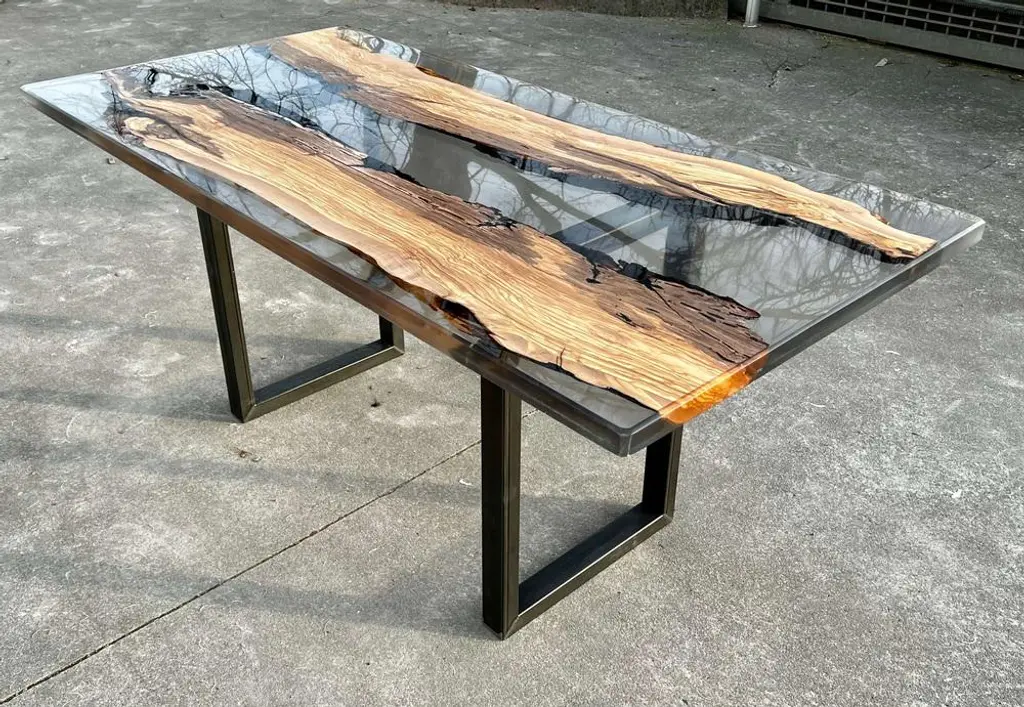 Smoke is a dining table made of wood and epoxy resin. In this River Table two steps of Lecce olive and epoxy resin are used. The top table is treated with cooked linseed oil that preserves the naturalness of the wood part, the resin is polished by hand. The welded iron legs are opaque black lacquered. Each table of mine is made exclusively by hand, in Italy, on commission and tailored to the customer. The proposed images concern a table already made. In case of order, a news table will be created on the basis of the smoke model Signed by Maker