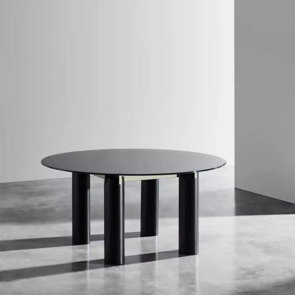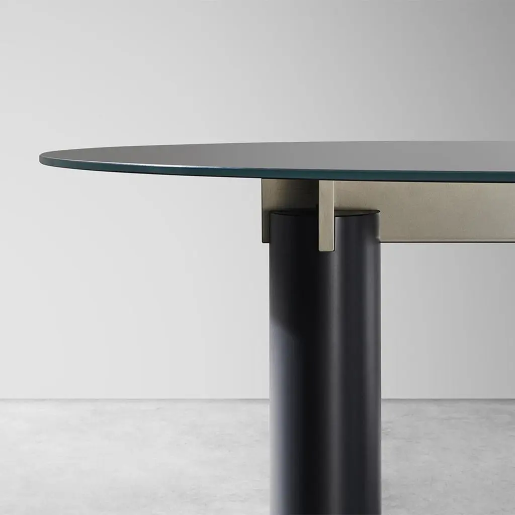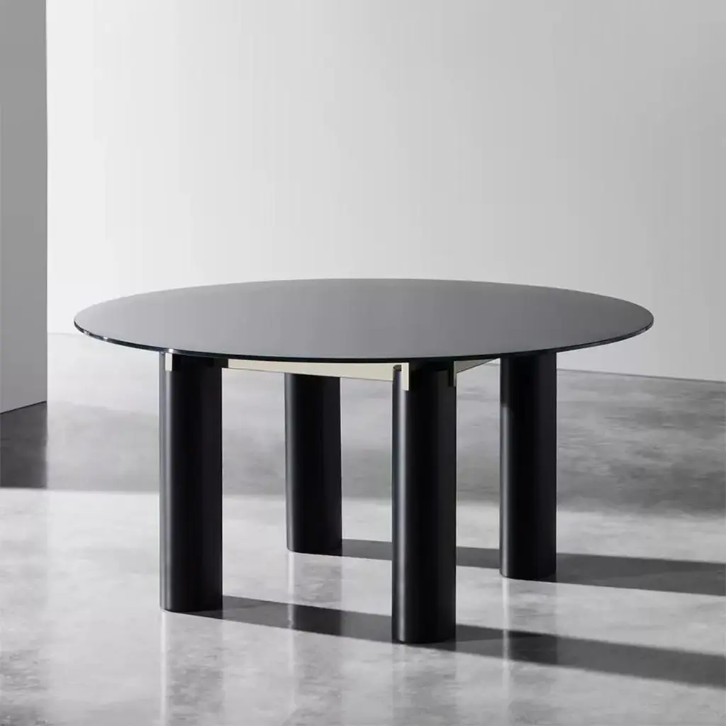 Dining table Sober Round with glass top, 12mm thickness, painted belowglass top in blueberry finish. With stell frame under the glass top in bronzefinish and with 4 feet in wood painted in blueberry finish. Feet diameter: 20cm.Also available with white carrara marble top, 20mm thickness, on request.