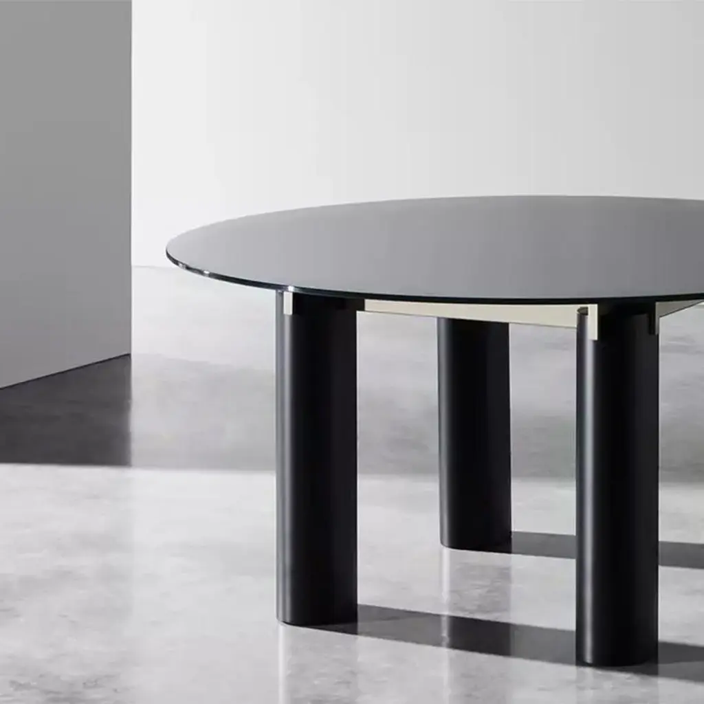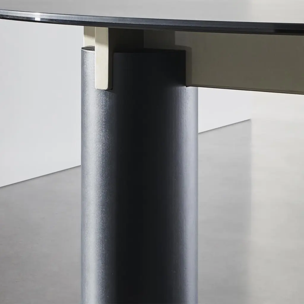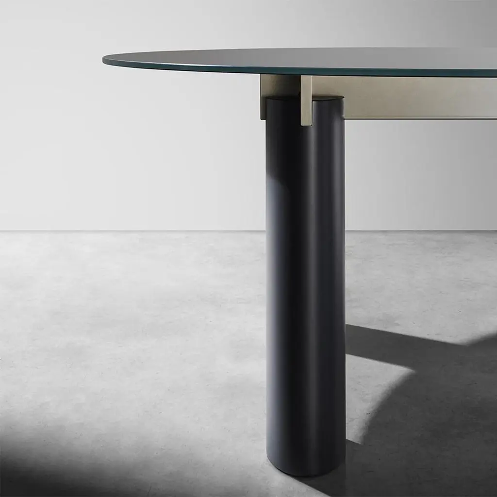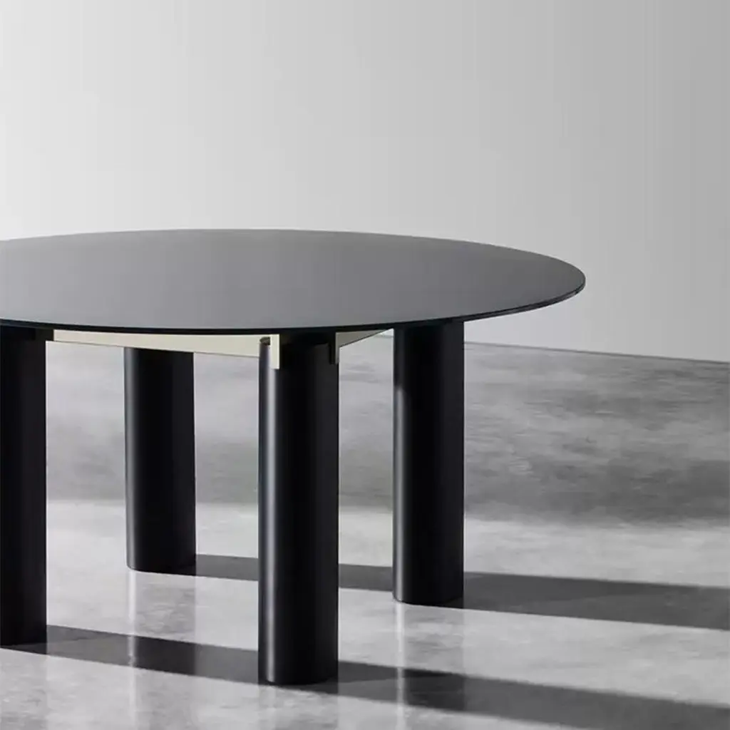 Dining table Sober Round with glass top, 12mm thickness, painted belowglass top in blueberry finish. With stell frame under the glass top in bronzefinish and with 4 feet in wood painted in blueberry finish. Feet diameter: 20cm.Also available with white carrara marble top, 20mm thickness, on request.