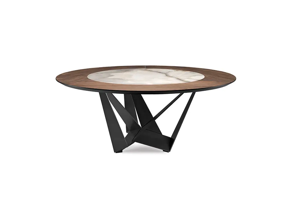 The Soho Ker-Wood dining table is a reason to get excited about blending materials in interesting ways. Manufactured in Italy by Cattelan Italia, the round dining table is designed to be used in a large kitchen as well as in a contemporary dining room. With contrasting finishes, it creates a unique finished product that makes a lovely focal point in the room. The sculptural base is open and airy and uses a combination of curves and clean lines for a complementary touch. Designed by Alberto Brogliato and Federico Traverso for Cattelan Italia, the Soho Ker-Wood round dining table is available in two fixed sizes and two versions with a built-in swiveling top that acts as a lazy Susan. It features a top that combines an array of ceramic finish options with different wood finish options. The sculptural base comes in different metal options as well.