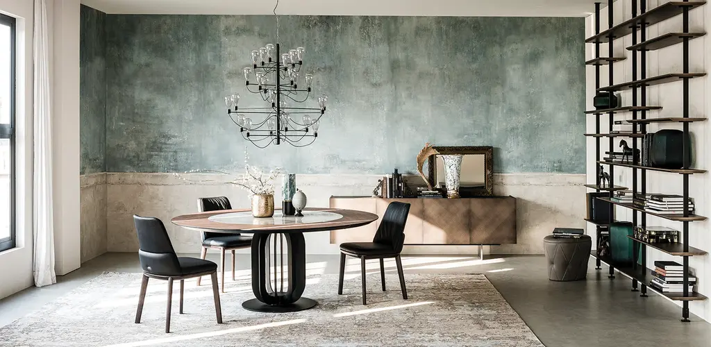 The Soho Ker-Wood dining table is a reason to get excited about blending materials in interesting ways. Manufactured in Italy by Cattelan Italia, the round dining table is designed to be used in a large kitchen as well as in a contemporary dining room. With contrasting finishes, it creates a unique finished product that makes a lovely focal point in the room. The sculptural base is open and airy and uses a combination of curves and clean lines for a complementary touch. Designed by Alberto Brogliato and Federico Traverso for Cattelan Italia, the Soho Ker-Wood round dining table is available in two fixed sizes and two versions with a built-in swiveling top that acts as a lazy Susan. It features a top that combines an array of ceramic finish options with different wood finish options. The sculptural base comes in different metal options as well.