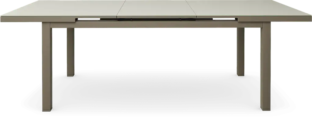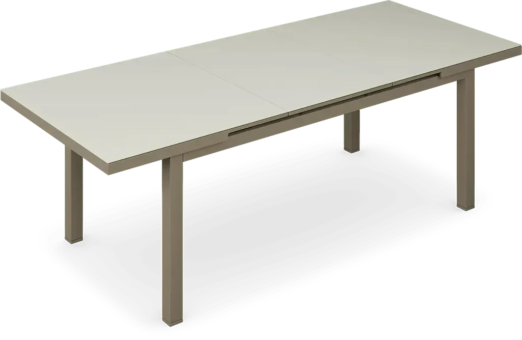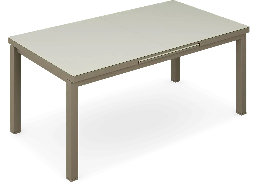 Enjoy casual mealtimes and transform your outdoor space into an entertainment hub for friends and family with the Solana dining table. Simply extend the table from 71" to 94" to elevate this table for superior entertainment enjoyment. A sturdy aluminum frame in a high gloss taupe finish has a streamlined look with a casual feel thanks to the linen textured tempered glass top that is easy to wipe clean and resistant to finger prints and smudges. Wipe clean with mild soap and water.