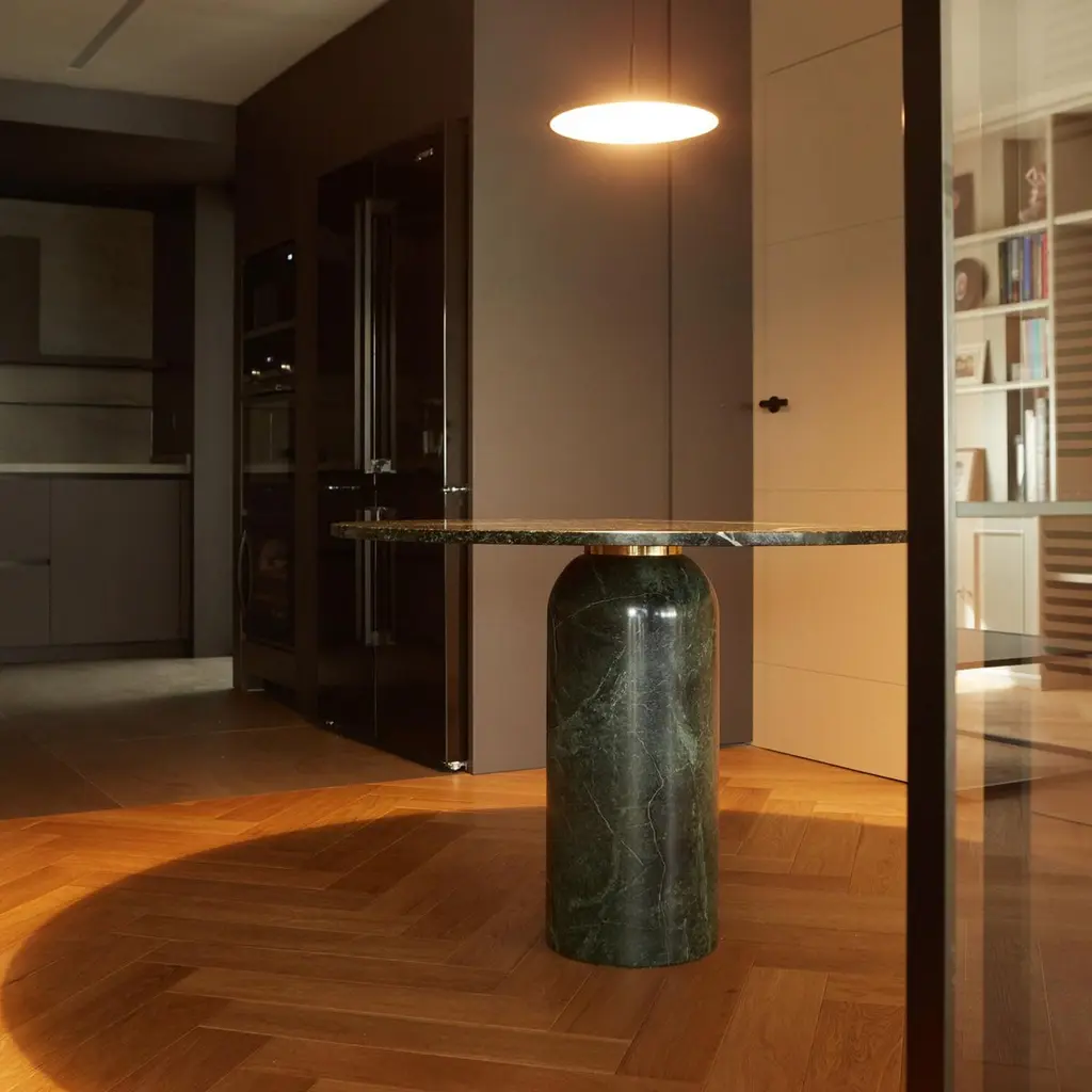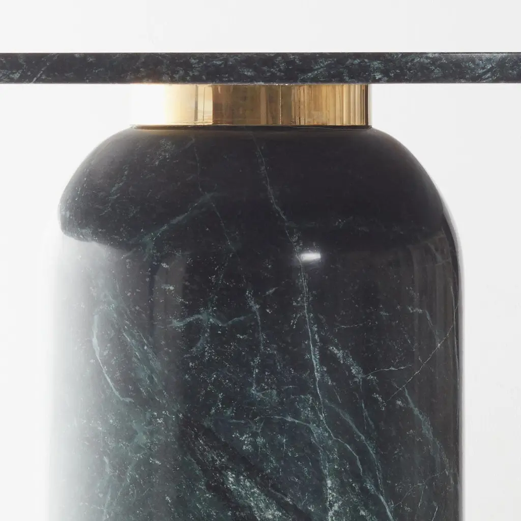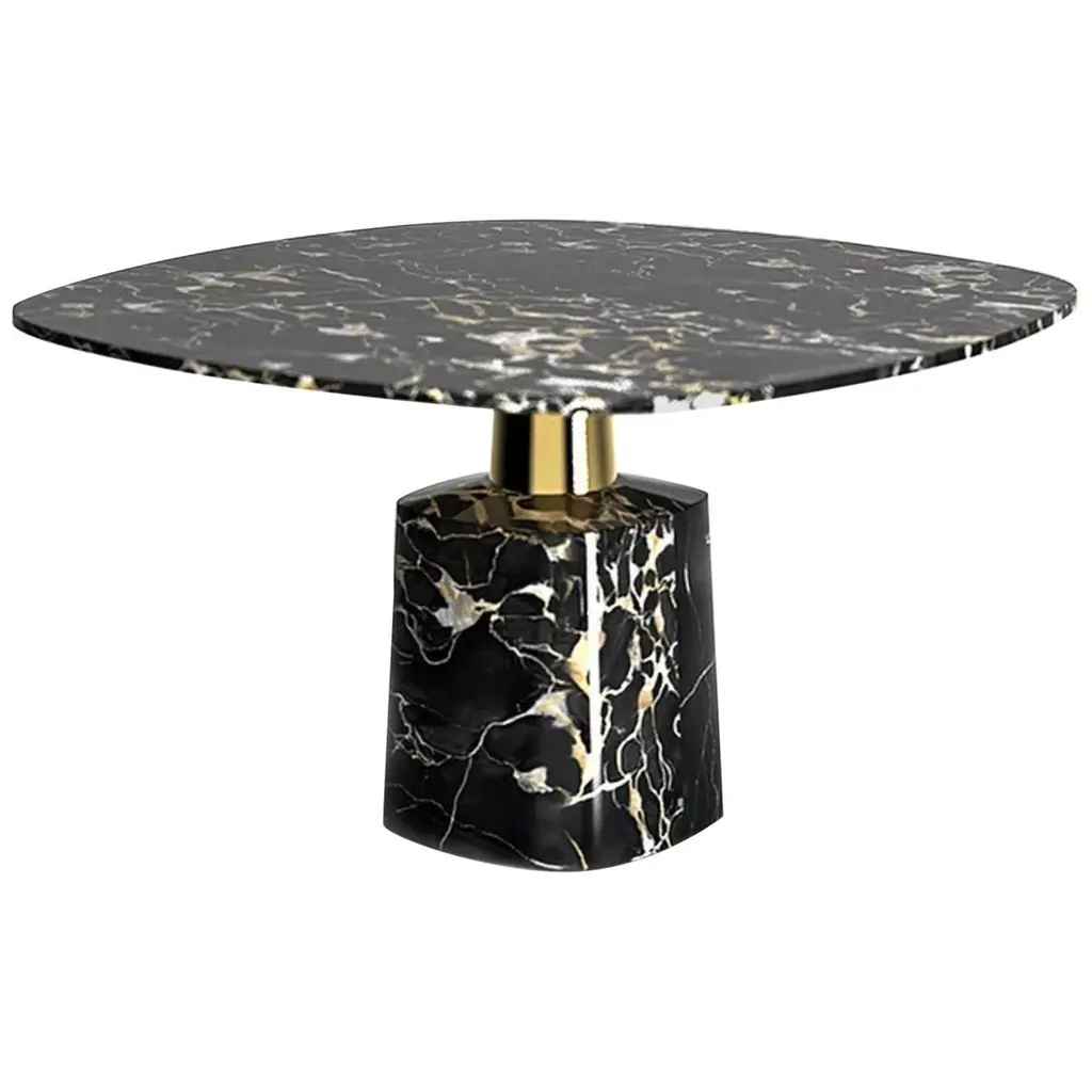 The Roser table seamlessly blends elegance with practicality, serving as both a functional table and a sophisticated reception centerpiece. Its versatility ensures it gracefully adapts to various settings, embodying timeless style. It's unique green emperador marble with gold detailing allows it to stand out but serve its purpose.