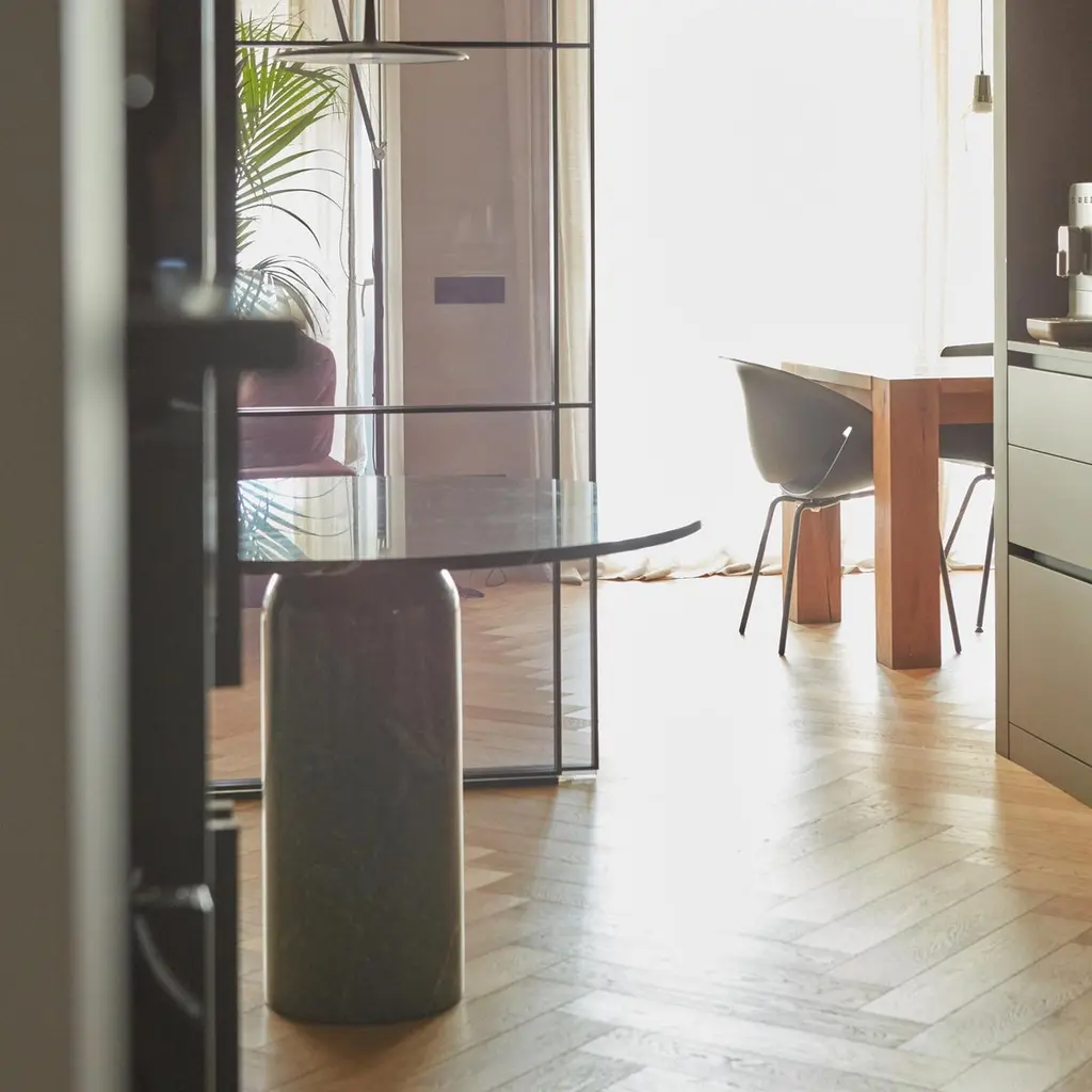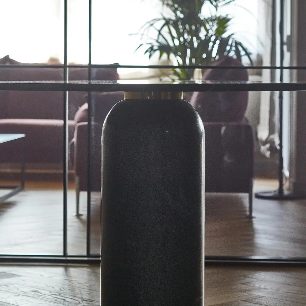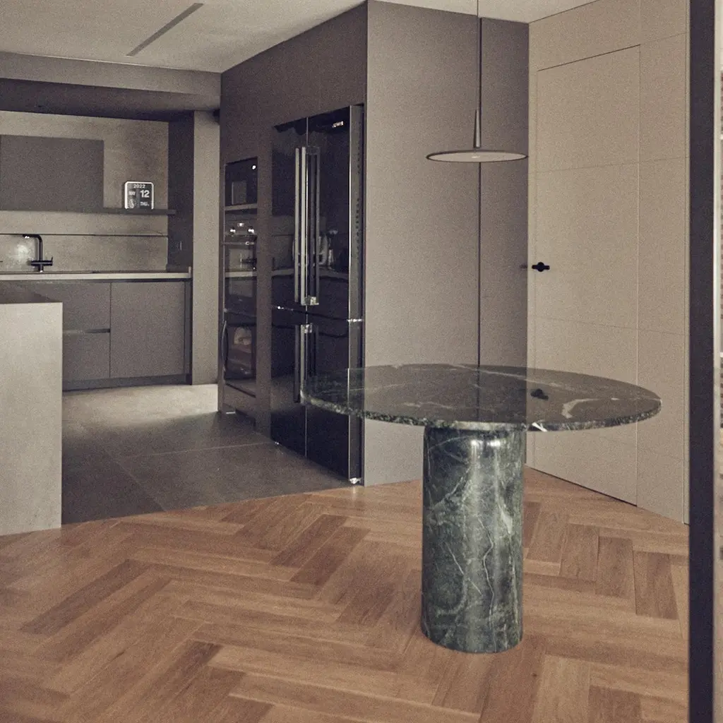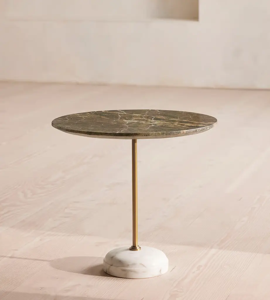 The Roser table seamlessly blends elegance with practicality, serving as both a functional table and a sophisticated reception centerpiece. Its versatility ensures it gracefully adapts to various settings, embodying timeless style. It's unique green emperador marble with gold detailing allows it to stand out but serve its purpose.