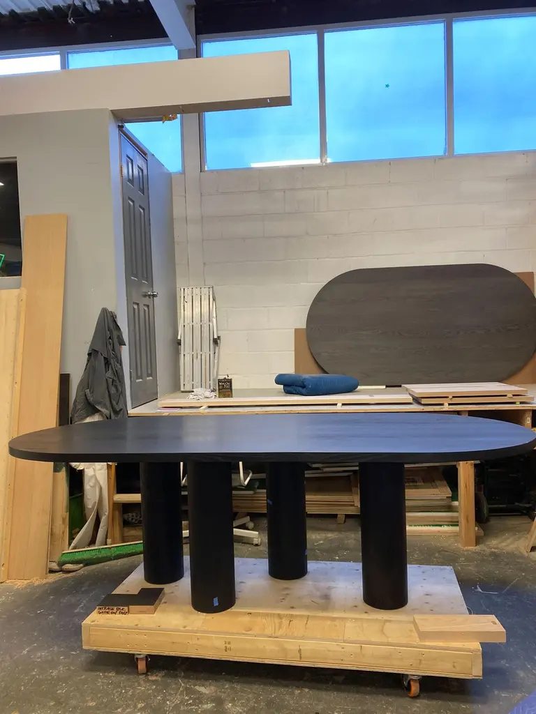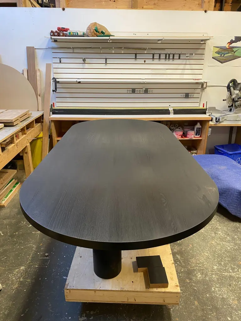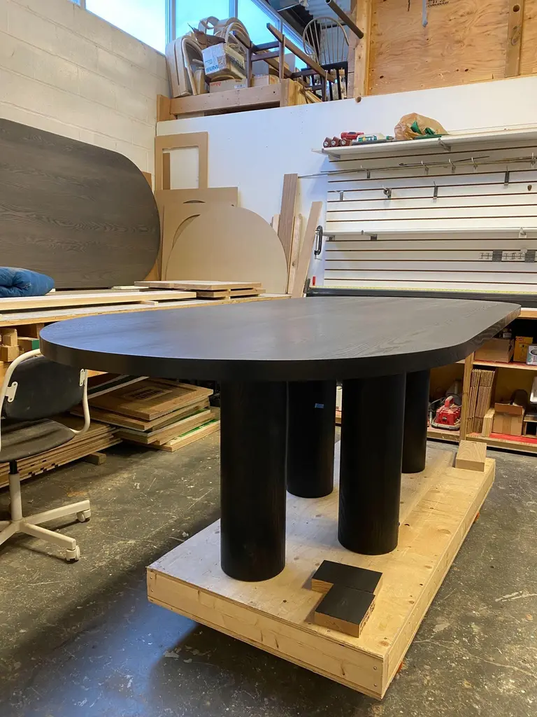 EDEN TABLE Designed to be sculptural yet honest in its simplicity, our Eden Dining Table can find itself a home in a contemporary environment, or as a statement piece in a more classical space.This listing is for a customized sizing of our Eden Dining Table in Blackened Oak at 96"L x 42"W x 30"H. We work with North American solid hardwoods. Please reach out for any customizations to species, stains, or leather quality. We are more than happy to provide more information and pricing as per your specifications.As all of our products are made-to-order, we cannot accept returns or refunds of purchased items.Crating, shipping & packaging materials are not included in the flat rate shipping quote provided. Please inquire within at the time of order for a quote on any applicable charges.Mary Ratcliffe Studio works with their own shipping & freight carriers and can supply a rate for this on request.Our larger & fragile works will be custom crated & packed for shipping. Some of our smaller items can go out in rigid foam lined boxes via ground shipping. Please inquire within for quotes on these options and related costs.Installation may be required for your piece.Local Delivery within the GTA is available. MRS also works with 3rd party delivery teams in the Toronto area for in-home delivery & installation of your piece should you wish to have this arranged/quoted.Any applicable customs/duties fees are the responsibility of the receiver.