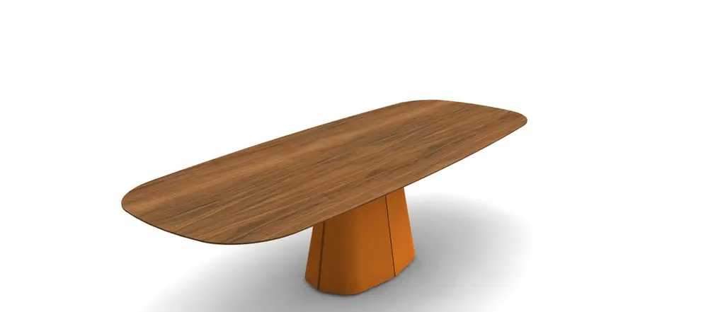 A refined statement piece, this sculptural dining table features a softly contoured rectangular top resting on a bold, tapered plinth base. Crafted in rich walnut, the table showcases a continuous grain flow and seamless transitions between surfaces, emphasizing craftsmanship and materiality. The pedestal-style base offers generous legroom and creates a clean, architectural silhouette from every angle. Ideal for contemporary interiors, this table blends organic elegance with modern simplicity, making it a striking centerpiece for dining rooms or design-forward spaces.Note: Pricing reflects the finish and material shown in the primary image. Alternate finishes and customizations are available upon request.Customization:The tabletop is offered in wood, marble, or combination.The customizable nature of the tabletop and base materials ensures that it can complement a wide range of interior styles and color schemes.Whether used in a formal dining room or a more casual setting, the table's design and quality construction make it a versatile addition to any home.Quality and Craftsmanship:Handcrafted with attention to detail and a commitment to high-quality materials and construction techniques.Please contact us if you have any questions about customization and pricing. We will be glad to check with the factory’s technical team if sizes, finishes, and colors can be customized. We do our best to expedite production and to ship and deliver product within the listed lead time, however current lead times might be longer due to global shipping backlog and delays. These delays are out of our control and cannot be a reason to cancel an order.