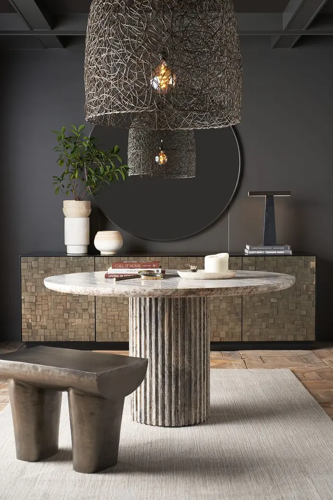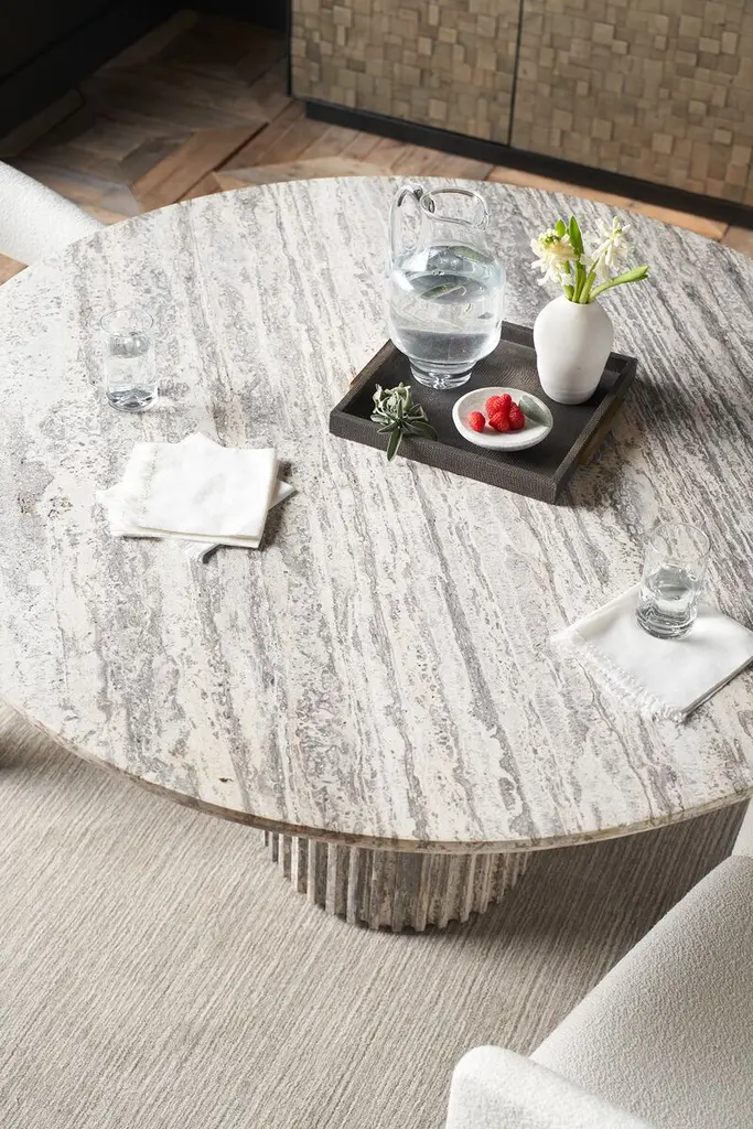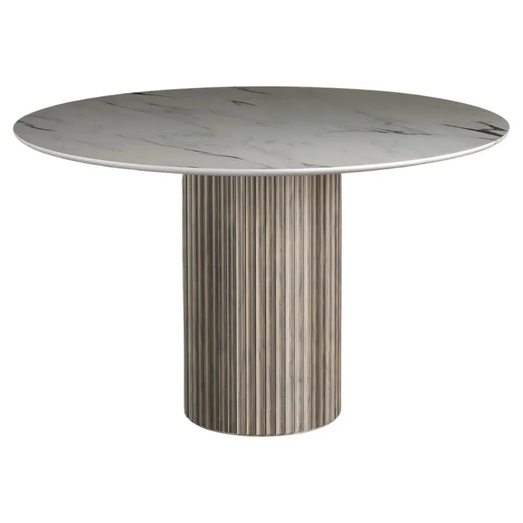 The Solly Dining Table presents a beautifully circular form, crowned with an exquisite surface. The base is intricately textured, giving the table a distinguished presence that enhances any dining area with an aura of graceful affluence.