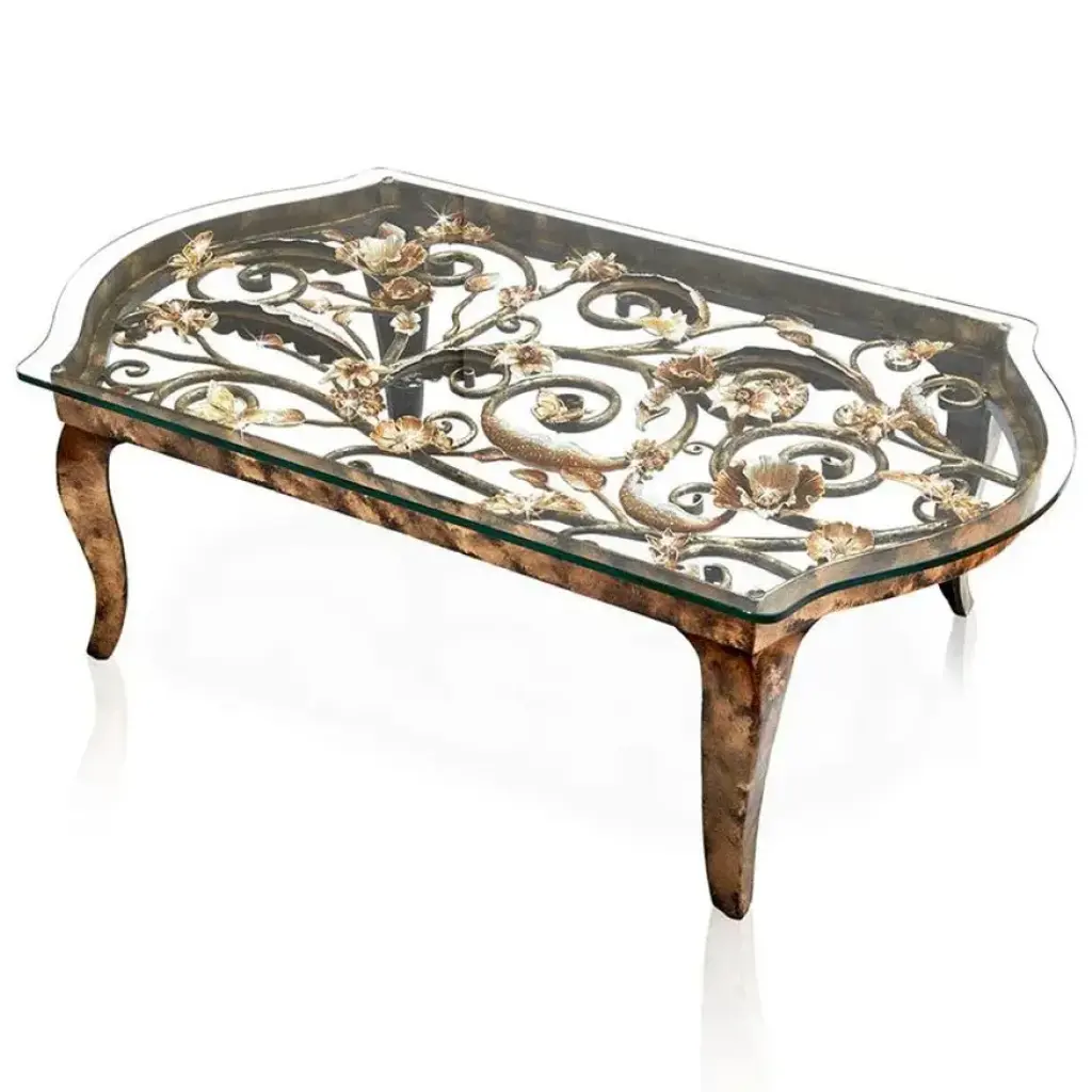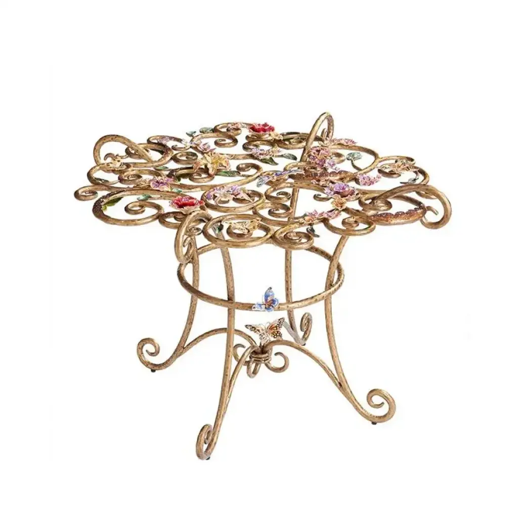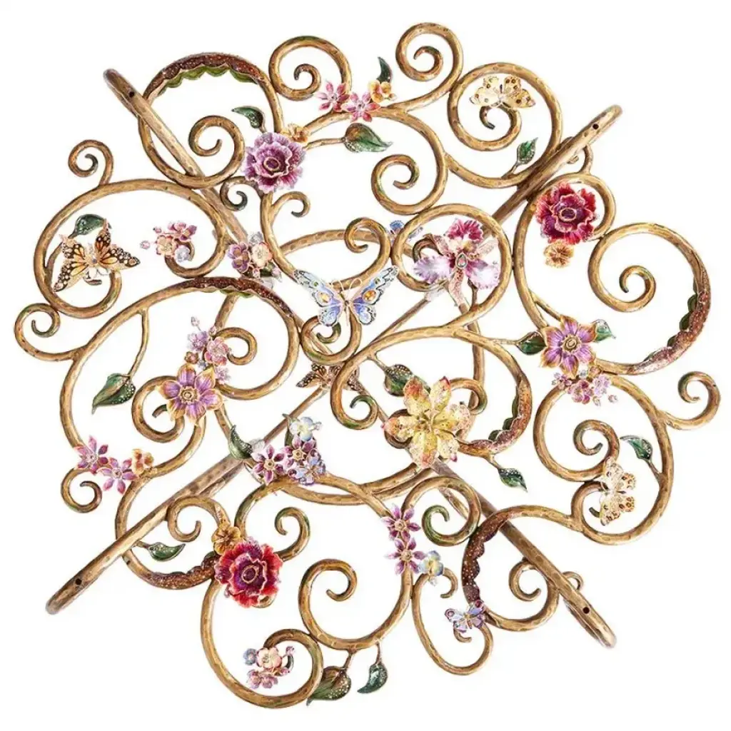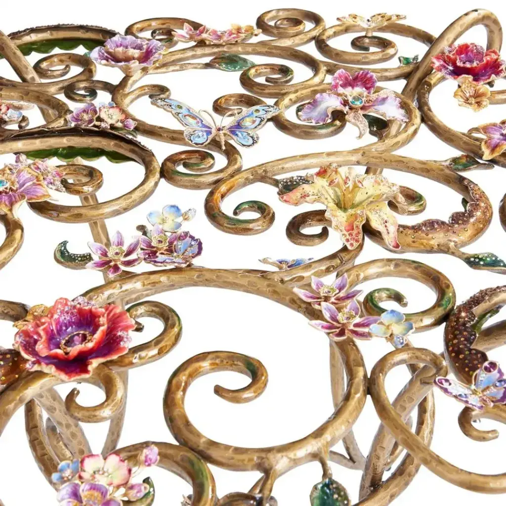 The Sophia Floral Dining Table began at a specialized foundry in Asia where iron rods are hammered, curled, and soldered to form the elaborate top and graceful curved legs. In Rhode Island, individual orchid, peony, tulip, and butterflies are casted in pewter and finished in 14K gold. The Jay Strongwater artisans in Rhode Island paint the garden palette of 23 enamel colors, highlighted with hand-set Swarovski crystals. Our finest artisans bring all the elements together to make each dining table, a fascinating composition of flora under the beveled glass top.