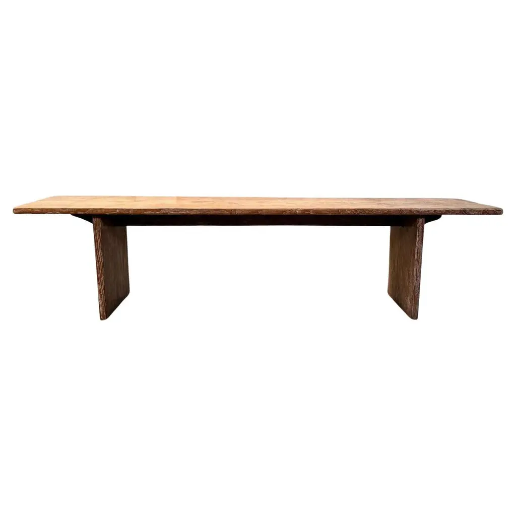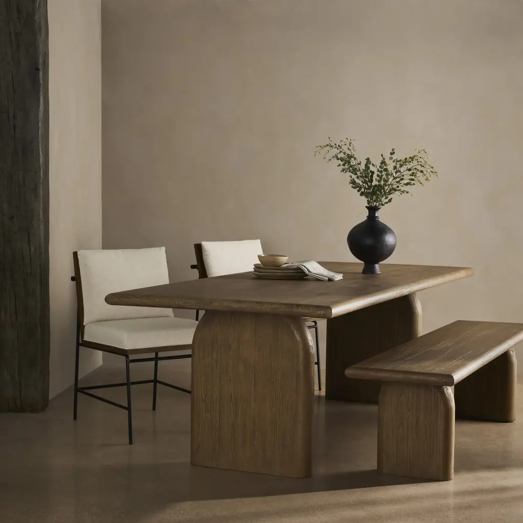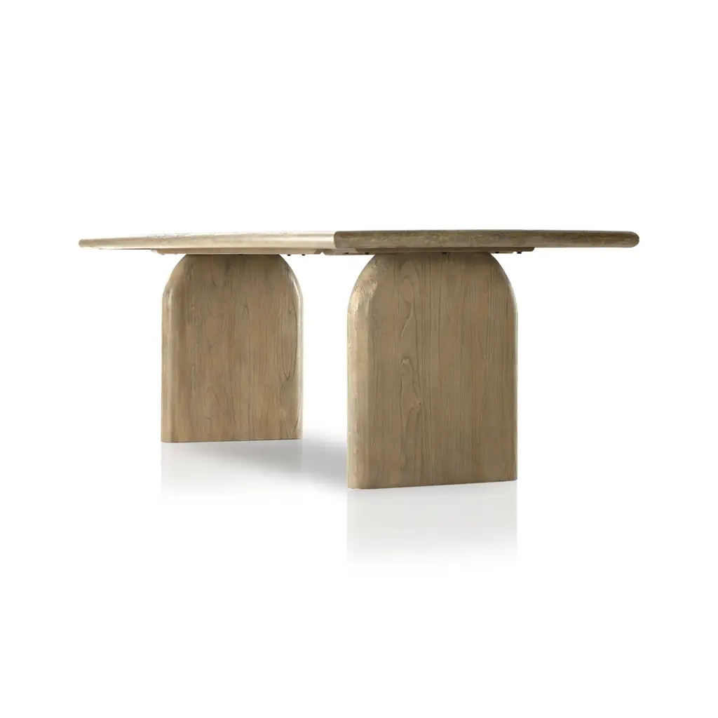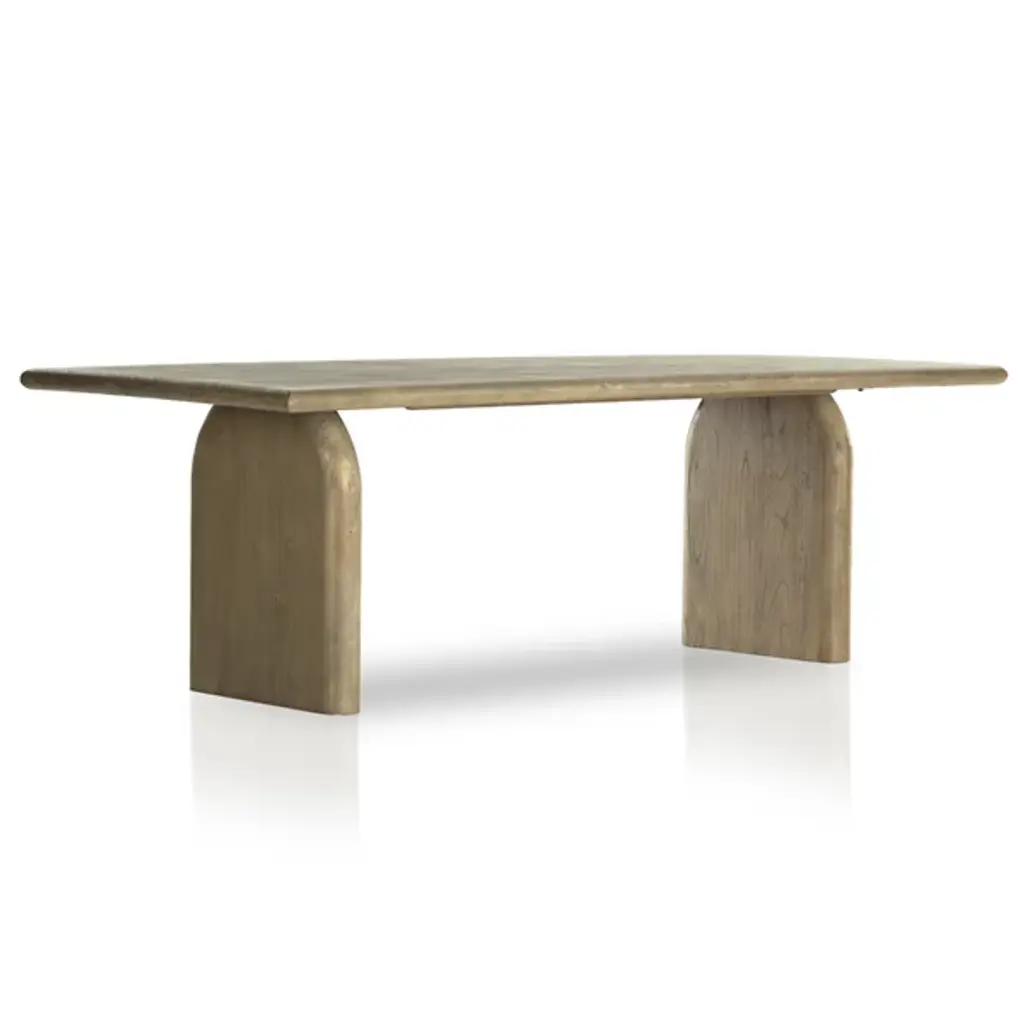 Clean edging and soft curves spur a remarkable contrast. Solid aged grained Mindi forms an open, minimalist-minded dining table with grand proportions above arched bases. Seats 8-10 comfortably. Features