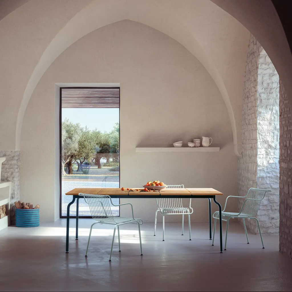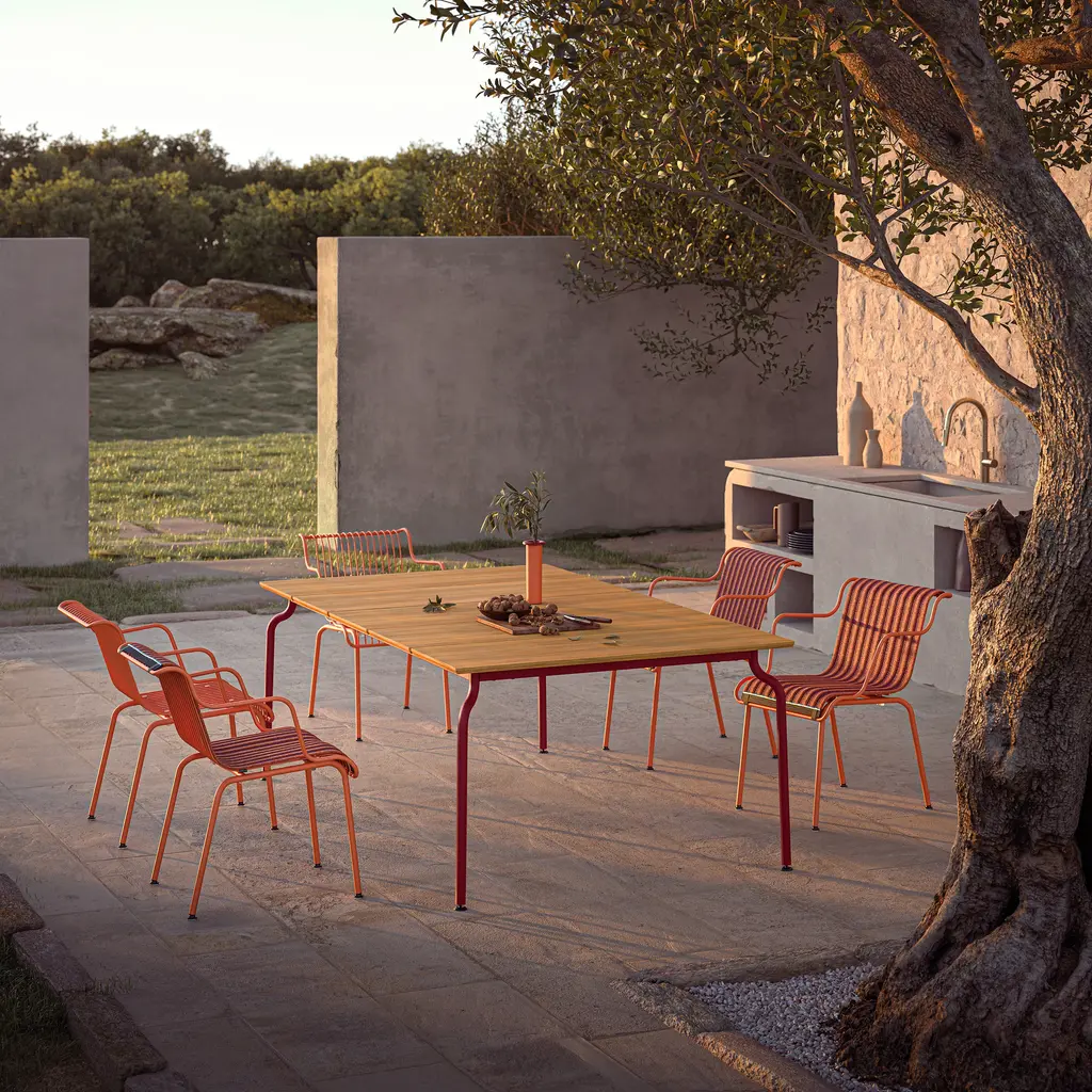 A stunning anchor for any outdoor dining destination, the South Outdoor Teak Dining Table from Magis is ready to host dinner parties and casual meals alike. Boasting a spacious teak tabletop, suitable for seating up to eight people, this durable design features subtle curved legs for a hint of contrast and visual appeal. Pair with the coordinating dining chairs for a cohesive spot to dine and relax. Highlights