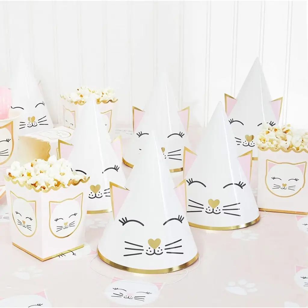 These paper party hats feature a cute cat printed on each and are ideal for birthday parties and events. Party cone hats are shipped flat for easy transportation and are quick and easy to assemble. Hand them out to guests as they arrive, place on the dining tables or throw them in goody bags as cat party favors.
