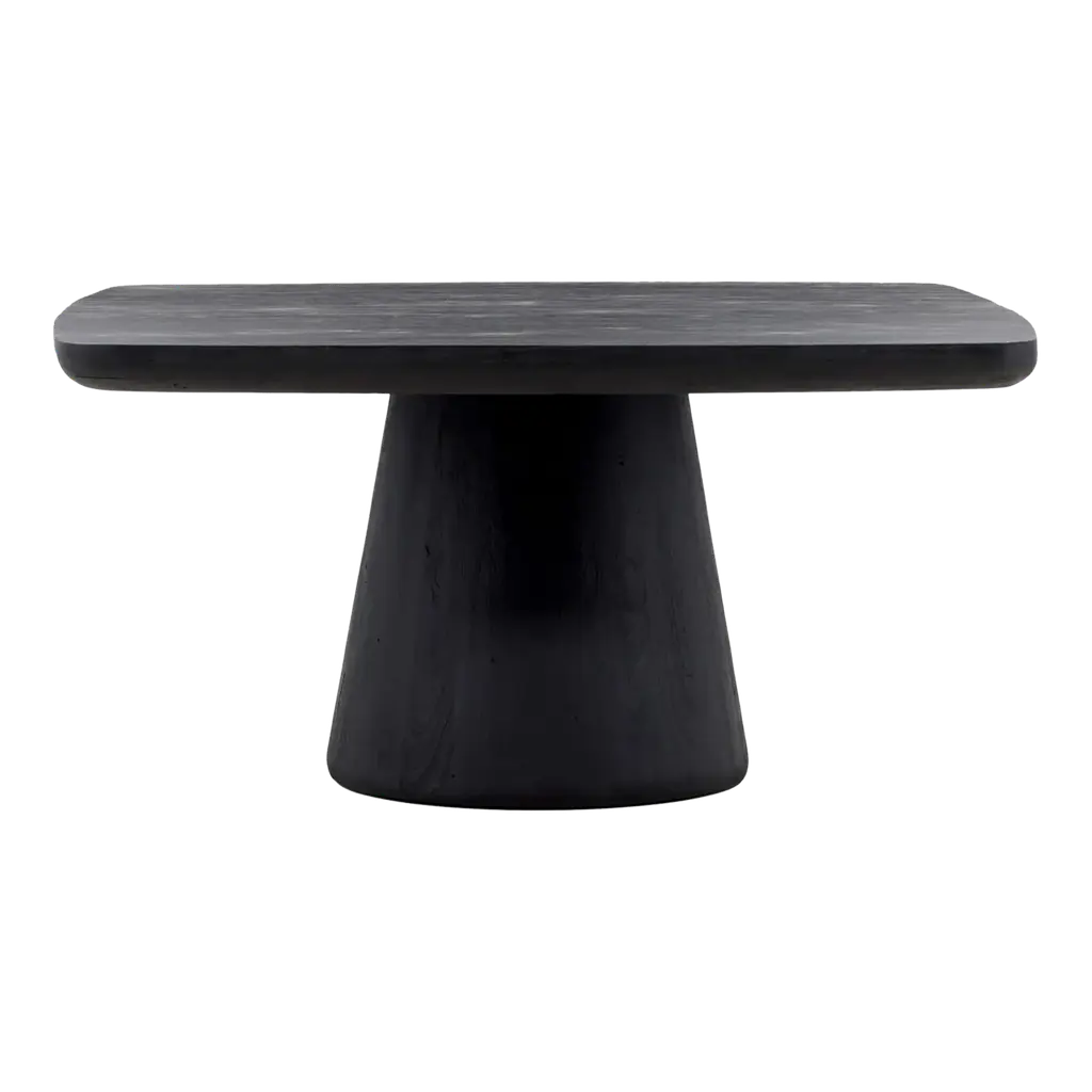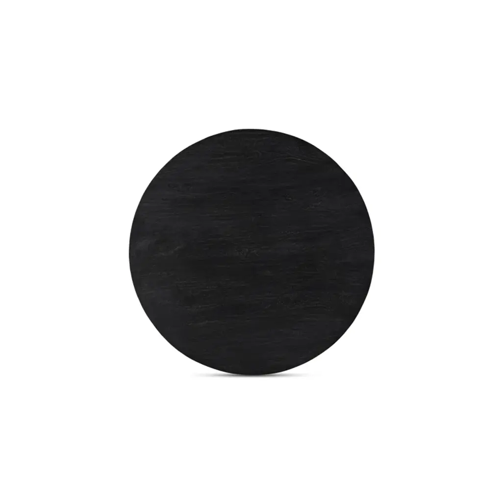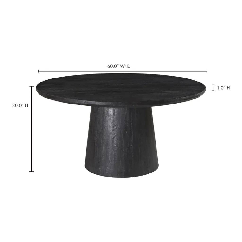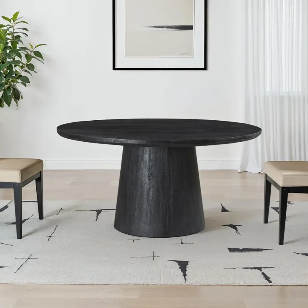 This round dining table is a striking addition to any small living space or condo, boasting a bold black finish that highlights the natural wood grain. Crafted from solid mango wood, the sandblasted, cerused finish adds an organic touch to its modern rustic style. With seating for four, it's perfect for intimate gatherings and family dinners. The oversized, tapered pedestal base provides a solid foundation, making a dramatic statement in your dining area.