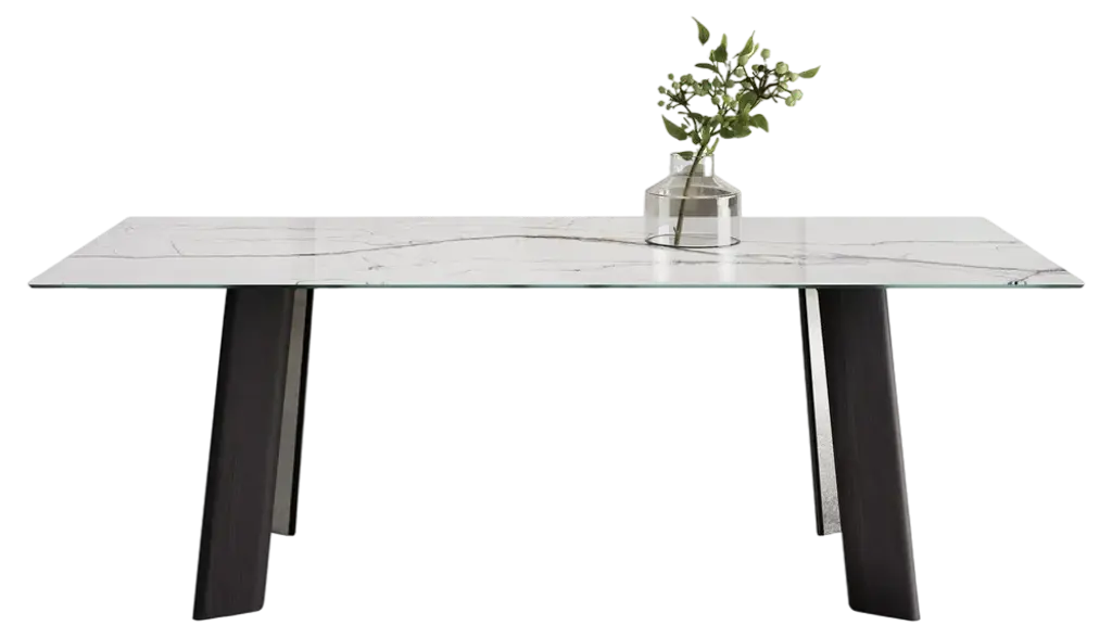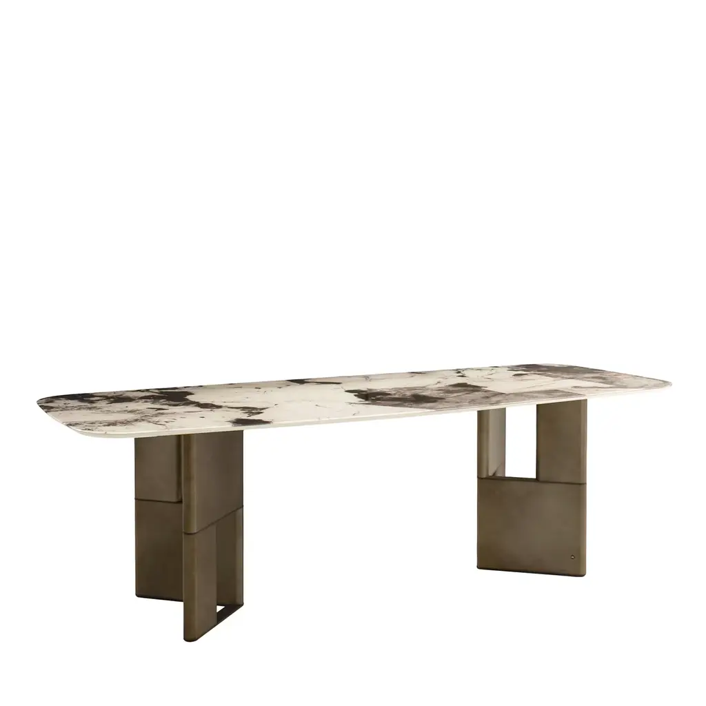The Spello table – two sculptural bases in painted metal – spells unmistakable personality. The source of inspiration is brutalism, an architectural and artistic movement known for its rugged, raw shapes and robust structures. Contrasting the severity of the support base is the poetic texture of the solid wood top, played up by the design of the boards that echo the noble tradition of inlay work and by a subtle opening that runs the length of the top. Available only in rectangular version, the Spello table comes veneered in Canaletto walnut, ash or ebony, in a choice of stains. It is also available in a version with an array of marble top choices.TECHNICAL SPECIFICATIONSFrame in metal epoxy powder coated available in color: white 100 – pearl beige 130 – cream white 150 – white mat 160 – cream colour 205 – wine red405 – kaki green 705 – umbra grey 720 – pearl mouse grey 740 – brown grey 805 – bronzed 820 - black 900 - burnished Top in wood canaletto walnut, canaletto walnut extra, canaletto walnut stained coffee. ashwood stained teak, stained ebony, stained wenge, stained cherry, stained walnut , stained coffee, stained brown. also available with marble glossy white carrara, glossy black marquinia, glossy calacatta oro, mat calacatta oro, glossy emperador, mat emperador. Art.”25287” not available with marble emperador.MATERIALS Frame: metal finishes Top: marble finishes - wood finishes