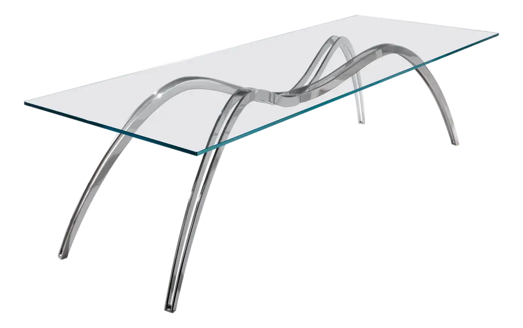 The Spider dining table is made of mirror-polished stainless steel, and the tabletop is in extra-clear crystal glass. Limited Edition of 15. Each table is hand-signed, numbered by the artists (engraved) and 100% handmade in Italy. The fascinating projection of the spider’s shadow gave inspiration for this table. Starting from a shadow, uncatchable and vanishing, to achieve the zoomorphic structure. The artworks by Barberini & Gunnell are regularly shown at international art fairs.
