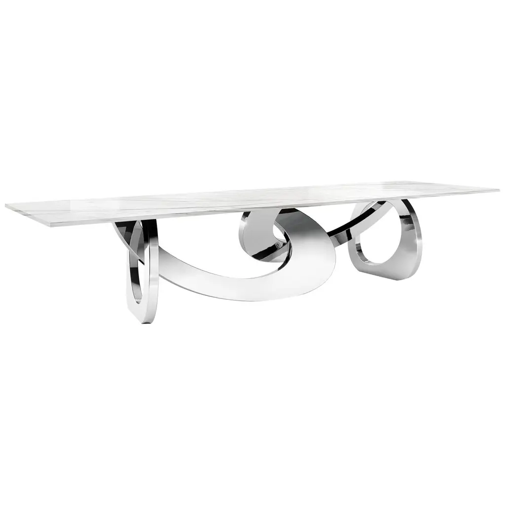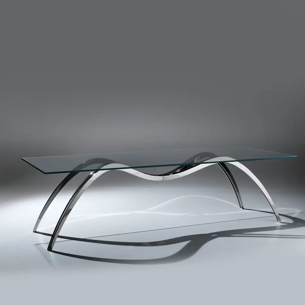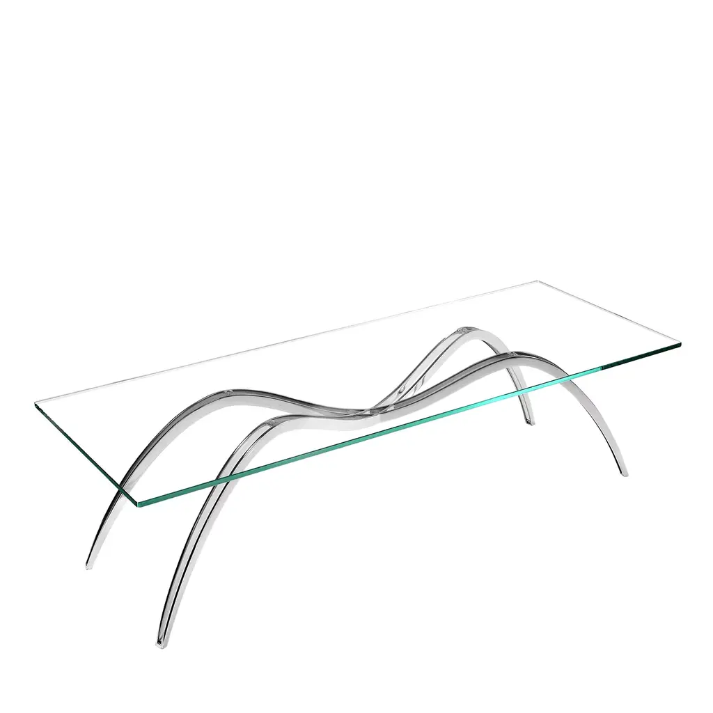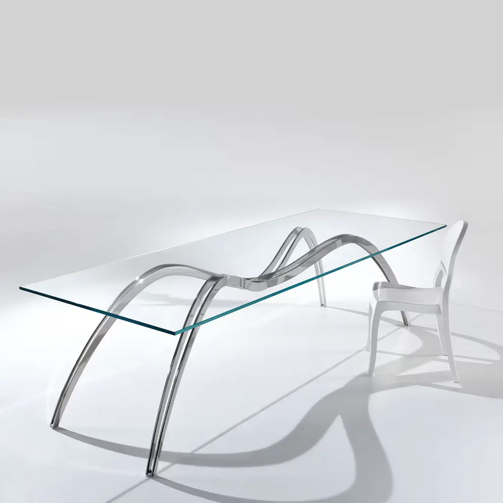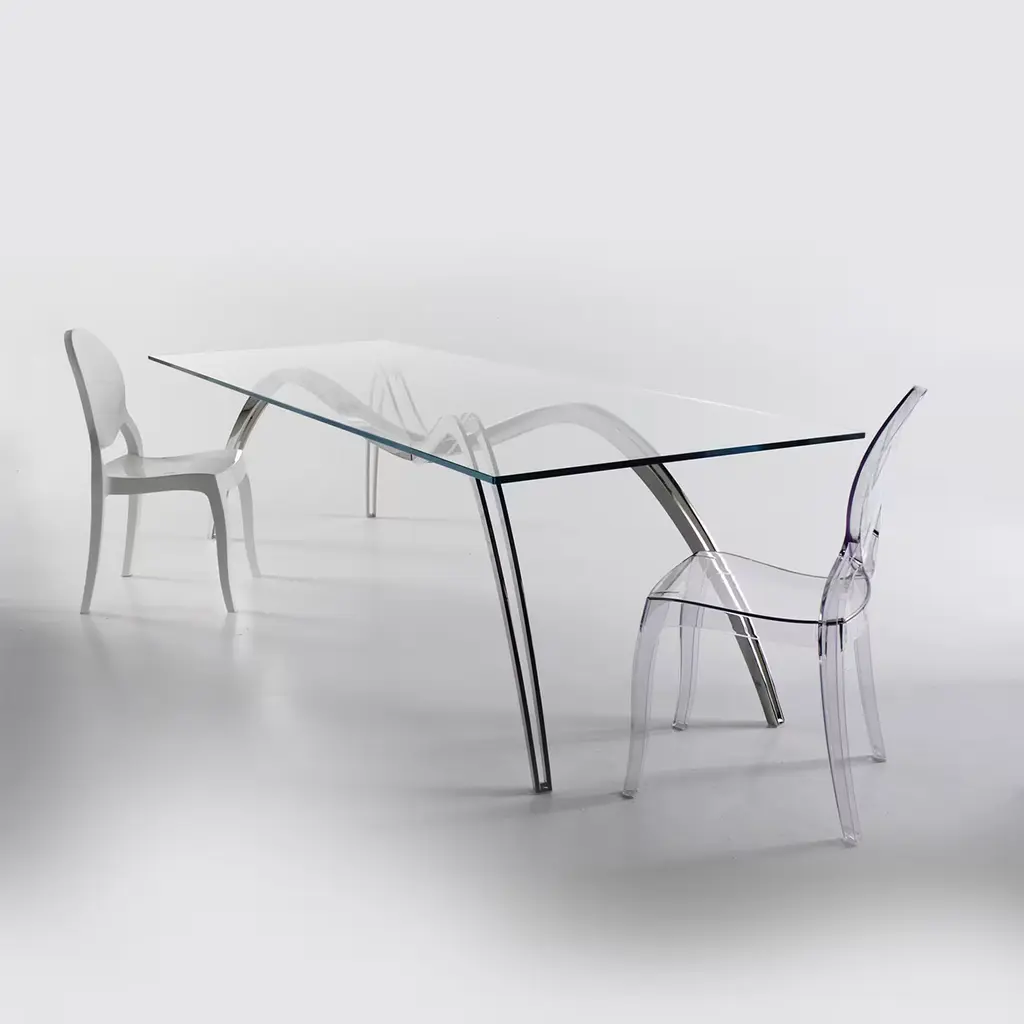 The Spider Skeleton dining table is made of mirror-polished stainless steel, and the tabletop is in extra-clear crystal glass. Limited Edition of 15. Each table is hand-signed, numbered by the artists (engraved) and 100% handmade in Italy. The fascinating projection of the spider’s shadow gave inspiration for this table. Starting from a shadow, uncatchable and vanishing, to achieve the zoomorphic structure. The artworks by Barberini & Gunnell are regularly shown at international art fairs.