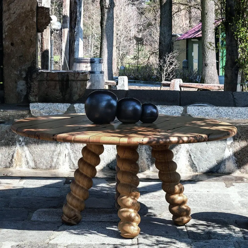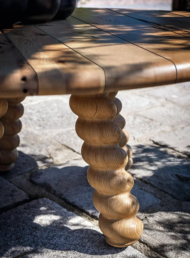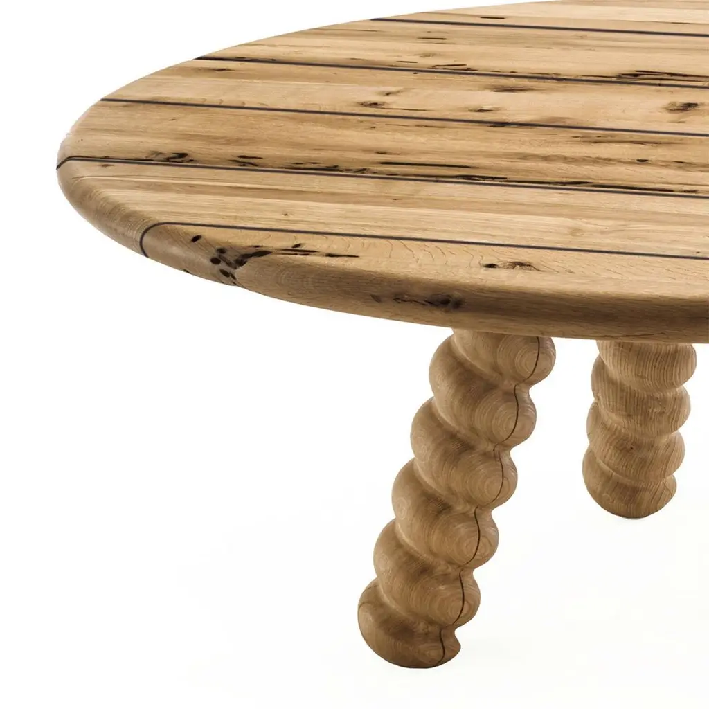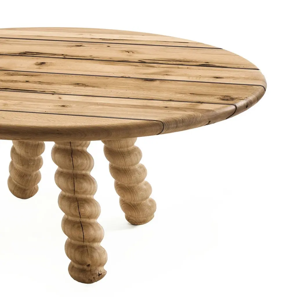 Dining table spirale with all structurein solid raw oak. Table top made with solidraw oak slats.Diameter 200xH75cm, price: 18900,00€.Also available in:Diameter 180xH75cm, price: 16900,00€.Diameter 160xH75cm, price: 14500,00€.