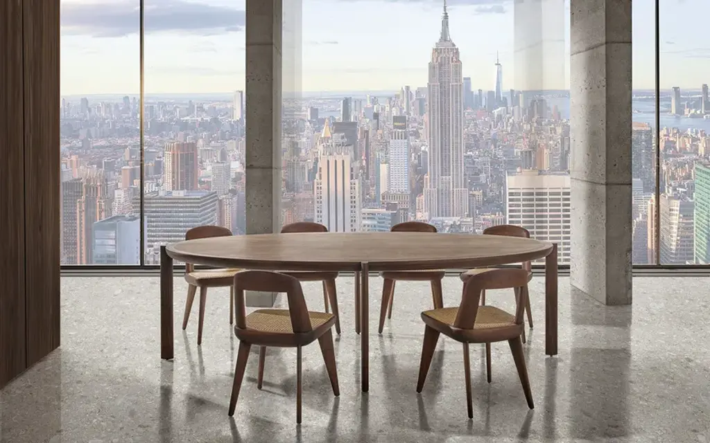 Spoke is a dining table made of bent and laminated solid wood that is sculpted to create a disappearing edge.Ebonized Ash A-EBOak O-NARaw Effect Oak O-REBlack Walnut Oil W-BOWalnut W-NAWhite Ash A-BLThe BassamFellows Spoke Table was originally commissioned by a large Australian architecture firm who were looking for the perfect wooden table that would complement other pieces from the BassamFellows collection. Evocative of simple geometric line drawings, the table features a large wooden ring supported by three spokes, which connect seamlessly to the outer edges. The perfect timber circle - the work of the company’s master craftsmen - emphasizes the wood’s grain, producing a compelling concentric effect best admired through a glass top. The table’s elliptical legs achieve a slim, tapered silhouette which balances the top’s sense of bold geometry. With no hard edges, the legs can appear wide or thin, depending on the angle in which you consider them. The result is a piece that balances heft and levity, an elegant and versatile table that marries architectural precision with timeless craftsmanship.