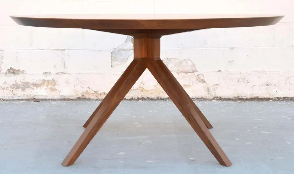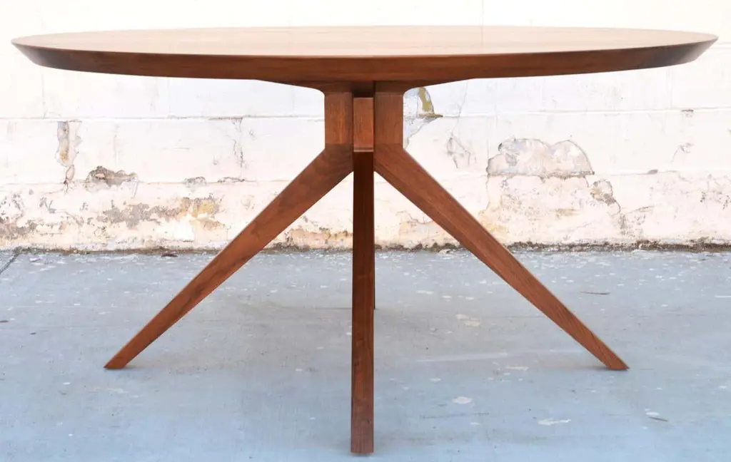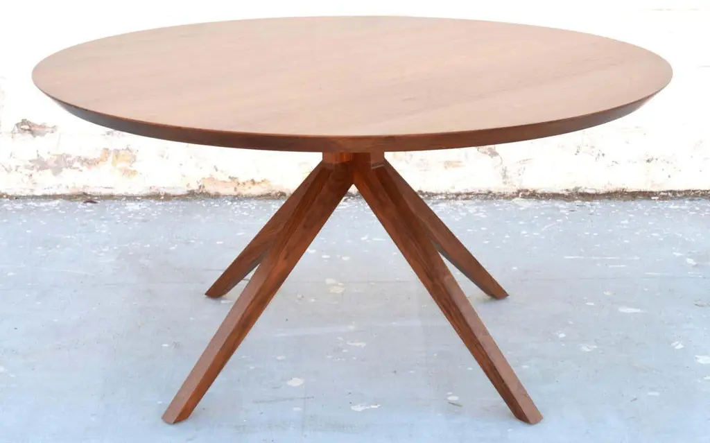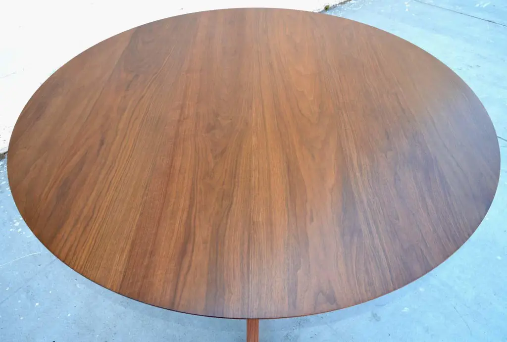 Custom dining table in solid walnut. Shown here in in a 60" diameter and low sheen lacquered finish.