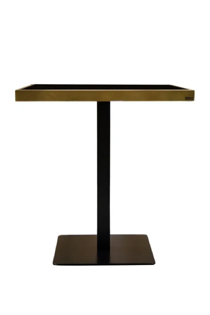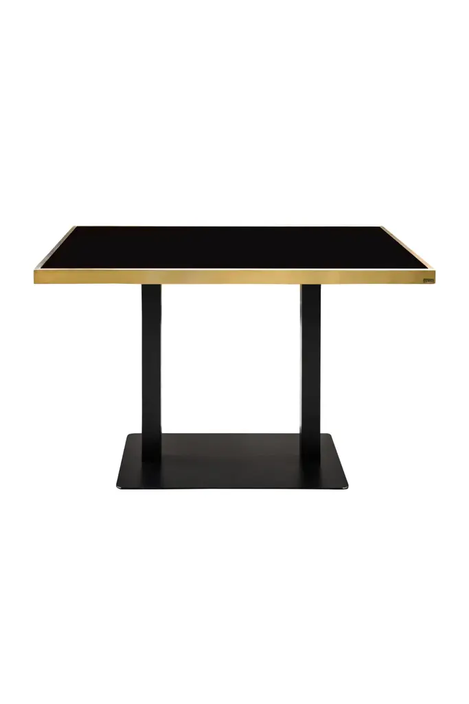 Elevate your dining space with Versmissen's Germain Dining Table, where style meets function, creating the perfect backdrop for stylish dining and cherished moments. Its square black glass tabletop adorned with a brushed gold rim exudes opulence and contemporary flair. The sturdy black pedestal base provides stability and a chic design.