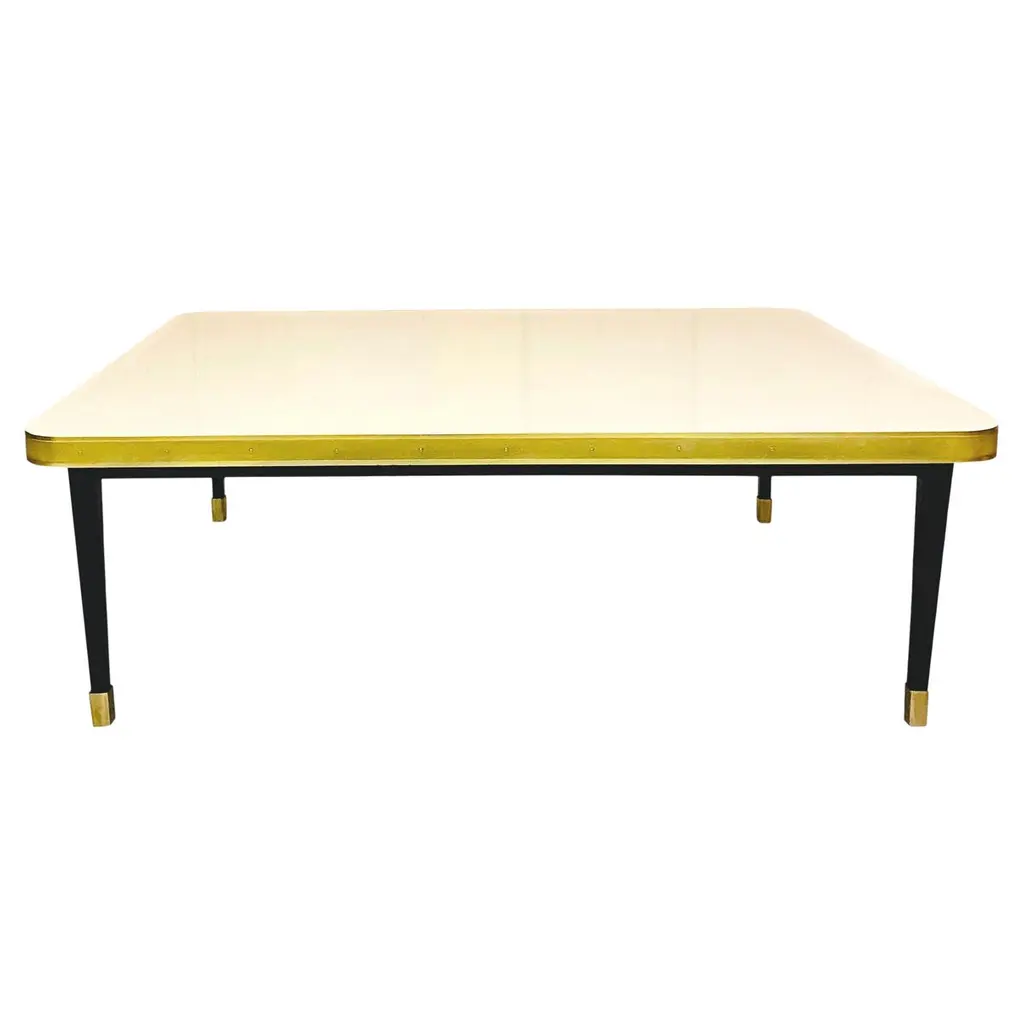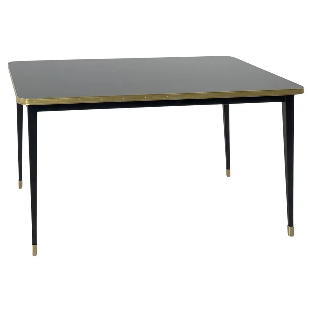 Julieta Collection. Table with Black Steel Conical Legs with Brass Bottom End Table Top on High Gloss Laminate Brass Tape Frame.Introducing the stunning dining room table with black powder-coated steel construction, boasting sleek conical legs with brass accents at the bottom. The table top features a high gloss laminate finish, available in a variety of colors to suit your taste and style. The mid-century modern influence is evident in the brass tape frame that adds a touch of sophistication and elegance.This exquisite table is perfect for various settings, including hospitality venues such as hotels, restaurants, and bars, as well as offices or private residences. Designed and fully manufactured in Spain, each piece is meticulously crafted to order, ensuring exceptional quality and attention to detail.The conical legs not only provide stability but also add a touch of contemporary flair, making this dining room table a statement piece in any space. The black powder coating on the steel gives it a sleek and modern look that complements the overall design. The brass accents on the legs add a touch of opulence, elevating the table's aesthetic appeal.The table top is made from high gloss laminate, which not only adds durability but also gives it a lustrous finish that catches the eye. The multiple color options for the table top allow you to choose the perfect hue to match your interior decor. The brass tape frame adds a touch of timeless elegance and serves as a visual highlight that sets this table apart.With its unique blend of mid-century modern style, meticulous craftsmanship, and versatility, this dining room table is a true masterpiece that exudes sophistication and style. Whether it's for entertaining guests in a chic restaurant or adding a touch of elegance to your private residence, this table is sure to make a statement in any setting. Don't hesitate to inquire about specific dimensions, as each piece is made to order, ensuring a perfect fit for your space. Elevate your dining experience with this exceptional dining room table with conical legs, designed to impress and built to last.