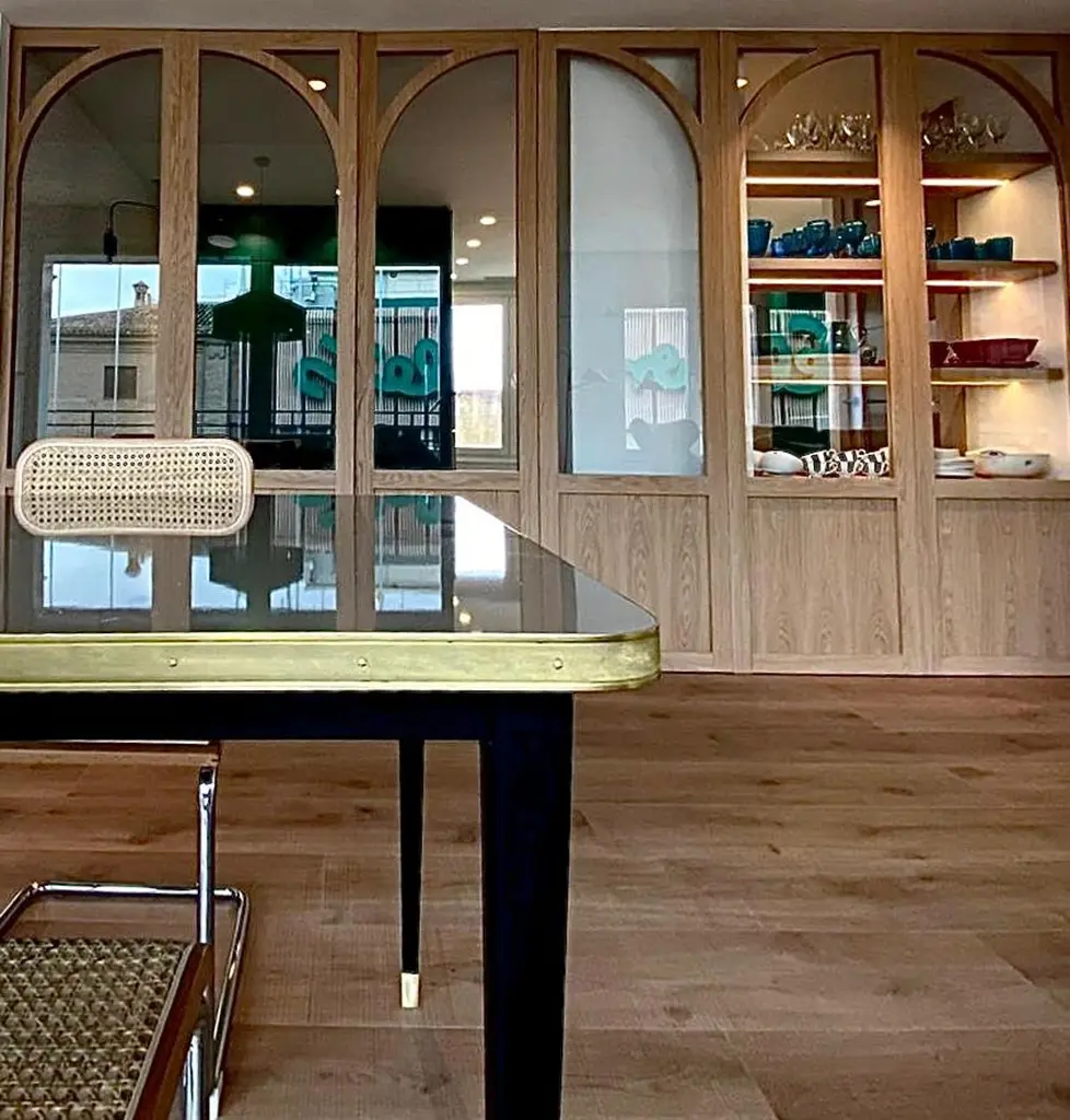 Julieta Colection. Table with Black Steel Conical Legs with Brass Bottom End Table Top on High Gloss Laminate Brass Tape FrameIntroducing the stunning dining room table with black powder-coated steel construction, boasting sleek conical legs with brass accents at the bottom. The table top features a high gloss laminate finish, available in a variety of colors to suit your taste and style. The Mid-Century Modern influence is evident in the brass tape frame that adds a touch of sophistication and elegance.This exquisite table is perfect for various settings, including hospitality venues such as hotels, restaurants, and bars, as well as offices or private residences. Designed and fully manufactured in Spain, each piece is meticulously crafted to order, ensuring exceptional quality and attention to detail.The conical legs not only provide stability but also add a touch of contemporary flair, making this dining room table a statement piece in any space. The black powder coating on the steel gives it a sleek and modern look that complements the overall design. The brass accents on the legs add a touch of opulence, elevating the table's aesthetic appeal.The table top is made from high gloss laminate, which not only adds durability but also gives it a lustrous finish that catches the eye. The multiple color options for the table top allow you to choose the perfect hue to match your interior decor. The brass tape frame adds a touch of timeless elegance and serves as a visual highlight that sets this table apart.With its unique blend of Mid-Century Modern style, meticulous craftsmanship, and versatility, this dining room table is a true masterpiece that exudes sophistication and style. Whether it's for entertaining guests in a chic restaurant or adding a touch of elegance to your private residence, this table is sure to make a statement in any setting. Don't hesitate to inquire about specific dimensions, as each piece is made to order, ensuring a perfect fit for your space. Elevate your dining experience with this exceptional dining room table with conical legs, designed to impress and built to last.